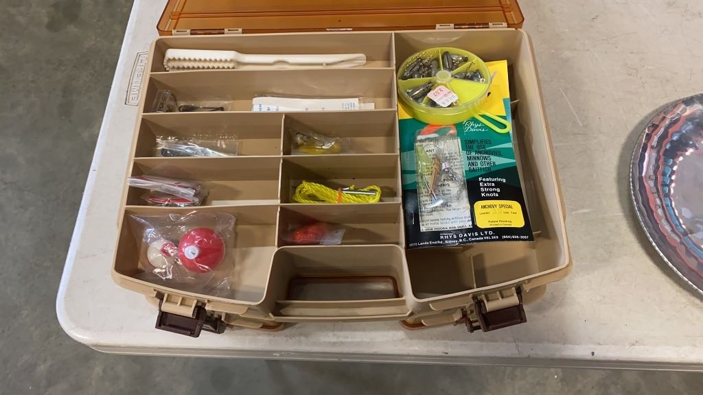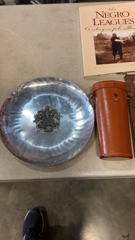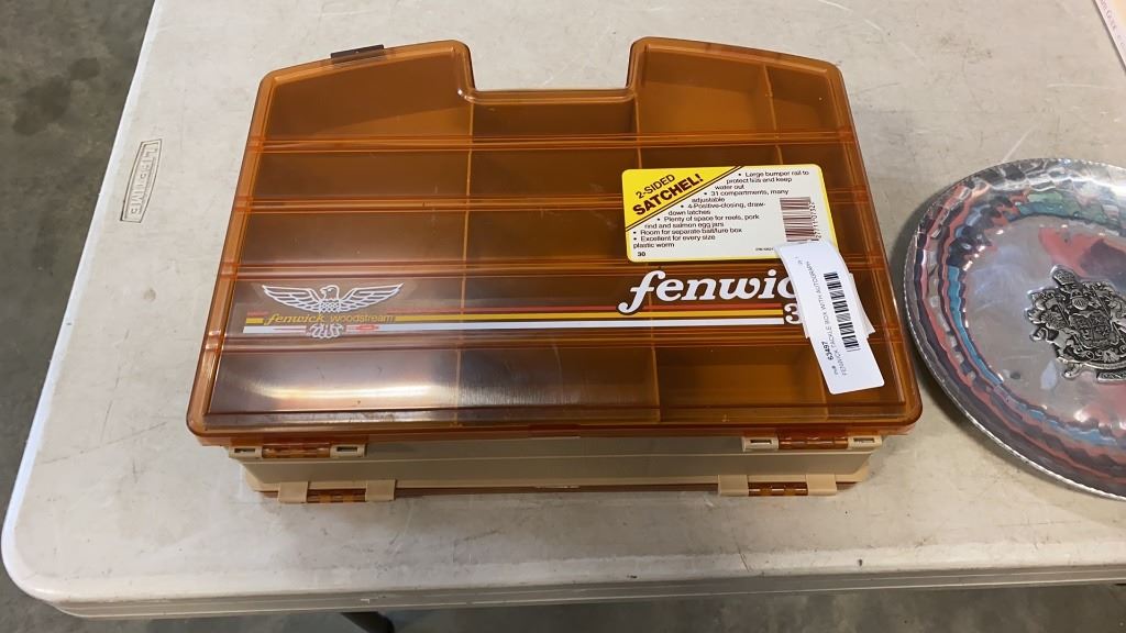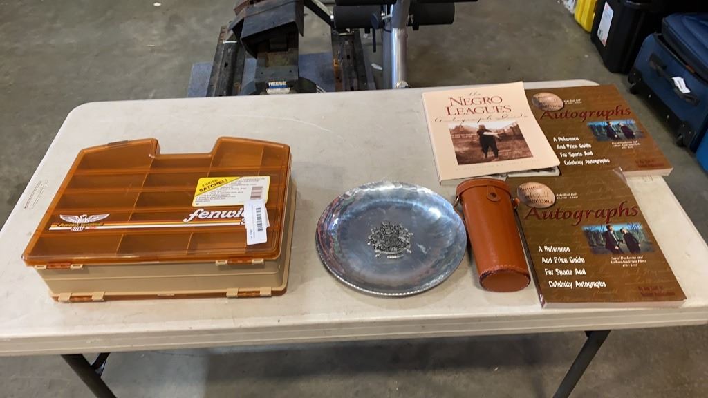 FENWICK TACKLE BOX WITH AUTOGRAPH BOOKS, MINI TELESCOPE AND PLATE