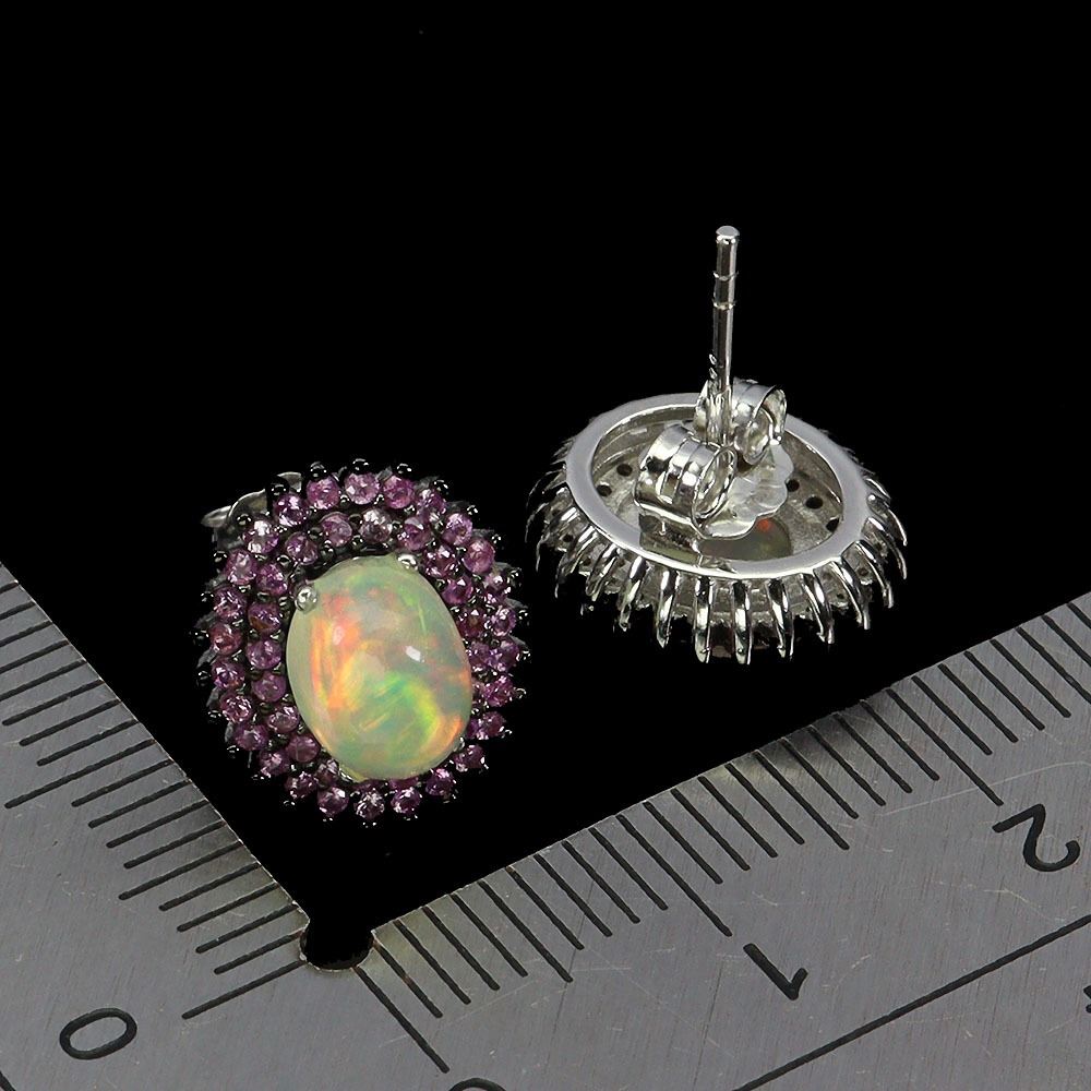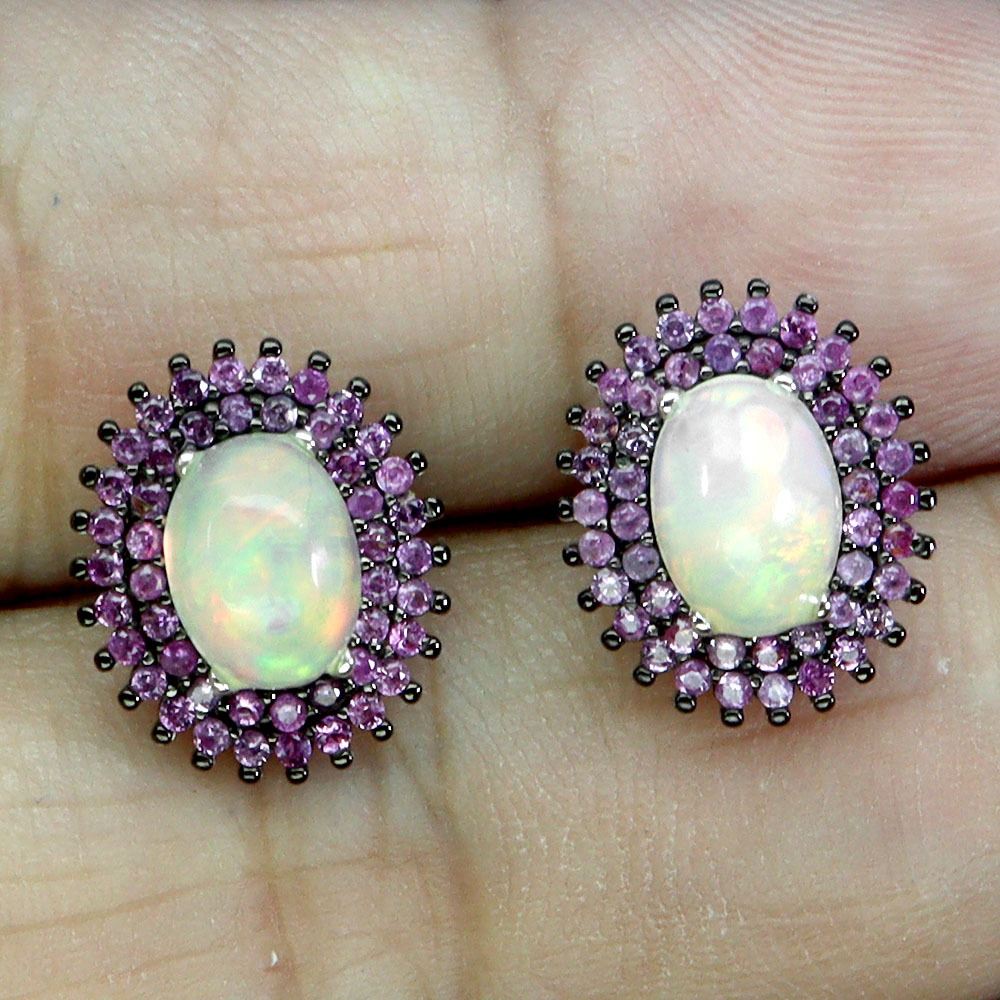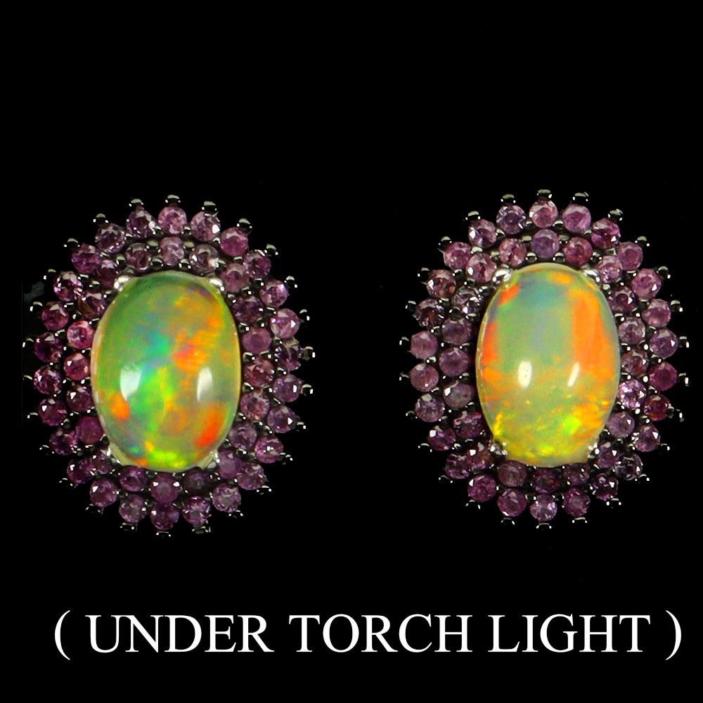 FIRE OPAL AND SAPPHIRE EARRINGS IN 14K WHITE PLATED GOLD OVER 925 STERLING SILVER - APPRAISED REPLACEMENT VALUE