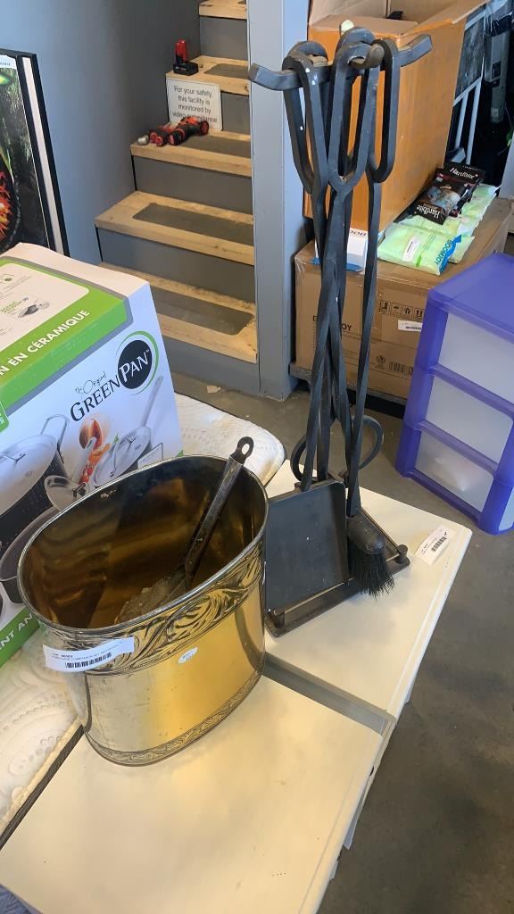 FIREPLACE COMPANION SET AND BRASS PAIL