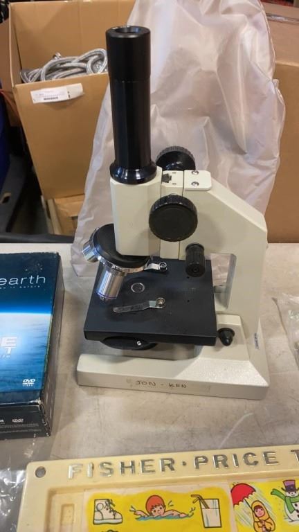 FISHER PRICE SCHOOL DAY DESK, PIN COLLECTION, PLANET EARTH DVD SET AND EASTERN ART AND NORTHWEST MICROSCOPE