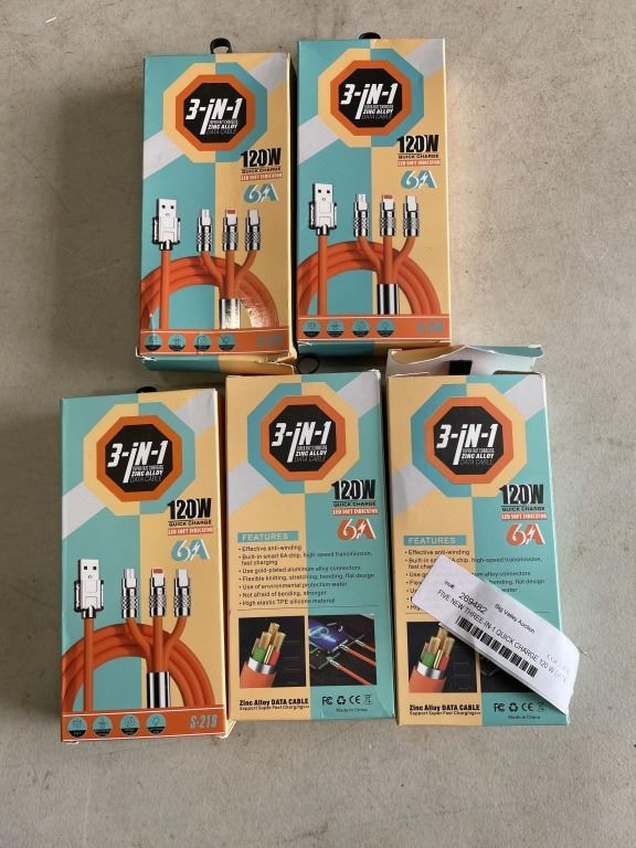 FIVE NEW THREE-IN-1 QUICK CHARGE 120 W DATA CABLES