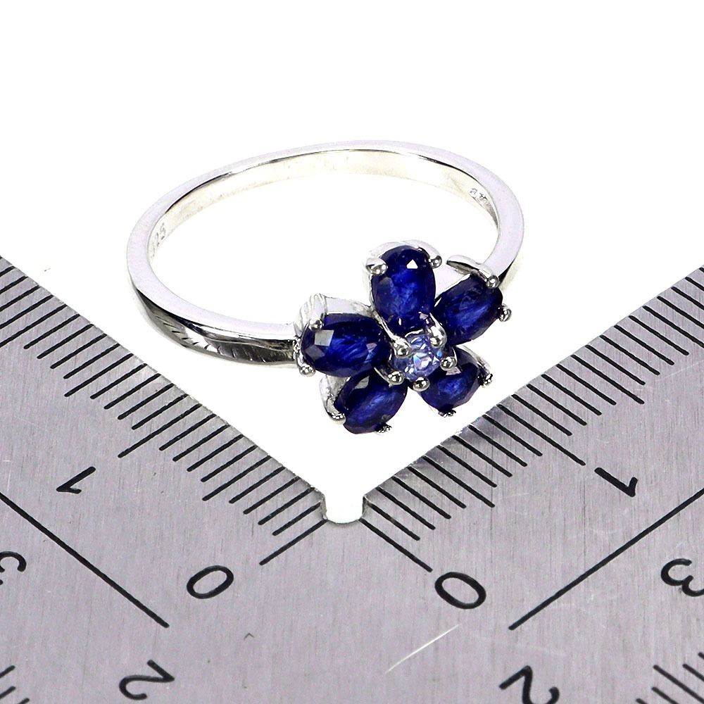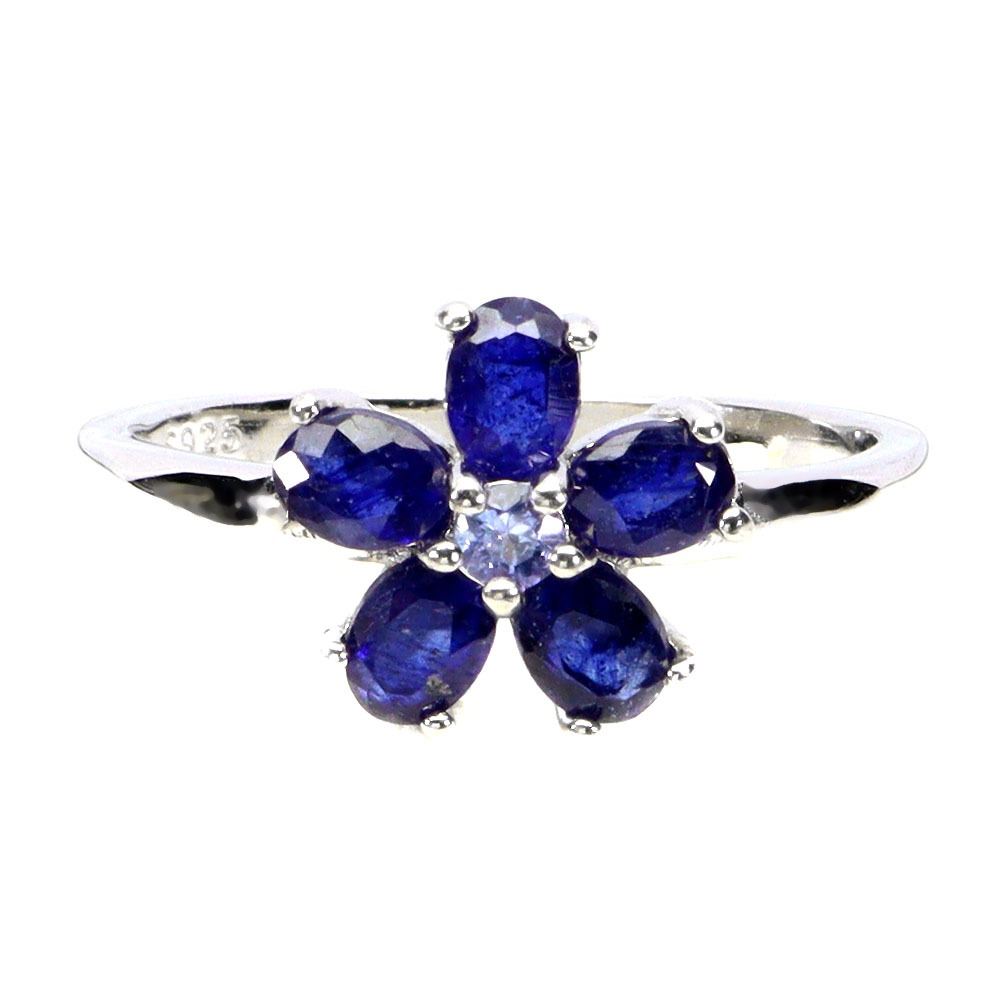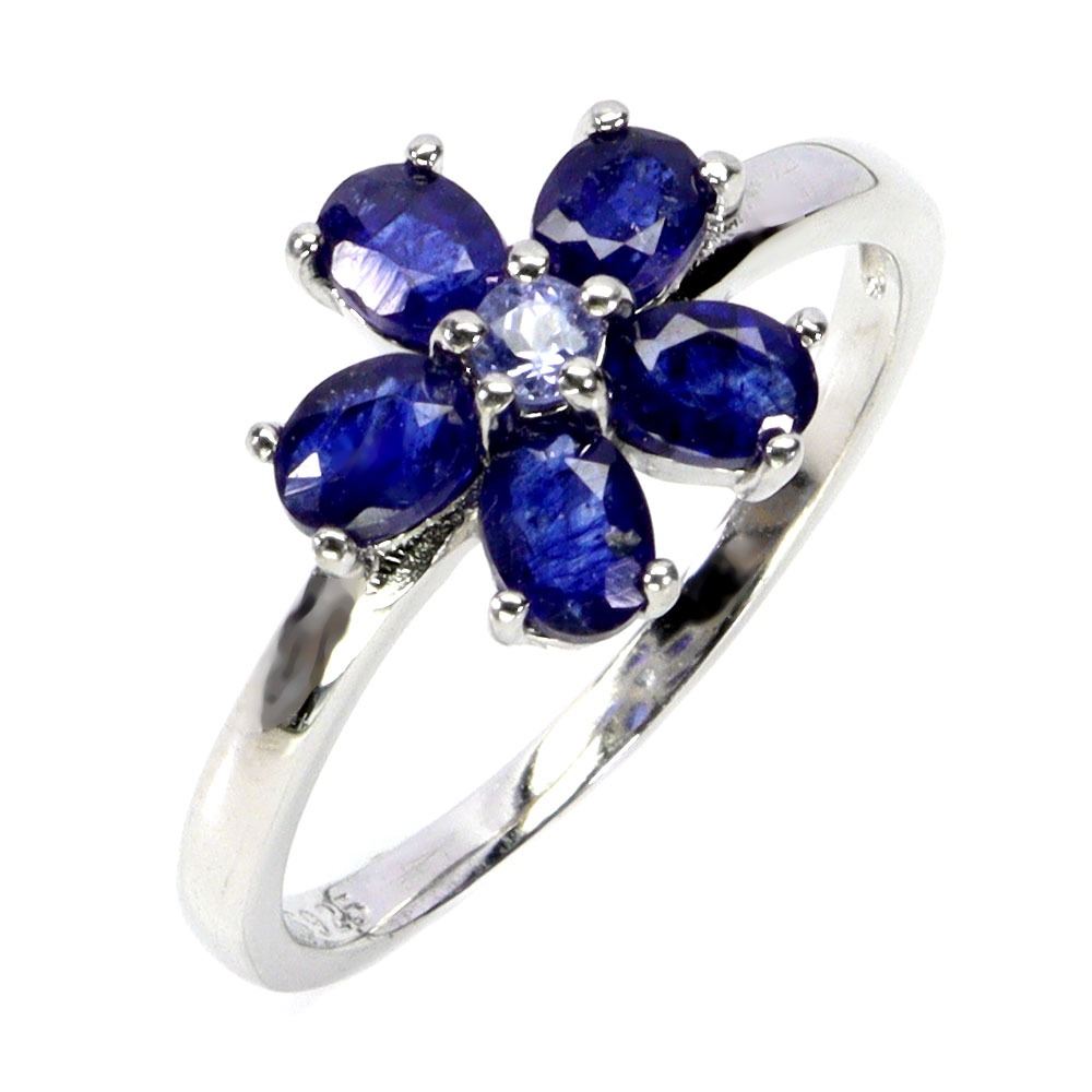 FLOWER SHAPED BLUE SAPPHIRE RING IN 14K WHITE PLATED GOLD OVER 925 STERLING SILVER – SIZE 7 - APPRAISED REPLACEMENT VALUE