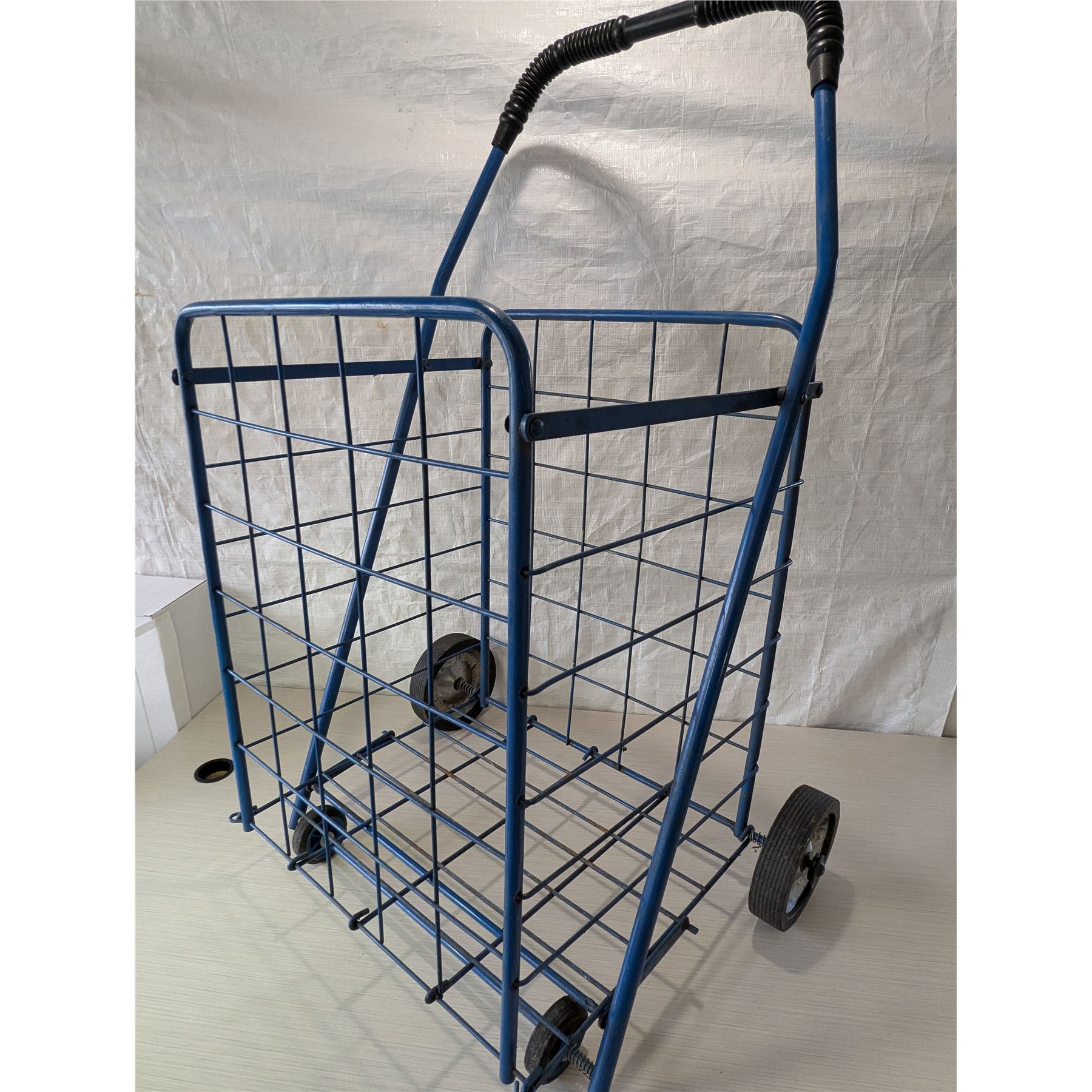 Transport groceries, supplies, sports gear, etc. Unit folds down nicely for flat storage 6" deep. Steel frame construction with blue powder coating. Rear wheels measure 5.5". Unit measures 18" wide x 25 deep x 21" high basket & 34" to the top of padded handle. Approximately 100lb capacity.
