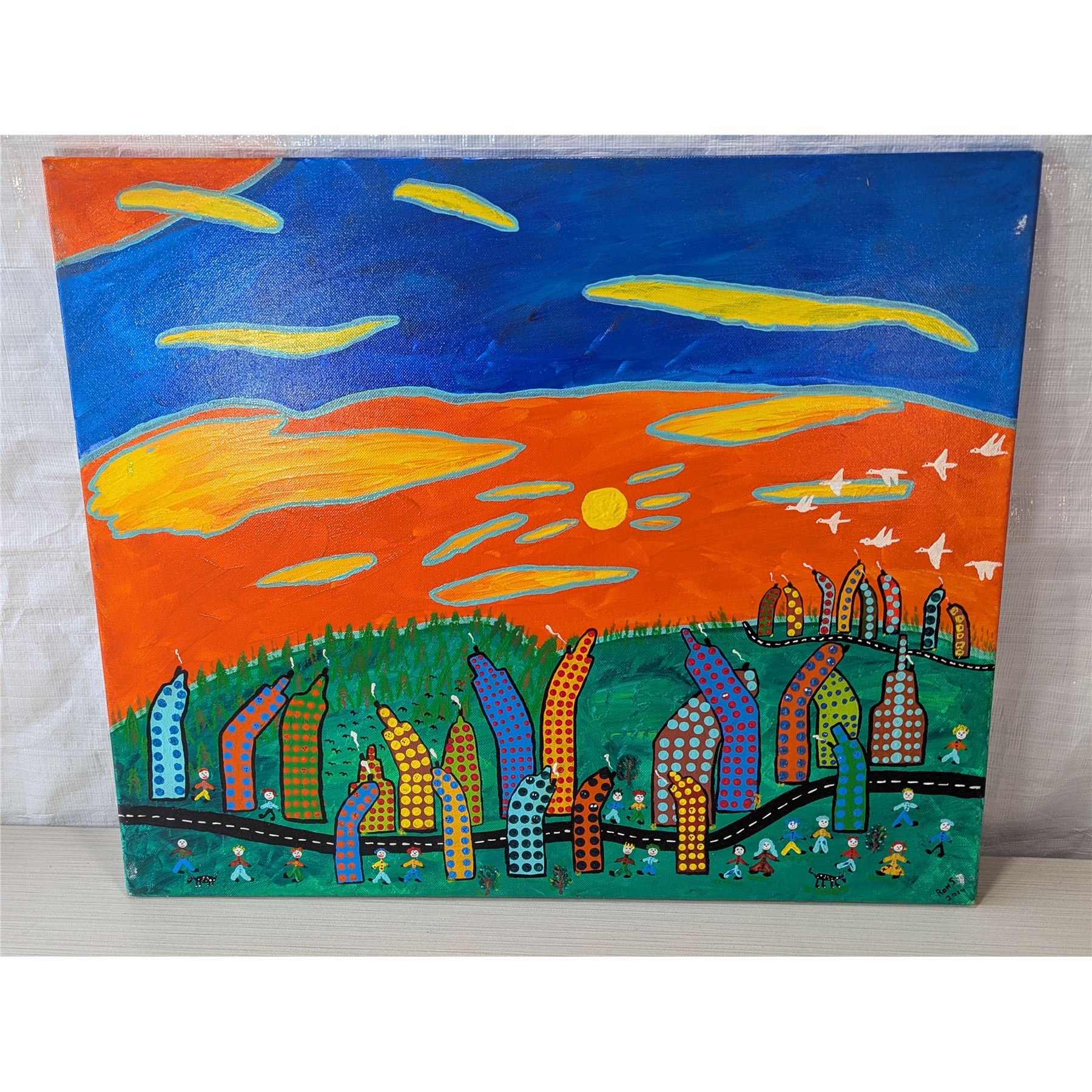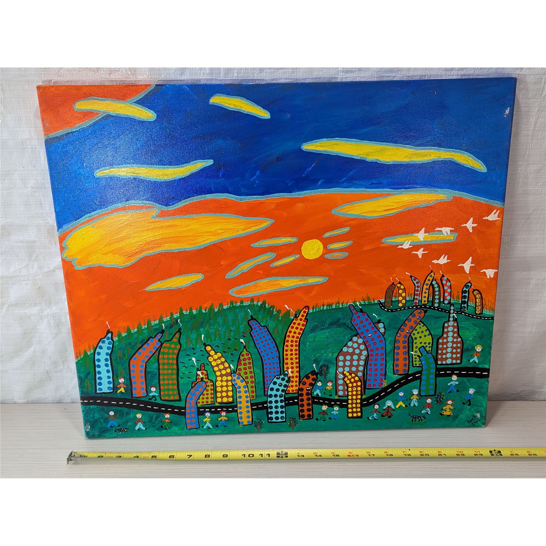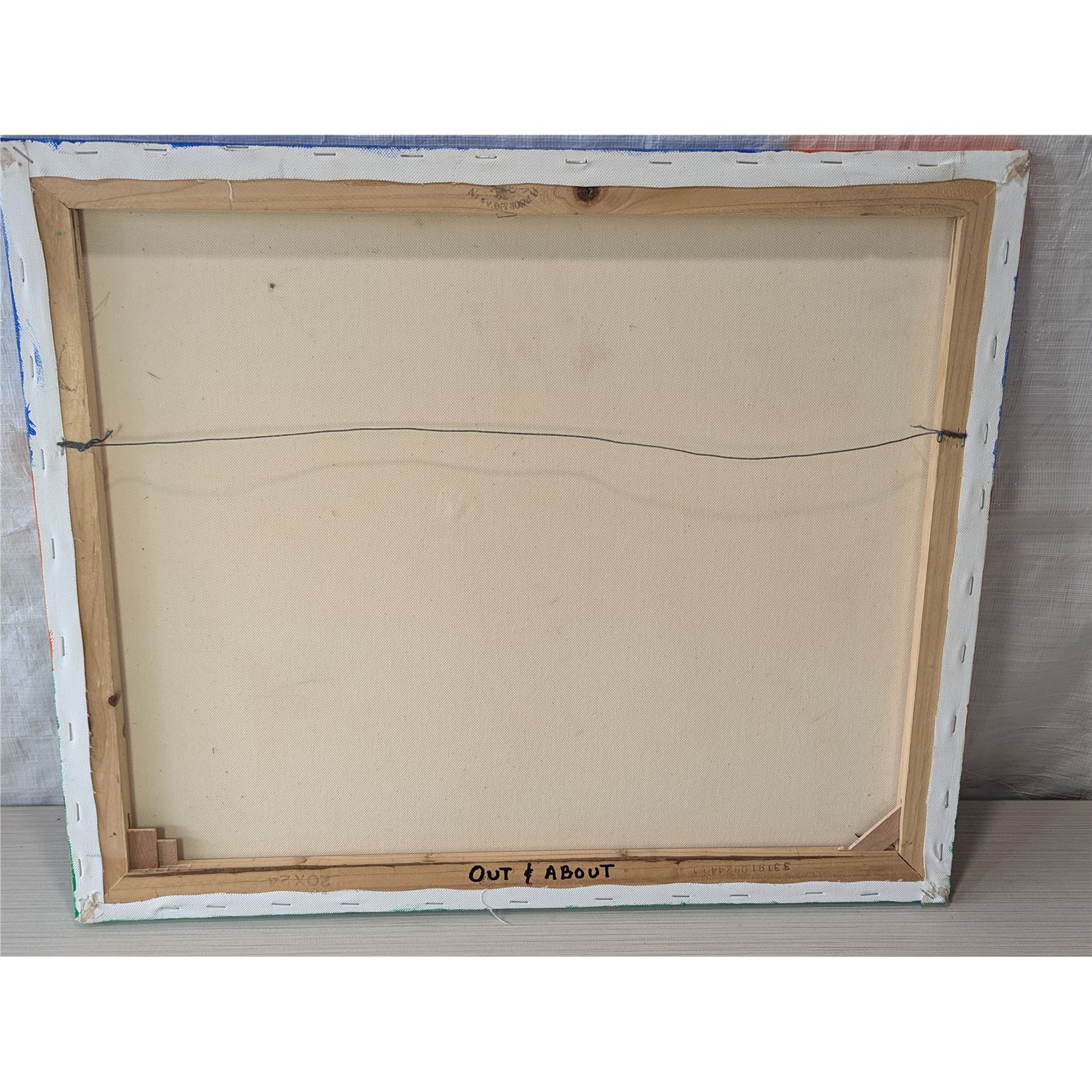 FOLK ART Ron Smallwood titled "Out & About" 2014 measures 24" x 20"