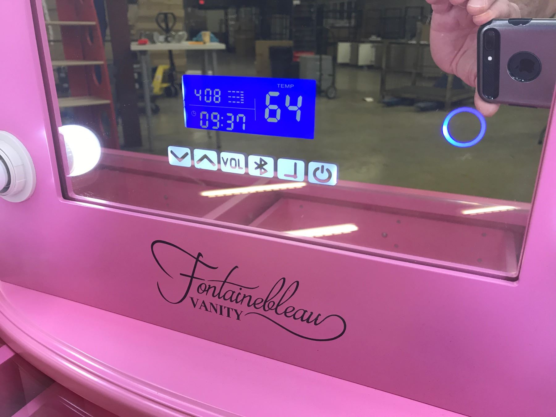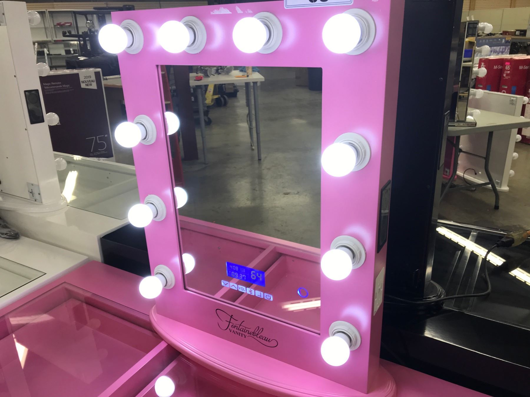 FONTAINEBLEAU "HOLLYWOOD" VANITY MIRROR WITH BLUETOOTH SPEAKERS, TOUCH CONTROLS, 10 DIMMABLE DAYLIGHT LED BULBS, 2 SIDE MOUNTED POWER OUTLETS, 2 USB OUTLETS, REMOVABLE BASE AND WALL MOUNTING POINTS ON REAR, 19.5" WIDE X 25.5" TALL X 3" DEEP (WITHOUT STAND), PINK BASE AND BORDER