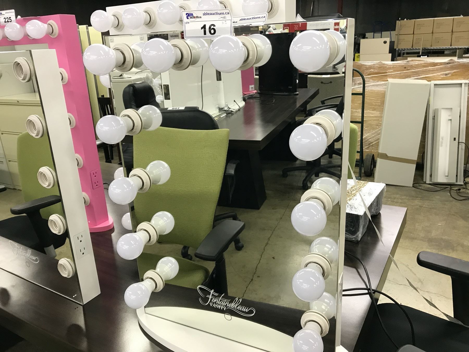 FONTAINEBLEAU VANITY MIRROR WITH TOUCH CONTROLS, 12 DIMMABLE DAYLIGHT LED BULBS, 2 SIDE MOUNTED POWER OUTLETS, REMOVABLE BASE AND WALL MOUNTING POINTS ON REAR, 19 3/4" WIDE X 27.5" TALL X 3" DEEP (WITHOUT STAND), SEAMLESS BORDER AND WHITE BASE