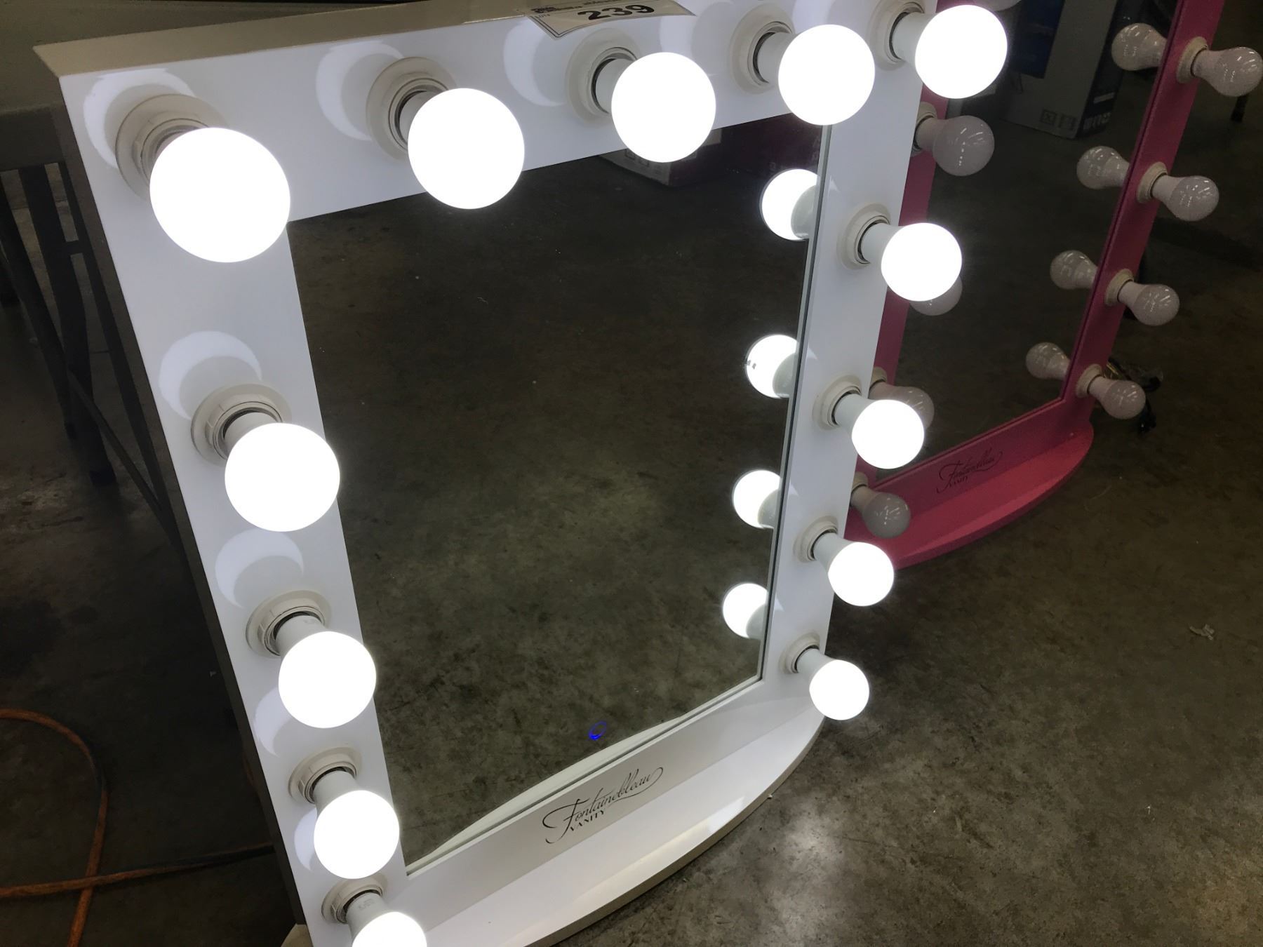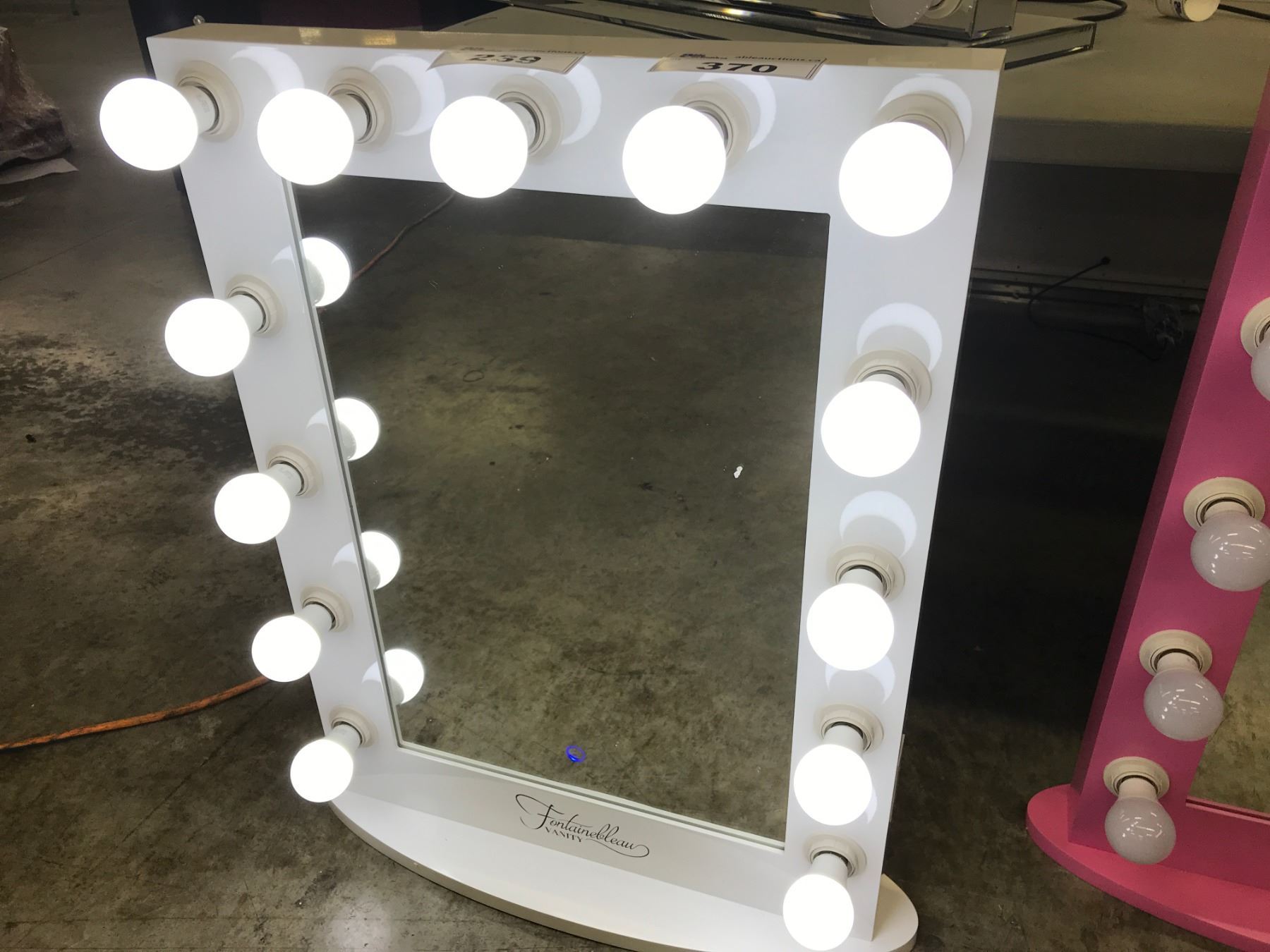 FONTAINEBLEAU VANITY MIRROR WITH TOUCH CONTROLS, 13 DIMMABLE DAYLIGHT LED BULBS, 2 SIDE MOUNTED POWER OUTLETS, REMOVABLE BASE AND WALL MOUNTING POINTS ON REAR, 23.5" WIDE X 31.5" TALL X 3" DEEP (WITHOUT STAND), WHITE BORDER AND BASE