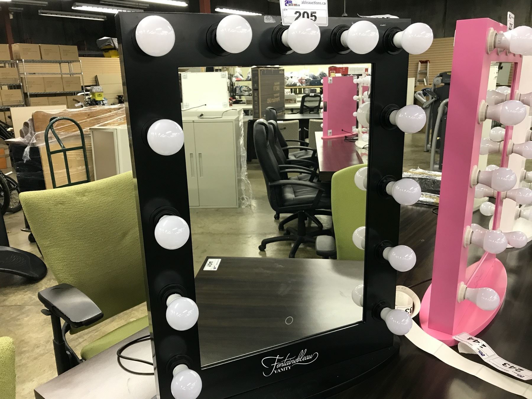 FONTAINEBLEAU VANITY MIRROR WITH TOUCH CONTROLS, 13 DIMMABLE DAYLIGHT LED BULBS, 2 SIDE MOUNTED POWER OUTLETS, REMOVABLE BASE AND WALL MOUNTING POINTS ON REAR, 23.5" WIDE X 31.5" TALL X 3" DEEP (WITHOUT STAND), BLACK BORDER AND BASE
