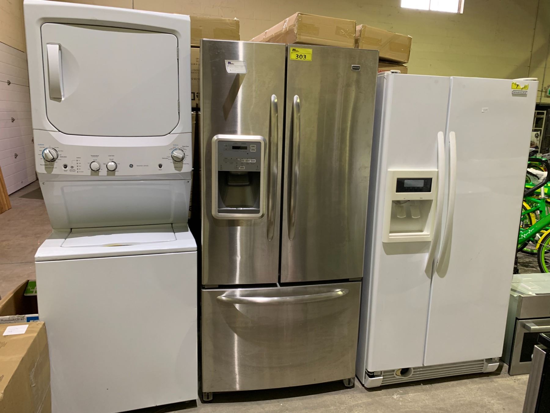 *FOR PARTS OR REPAIR* STAINLESS STEEL FRENCH DOOR MAYTAG FRIDGE WITH ICE AND WATER, KITCHENAID SIDE BY SIDE FRIDGE WITH ICE AND WATER AND GE STACKED WASHER DRYER SET