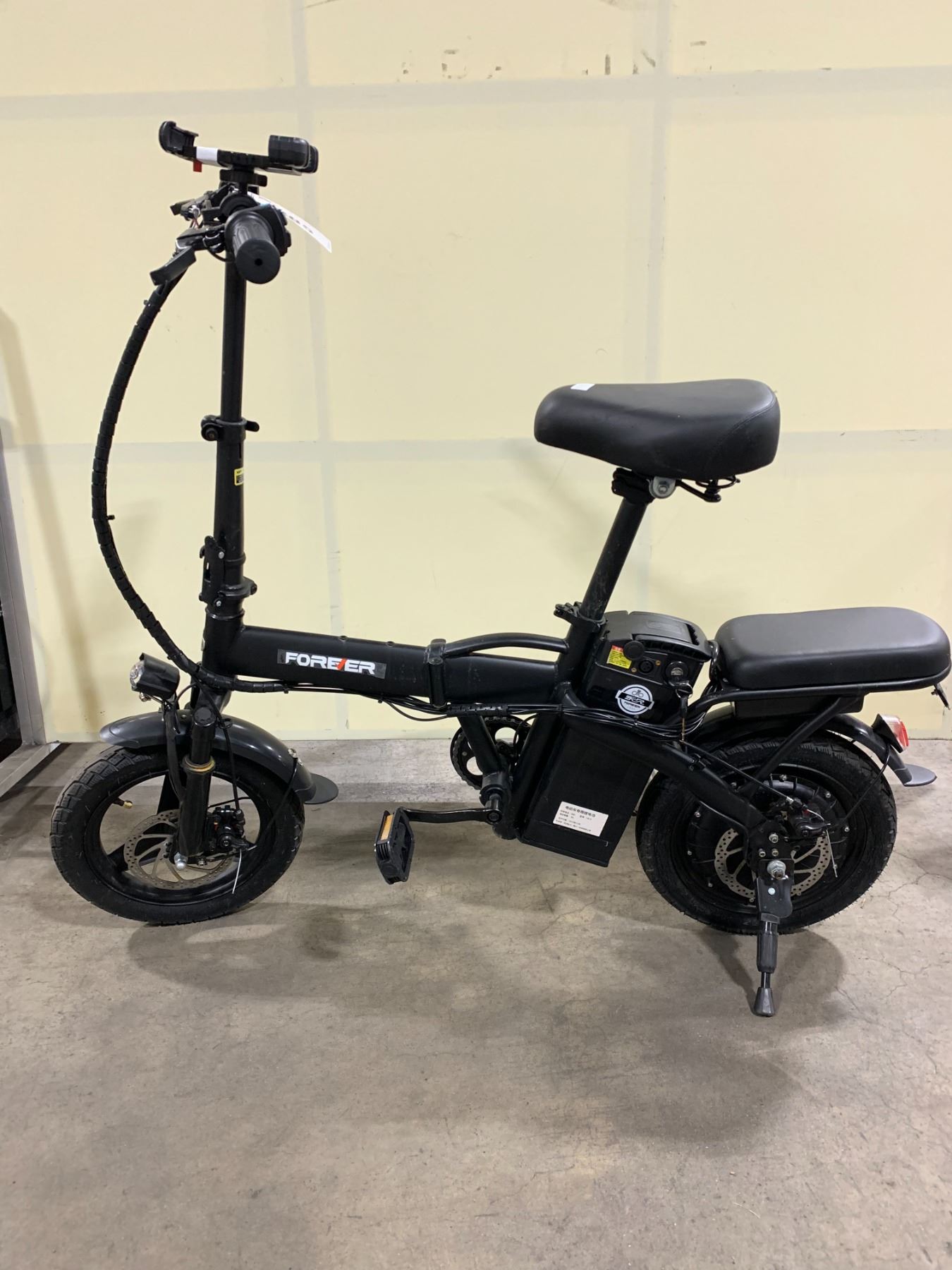 FOREVER BLACK SINGLE SPEED FRONT SUSPENSION ELECTRIC FOLDING BIKE WITH FULL DISC BRAKES *BATTERY KEY ONLY, NO IGNITION KEY, WILL NOT TURN ON, HAS BATTERY*