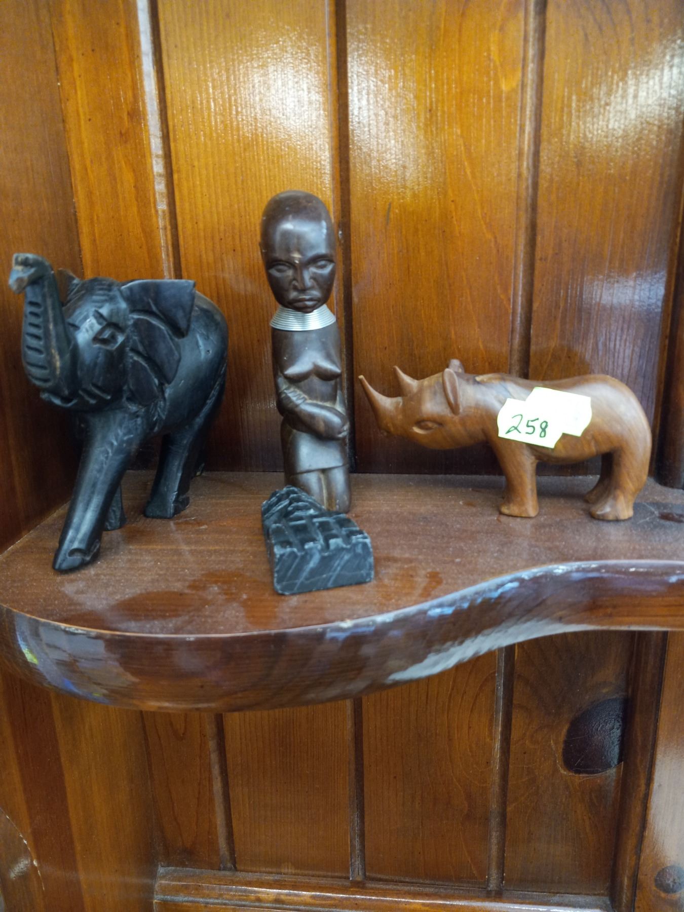 FOUR CARVINGS, ELEPHANT, RHINO ETC