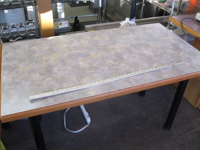 FOUR LEGGED TABLE, ARBORITE TOP. APPROX 54" X 29 1/2"
