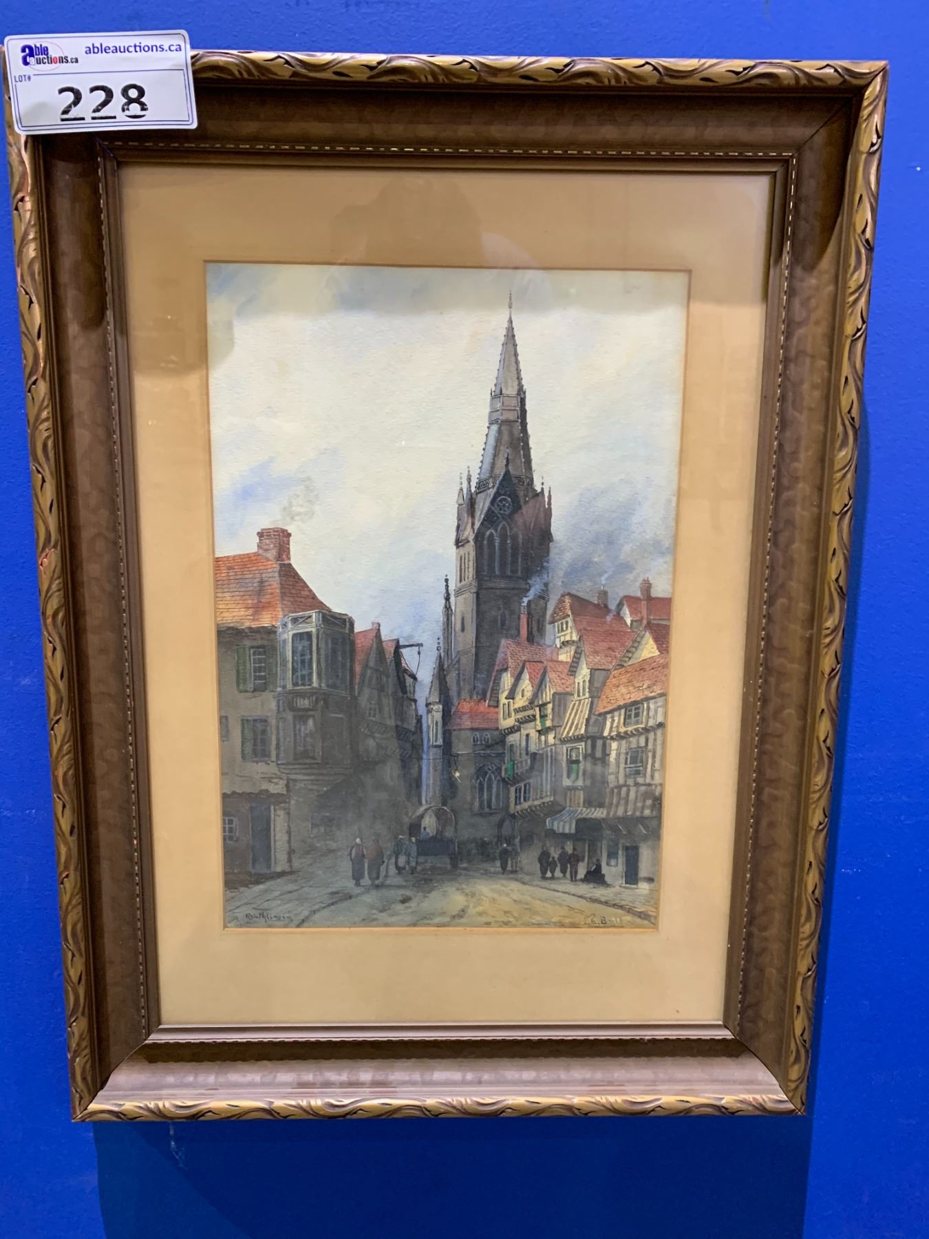 FRAMED ARTIST SIGNED ARTWORK OF EARLY CENTURY VILLAGE APPROX 20"X27"