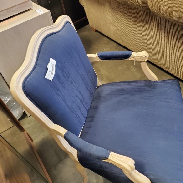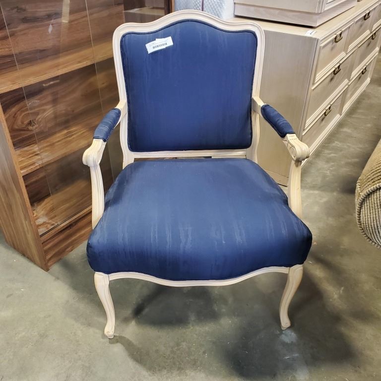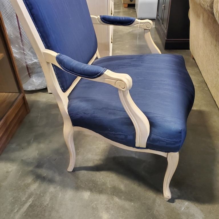 FRENCH PROVINCIAL RE-UPHOLSTERED BLUE FABRIC ARM CHAIR