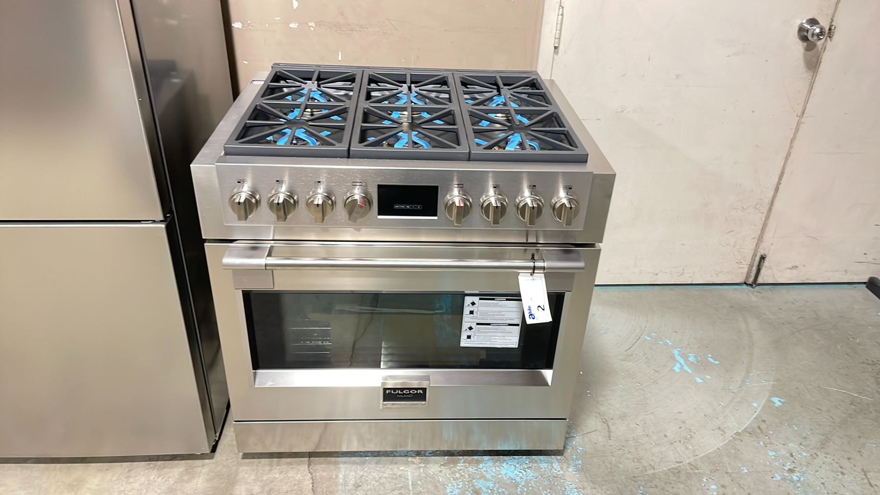 FULGOR MILANO F6PGR366S2 36" STAINLESS STEEL ALL GAS 6 BURNER PROFESSIONAL RANGE *IN BOX* TELESCOPIC GLIDING EXTENSION RACK, TEMPERATURE PROBE, CAST IRON GRATES, 36''W X 29.75"D X 38 1/4"H, 2- 20,000 BTU MAX (NG) 4- 18,000 BTU MAX (NG), RETAIL $7,969.00
