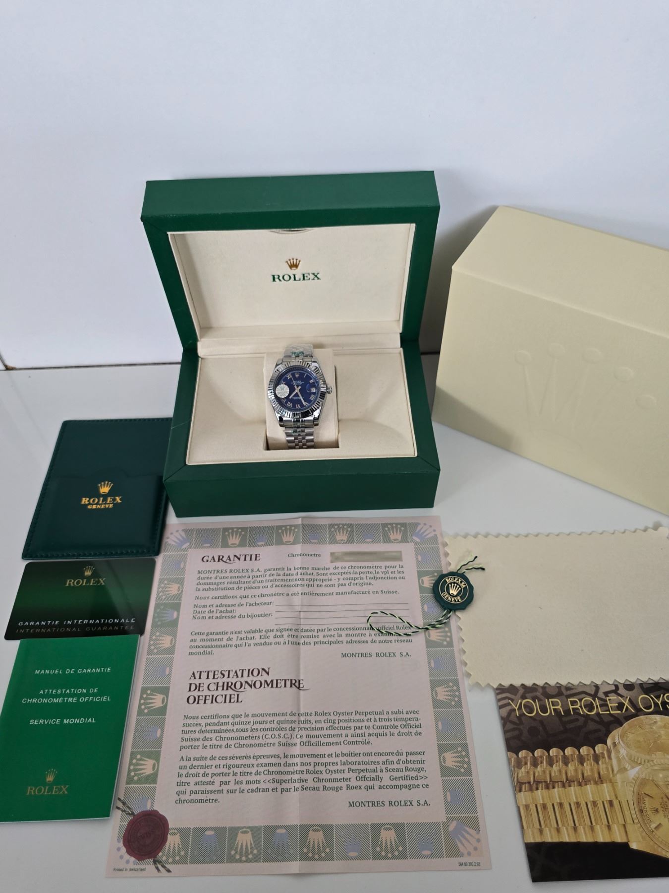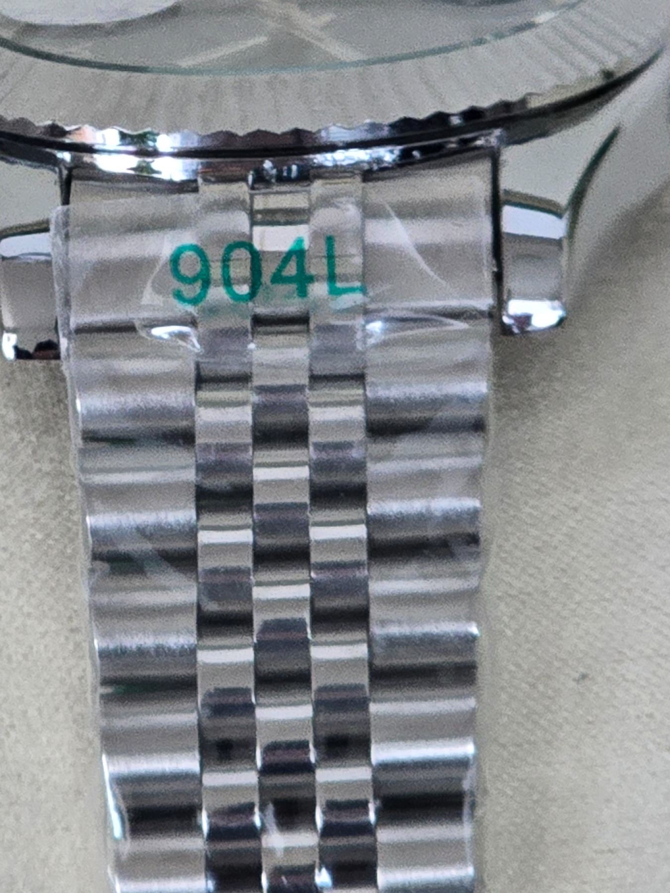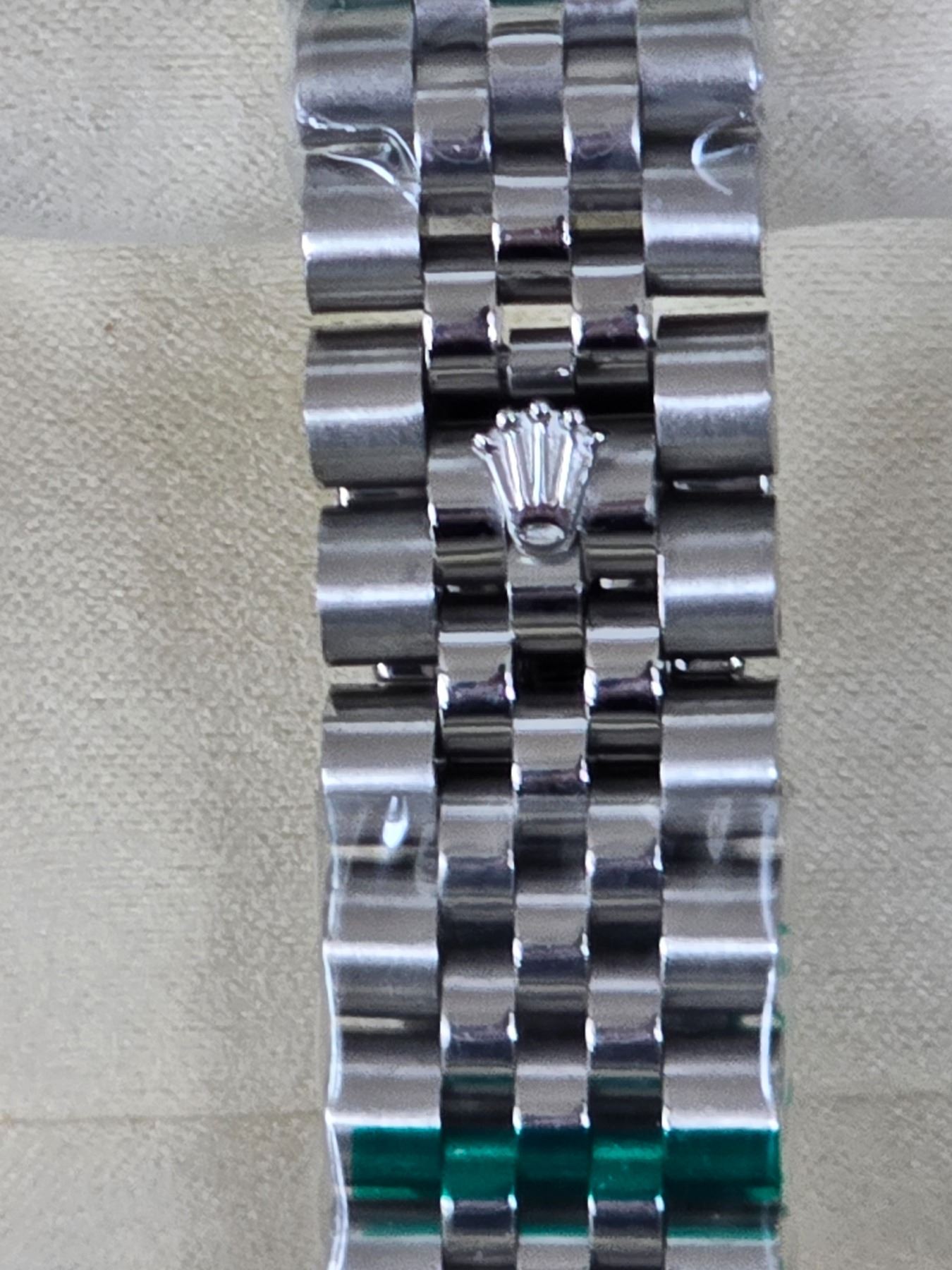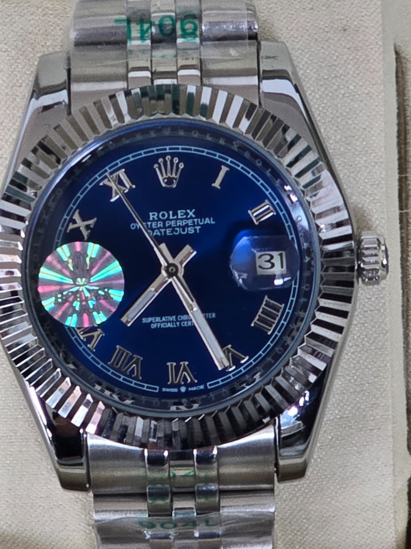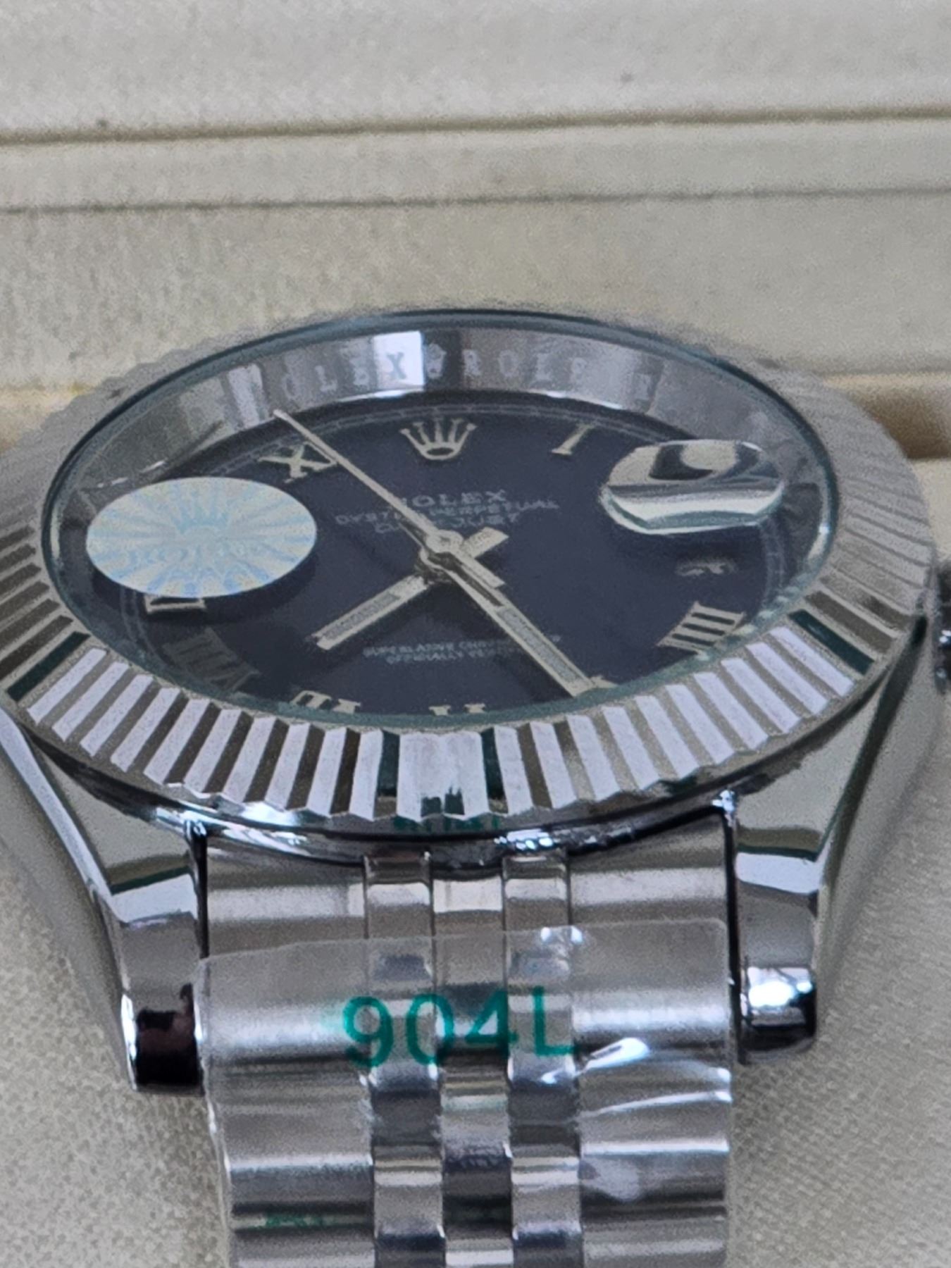 FULLY AUTOMATIC ROLEX DATE-JUST HIGH END REPLICA BLUE DIAL, FLUTED BEZEL, ROMAN NUMERALS. STAINLESS STEEL CASE AND JUBILEE BRACELET. 904L-THE SAME STAINLESS STEEL USED IN AUTHENTIC ROLEX WATCHES. FULL SET WITH BOX, PAPERS AND BAG.