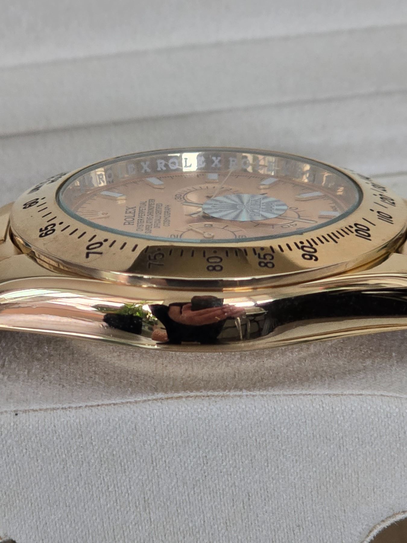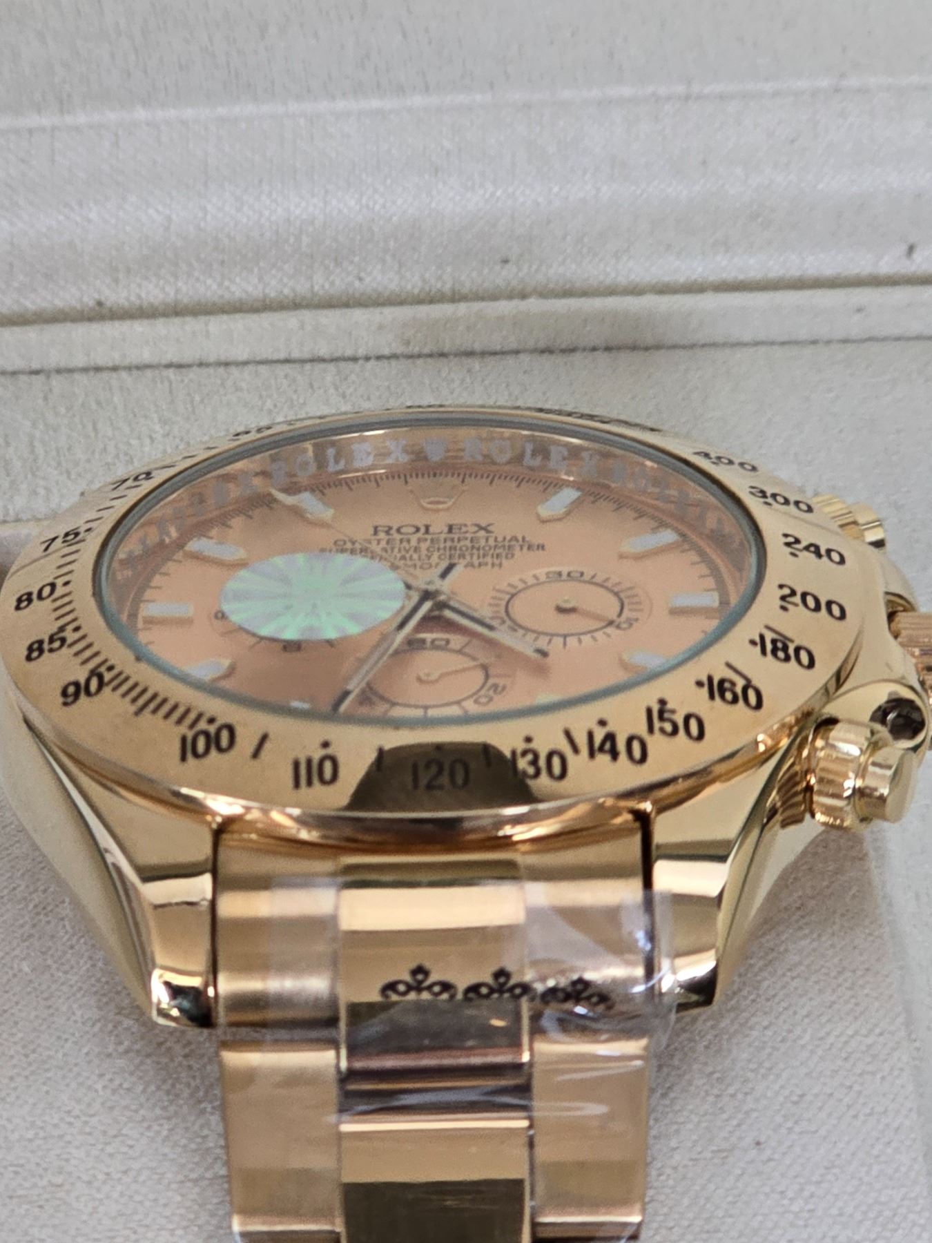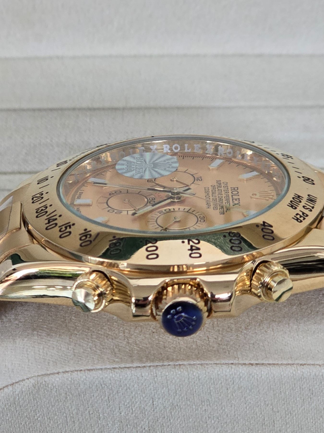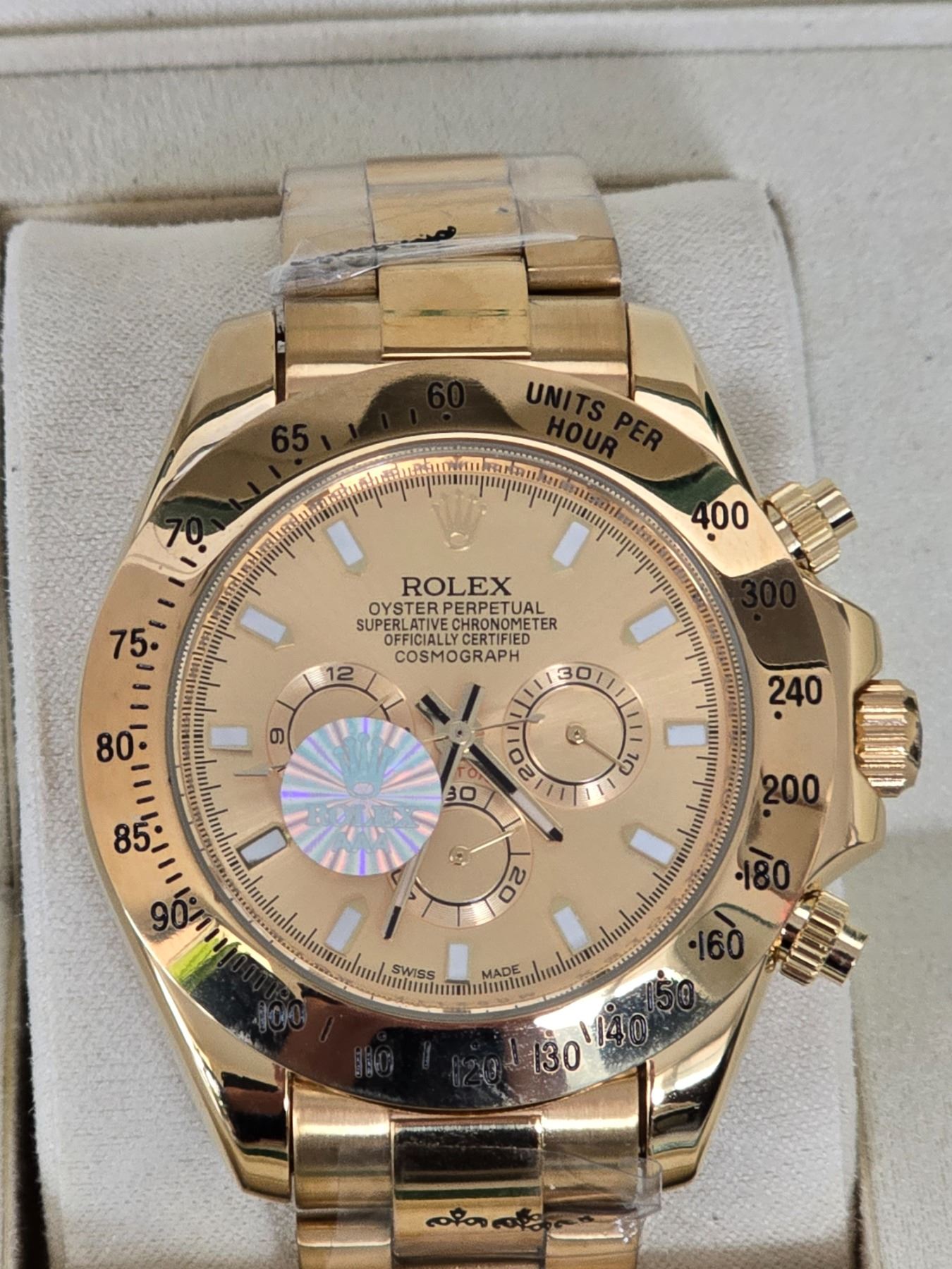 FULLY AUTOMATIC ROLEX DAYTONA YELLOW GOLD HIGH QUALITY REPLICA WATCH, GOLD DIAL WITH WHITE INDEXES GOLD BEZEL AND CROWN, 904L STAINLESS STEEL CASE (THE SAME STEEL USED IN AUTHENTIC ROLEX WATCHES). GOLD OYSTERSTEEL BRACELET. FULL SET WITH BOX, PAPERS AND BAG.