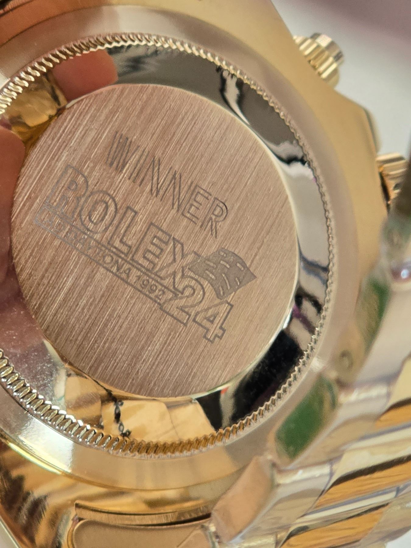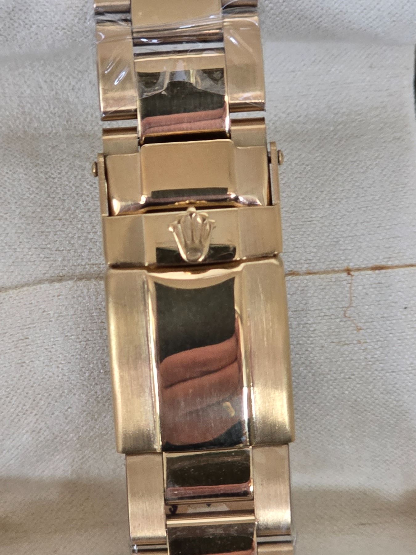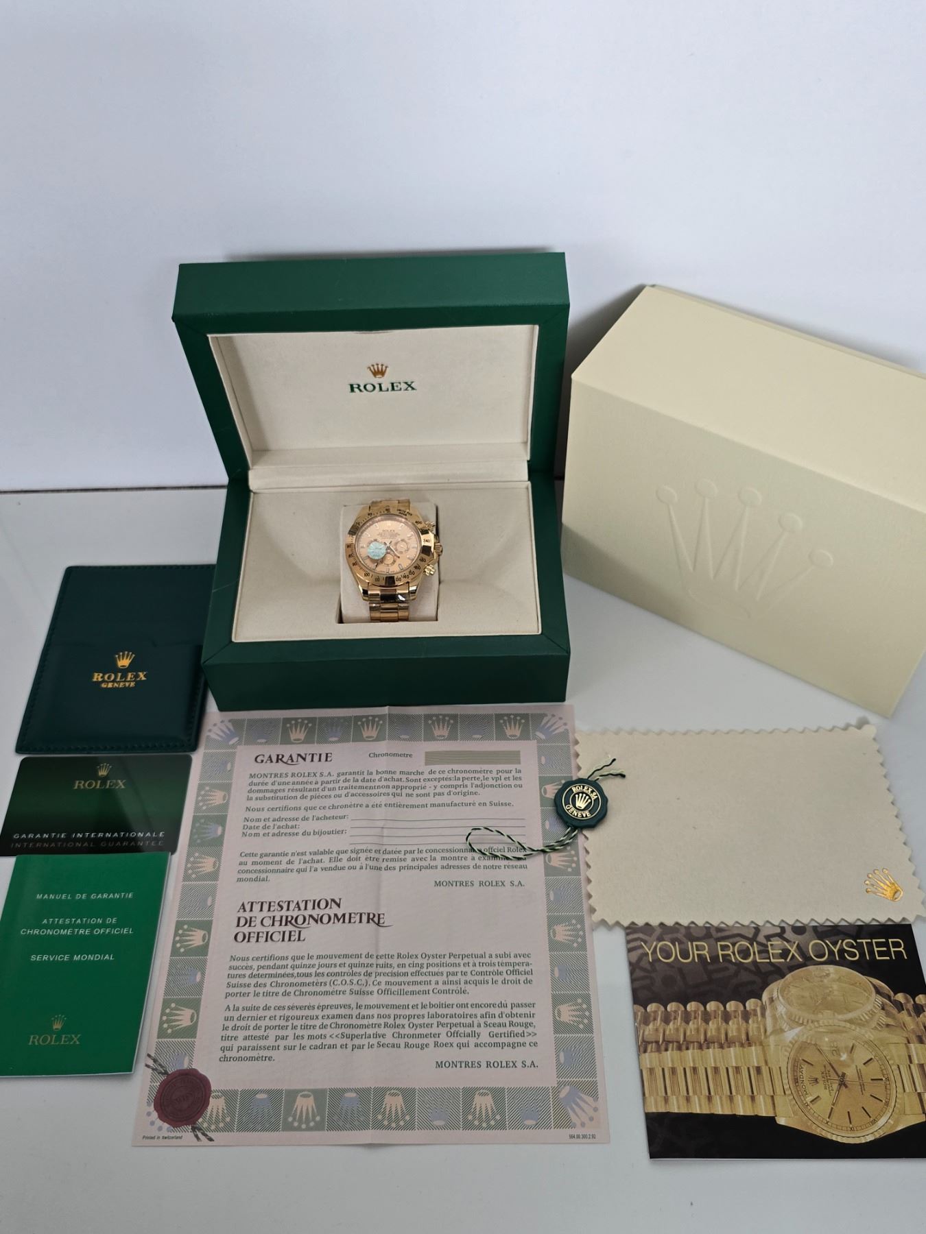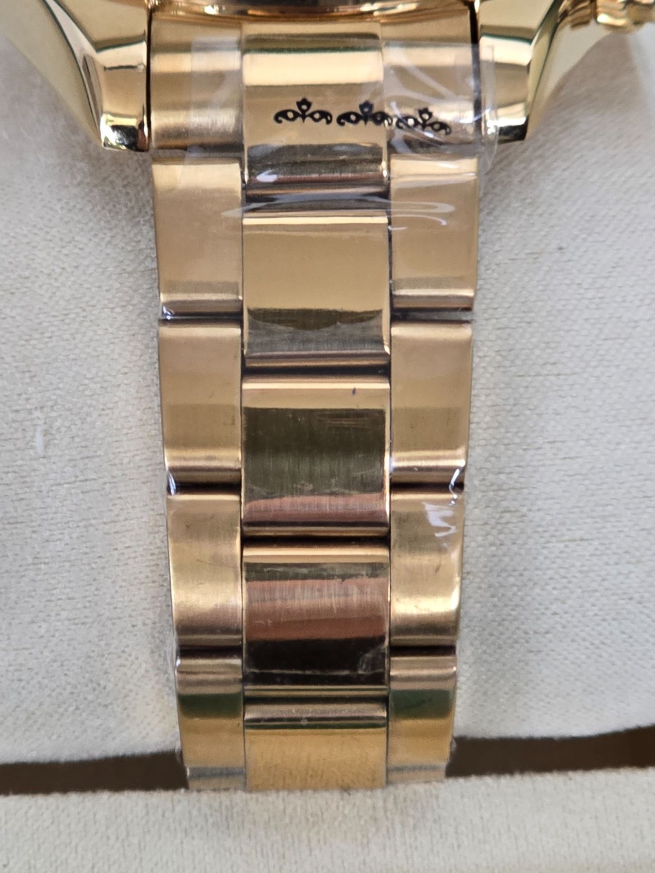 FULLY AUTOMATIC ROLEX DAYTONA YELLOW GOLD HIGH QUALITY REPLICA WATCH, GOLD DIAL WITH WHITE INDEXES GOLD BEZEL AND CROWN, 904L STAINLESS STEEL CASE (THE SAME STEEL USED IN AUTHENTIC ROLEX WATCHES). GOLD OYSTERSTEEL BRACELET. FULL SET WITH BOX, PAPERS AND BAG.