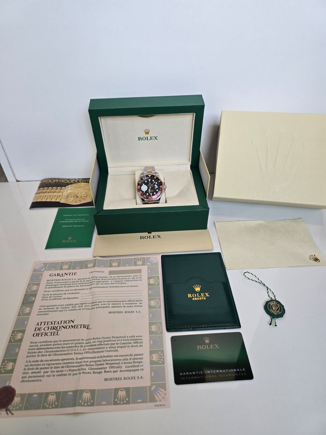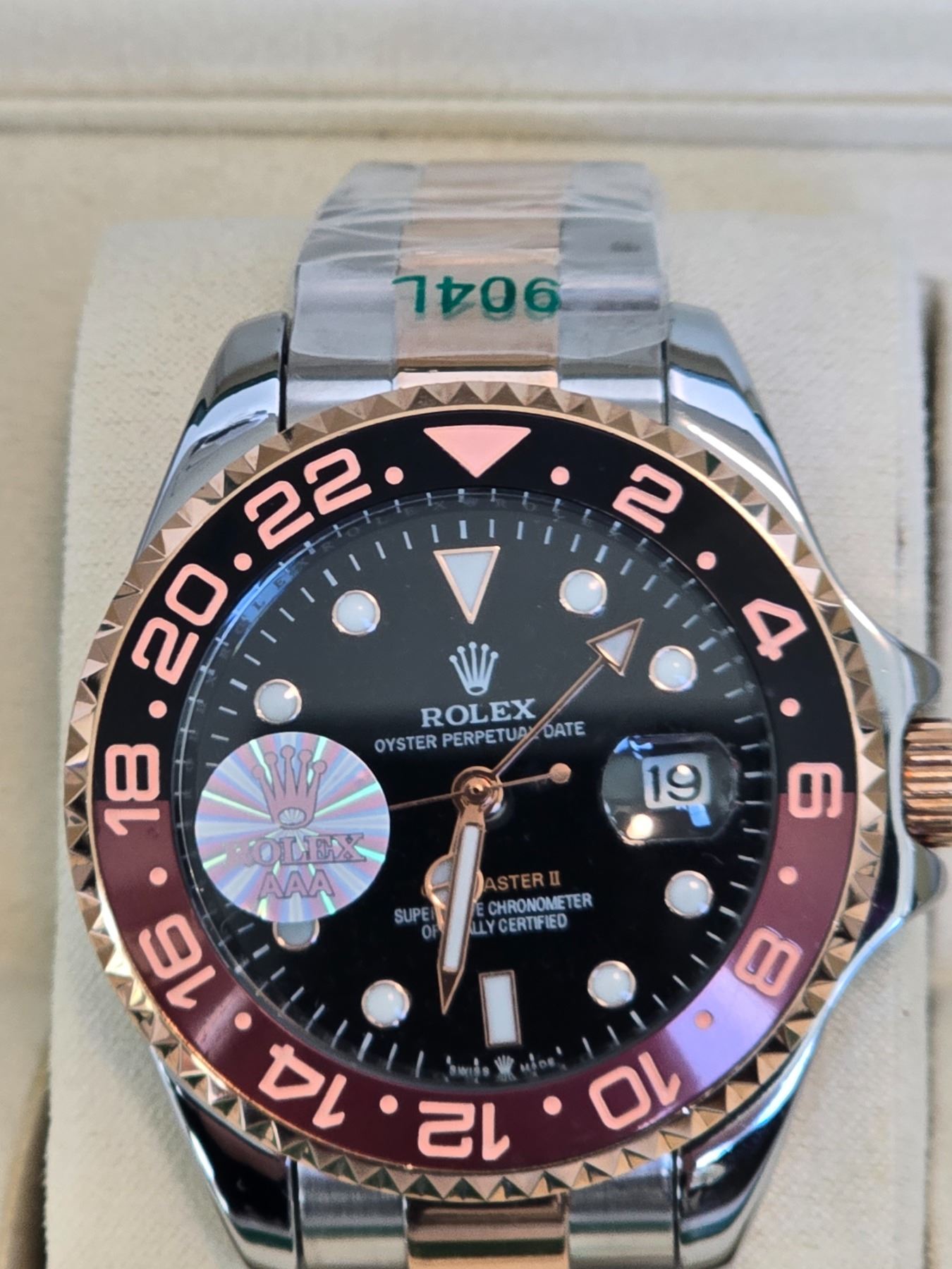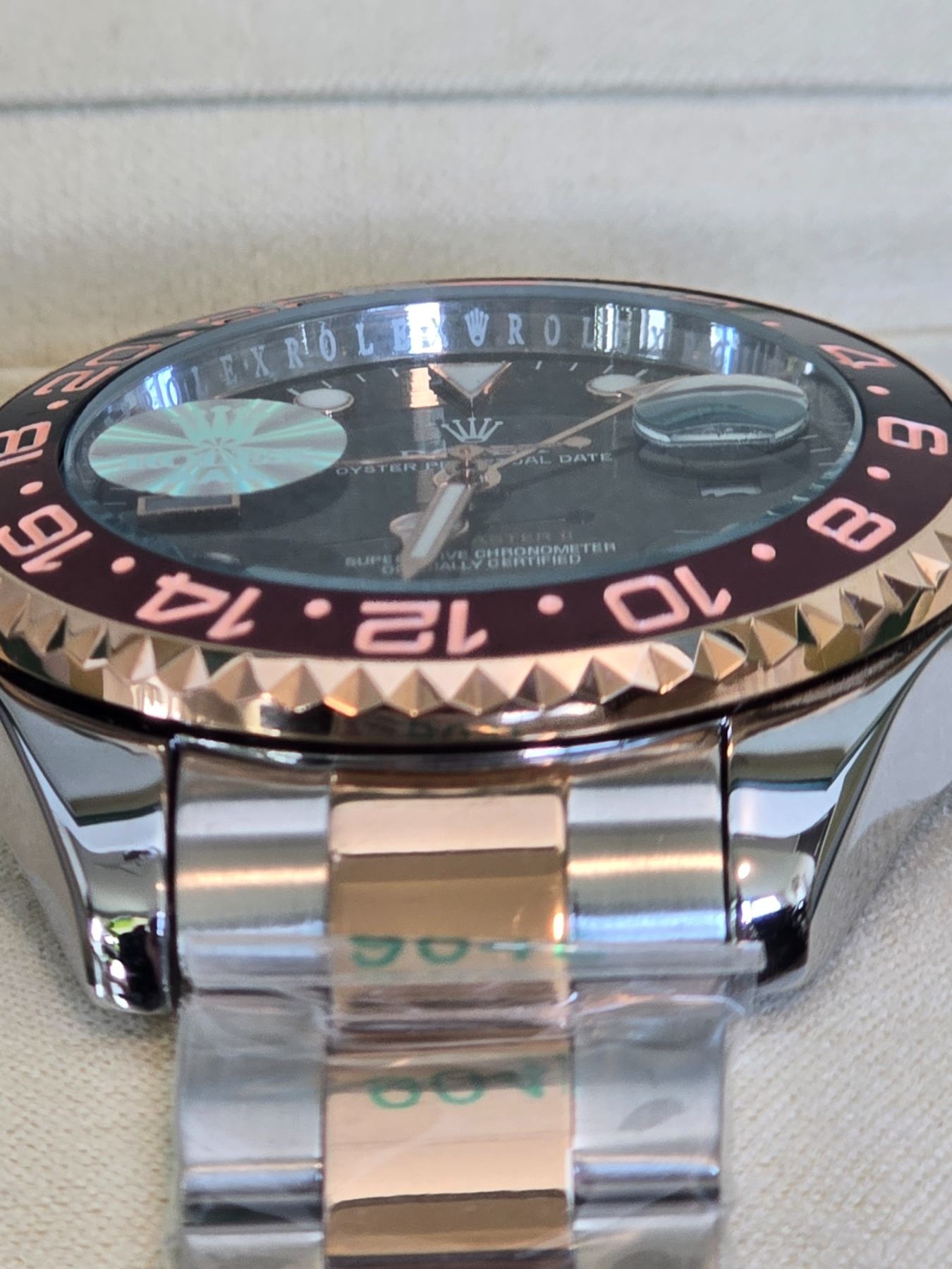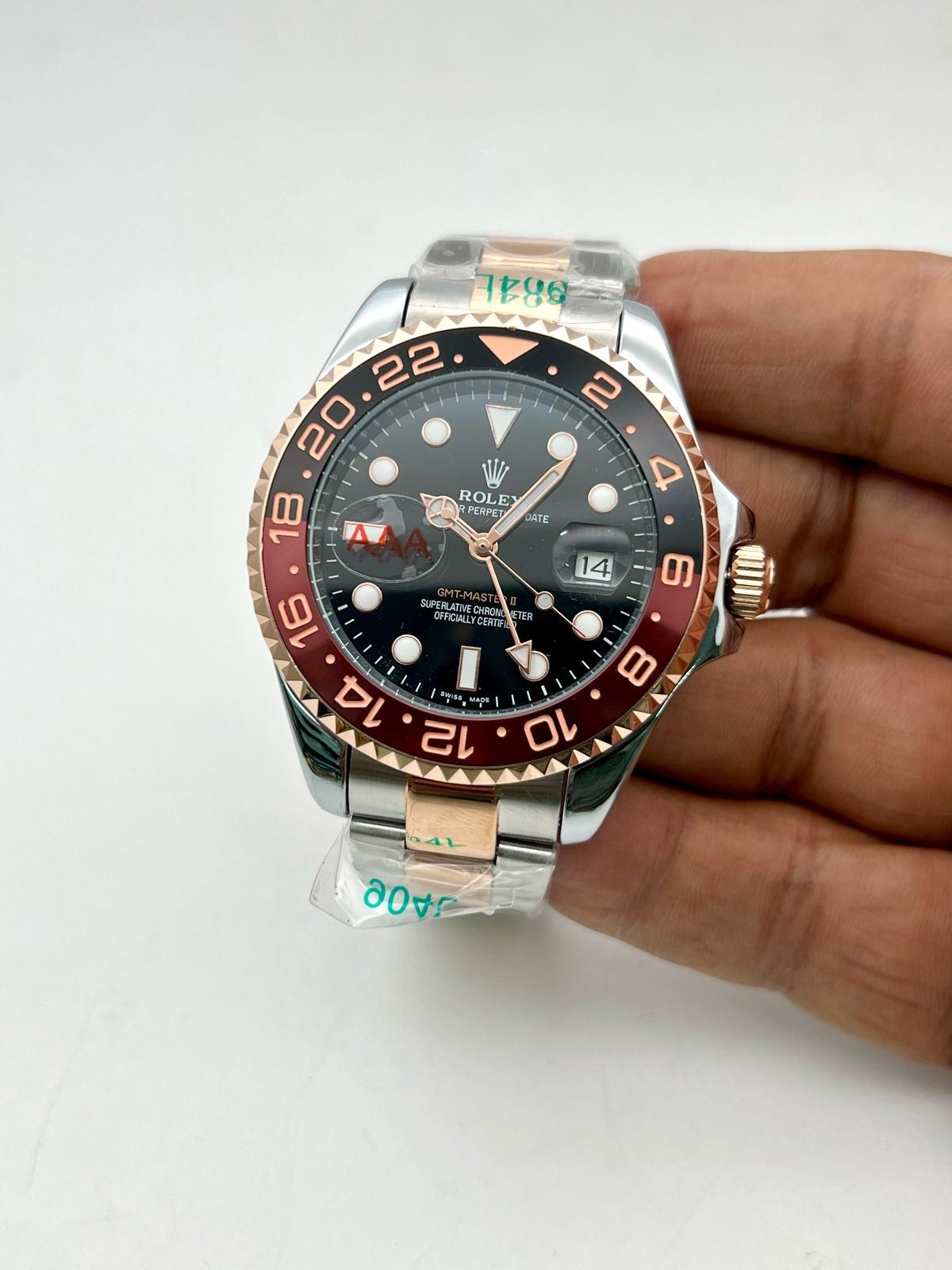 FULLY AUTOMATIC ROLEX GMT MASTER II 40 MM REF #126711CHNR - “ROOTBEER†- AAA QUALITY REPLICA WATCH WITH DAY, BLACK DIAL WITH WHITE INDEXES, 904L STAINLESS STEEL CASE (THE SAME STEEL USED IN AUTHENTIC ROLEX WATCHES), AND SPINNING BEZEL, 2 TONE STAINLESS STEEL OYSTERBRACELET. FULL SET WITH BOX, PAPERS AND BAG.