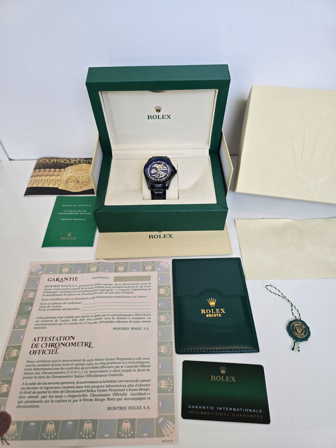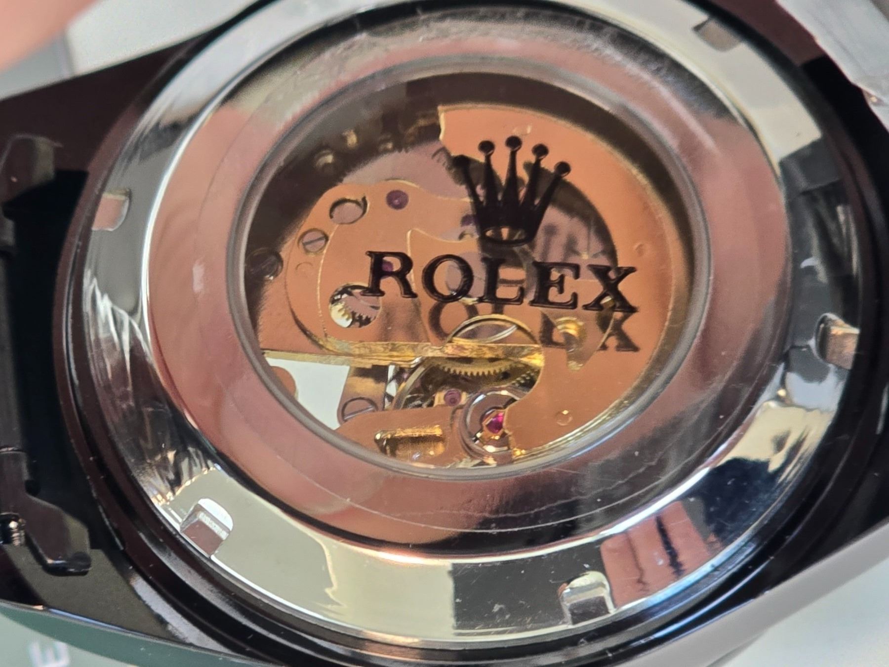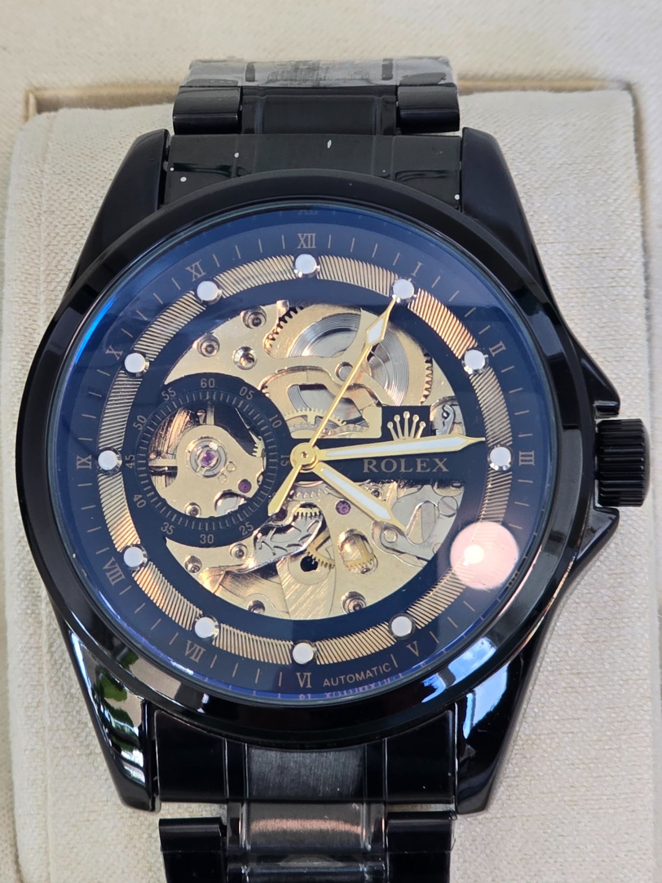 FULLY AUTOMATIC ROLEX SKELETON HIGH END REPLICA BLACK DIAL, CASE AND OYSTER BRACELET. THE SAME STAINLESS STEEL USED IN AUTHENTIC ROLEX WATCHES, FULL SET WITH BOX, PAPERS AND BAG