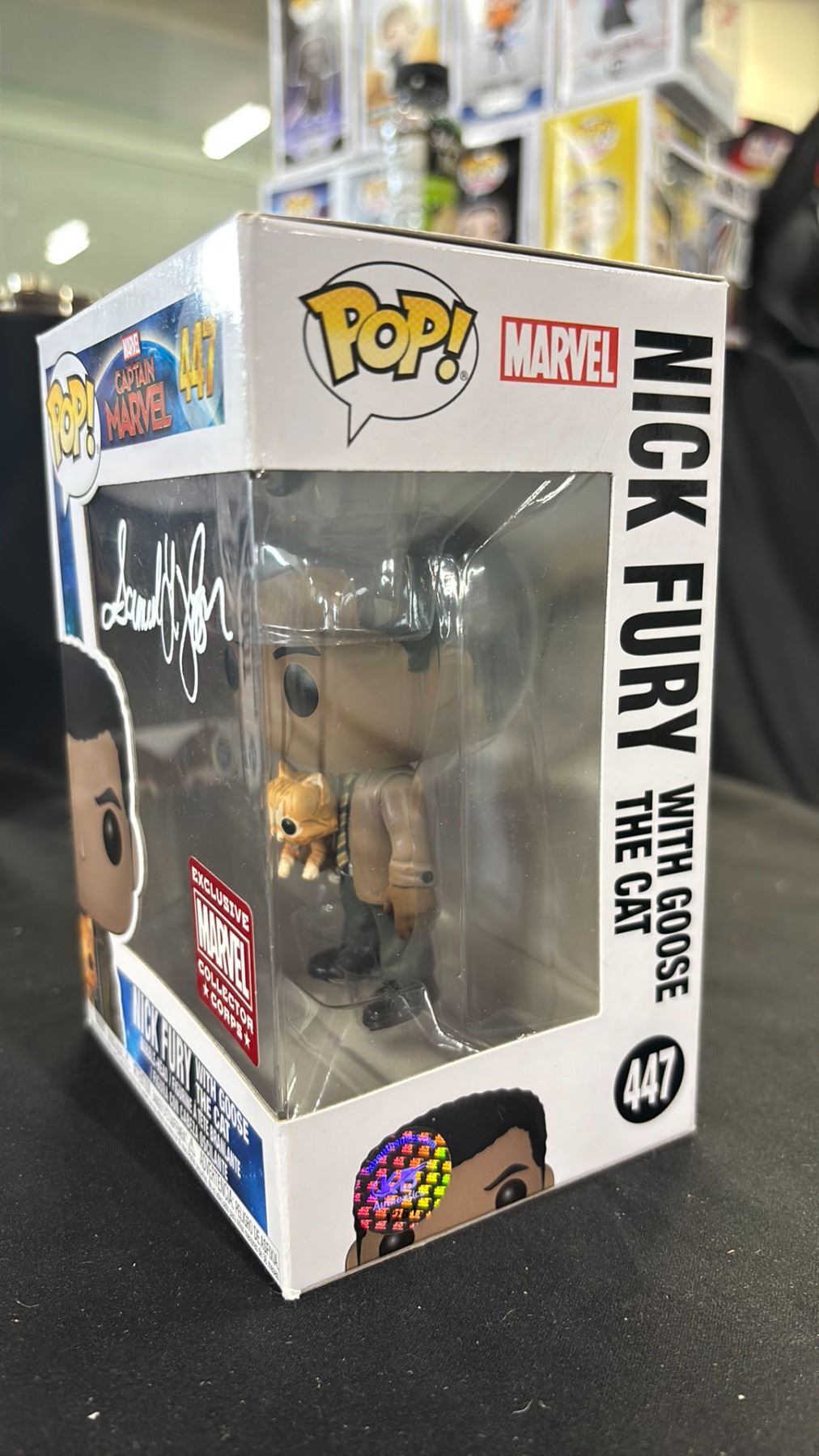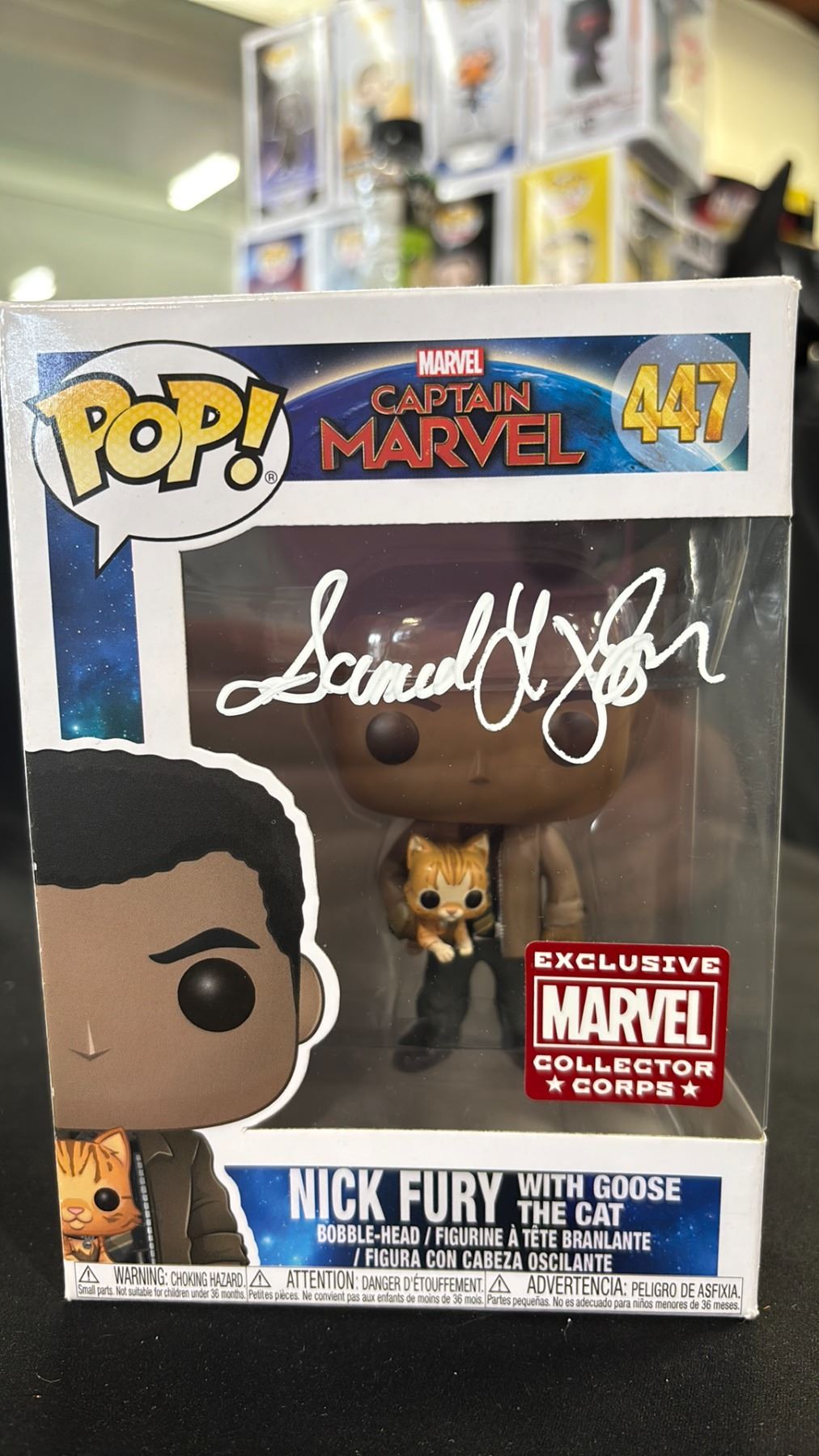 FUNKO POP! CAPTAIN MARVEL #447 NICK FURY WITH GOOSE THE CAT AUTOGRAPHED BY SAMUEL L. JACKSON