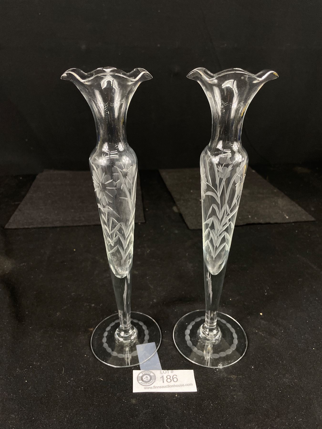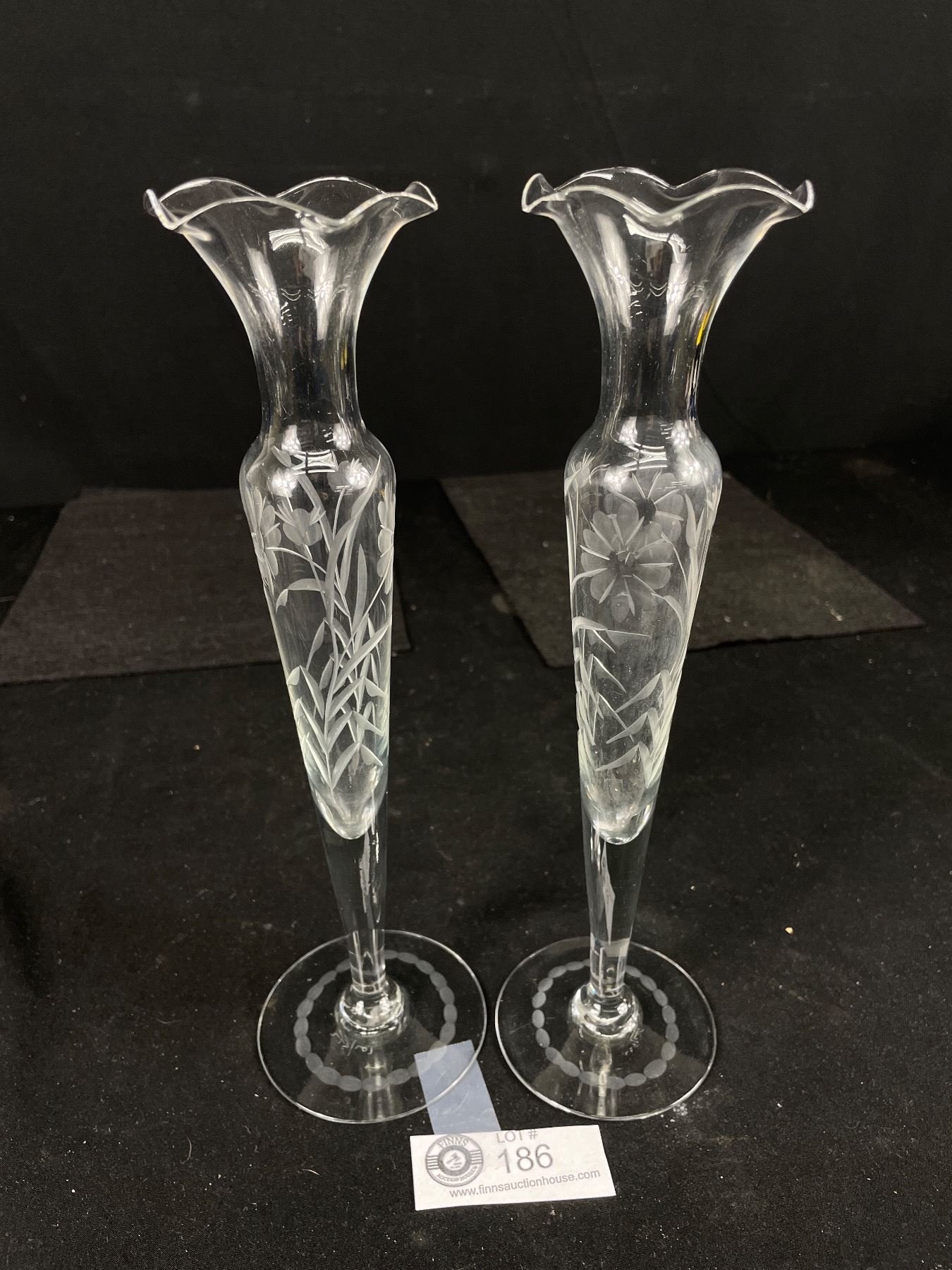 Fabulous 1940's Pair of Etched Glass Bud Vases - 10" Tall, Numbered & Vancouver Stamp