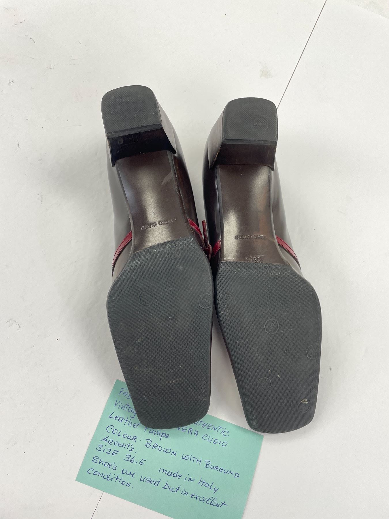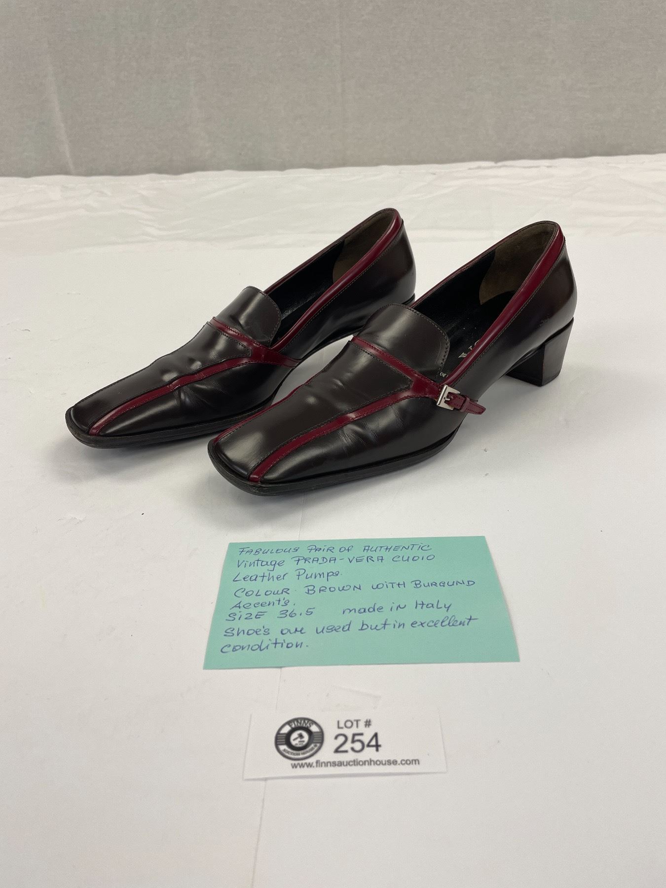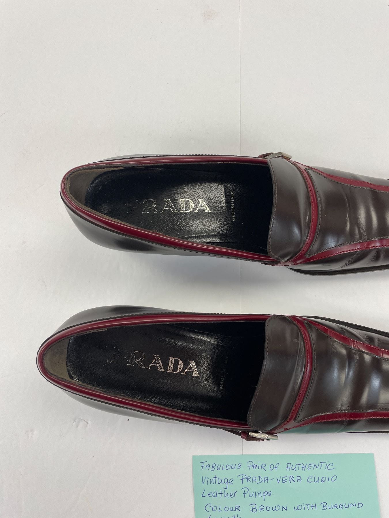 Fabulous Pair of Authentic Vintage Prada Vera Cuoio Leather Pumps Size 36.5 Brown with Burgandy Accents Made in Italy Used but Excellent Condition