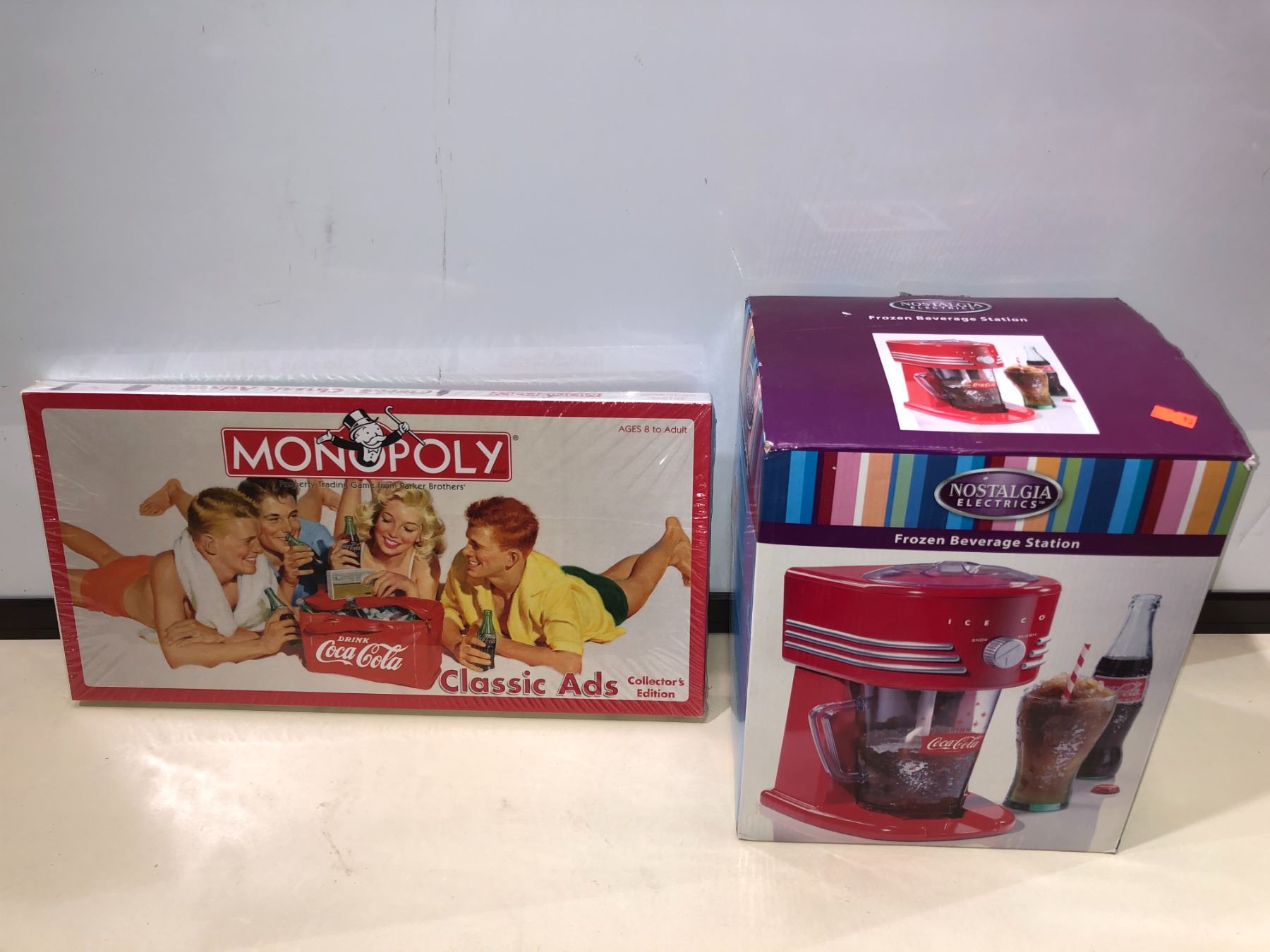 Factory sealed Monopoly Coca-Cola collectors edition board game & Nostalgia Electrics Coca-Cola Frozen Beverage Station