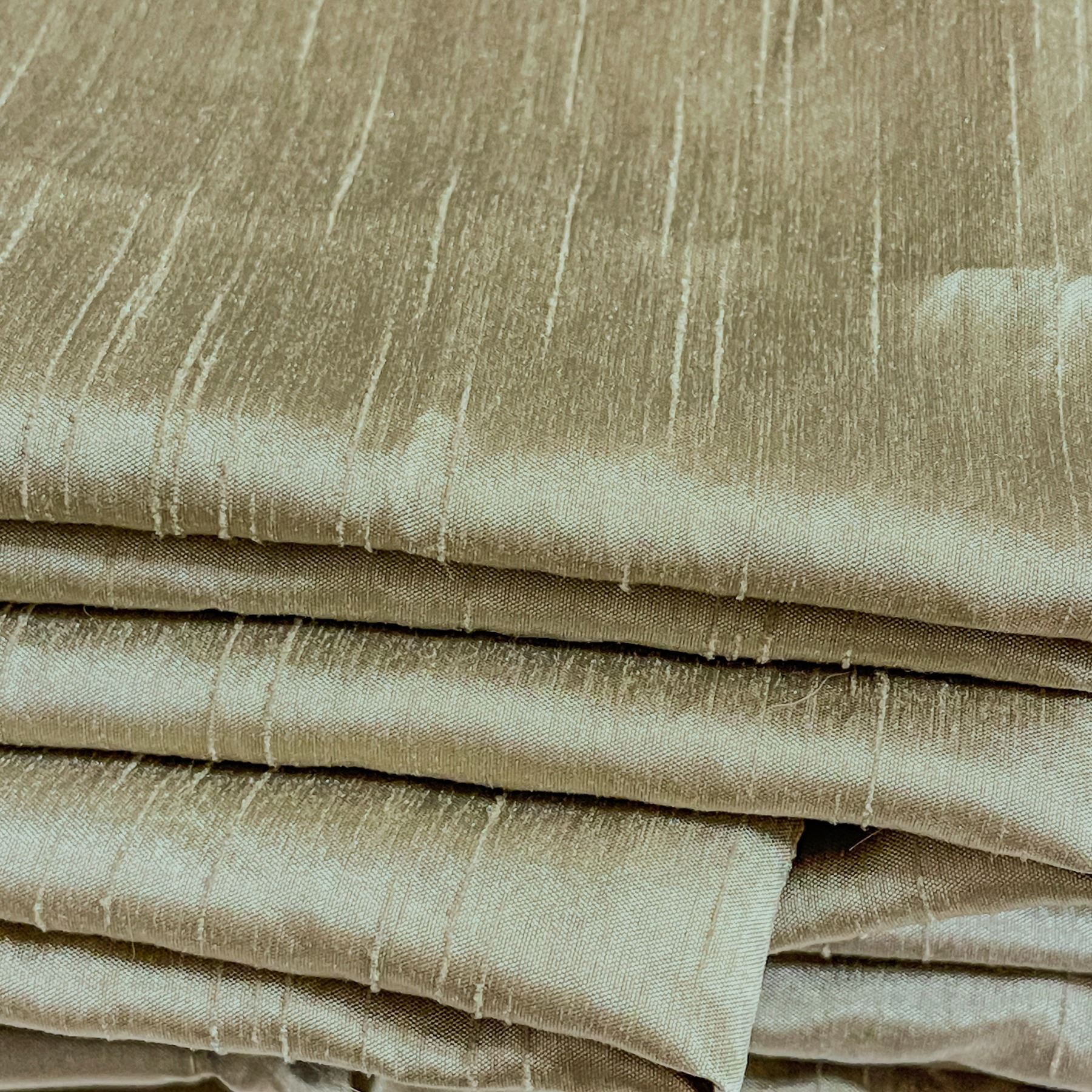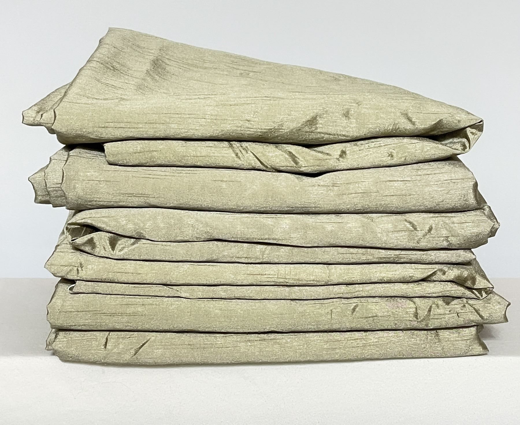 Set of lined blackout curtains in a light khaki/light green faux silk fabric with a subtle sheen. Includes 6 panels: 2 panels at 52”W x 68”L and 4 panels at 52”W x 96”L. Machine washable, designed for use with standard curtain rods.