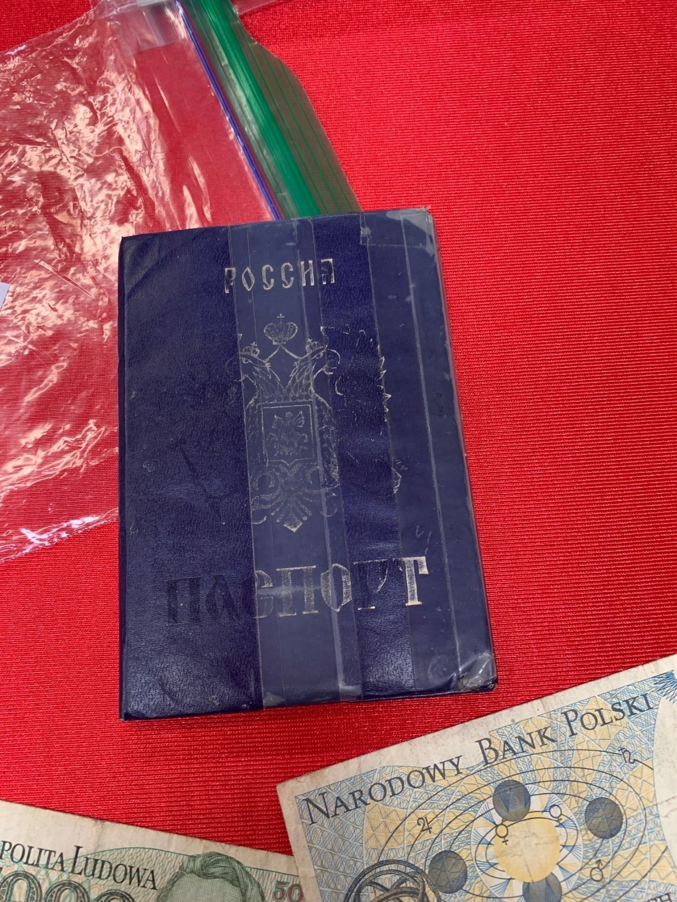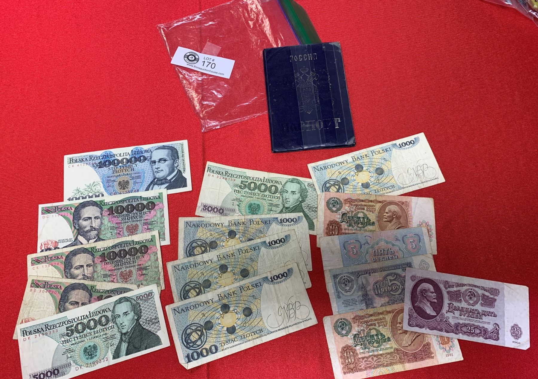 Fifteen vintage Russian/Polish banknotes + a Russian passport holder