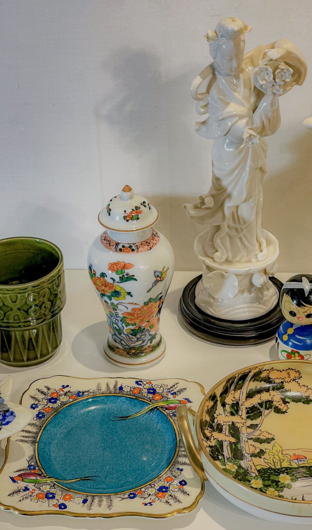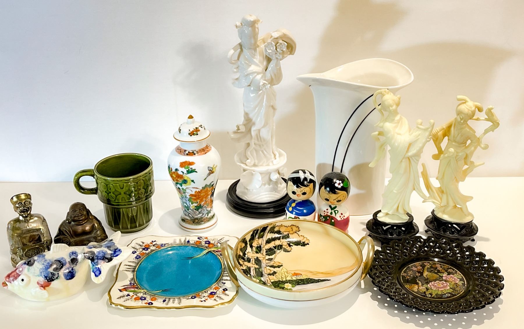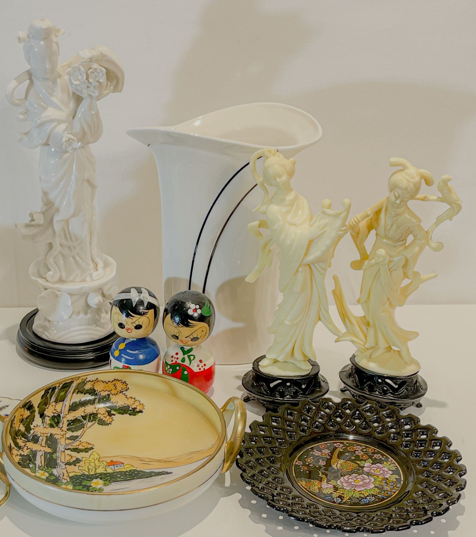 eautiful mixed lot featuring quality vintage and collectible pieces. Highlights include a Mikasa tall white vase with black accent, a Rosenthal lidded vase in Chinese floral style, a hand-painted Nippon handled bowl, and a Rideau Ware square dish made for Henry Birks & Sons by Grimwades England. Also includes a pair of Japanese Kokeshi dolls, ivory-tone Asian musician figurines, Buddha and scholar figures, a ceramic koi fish, and more. A refined and diverse display-worthy collection with several valuable maker-marked pieces.