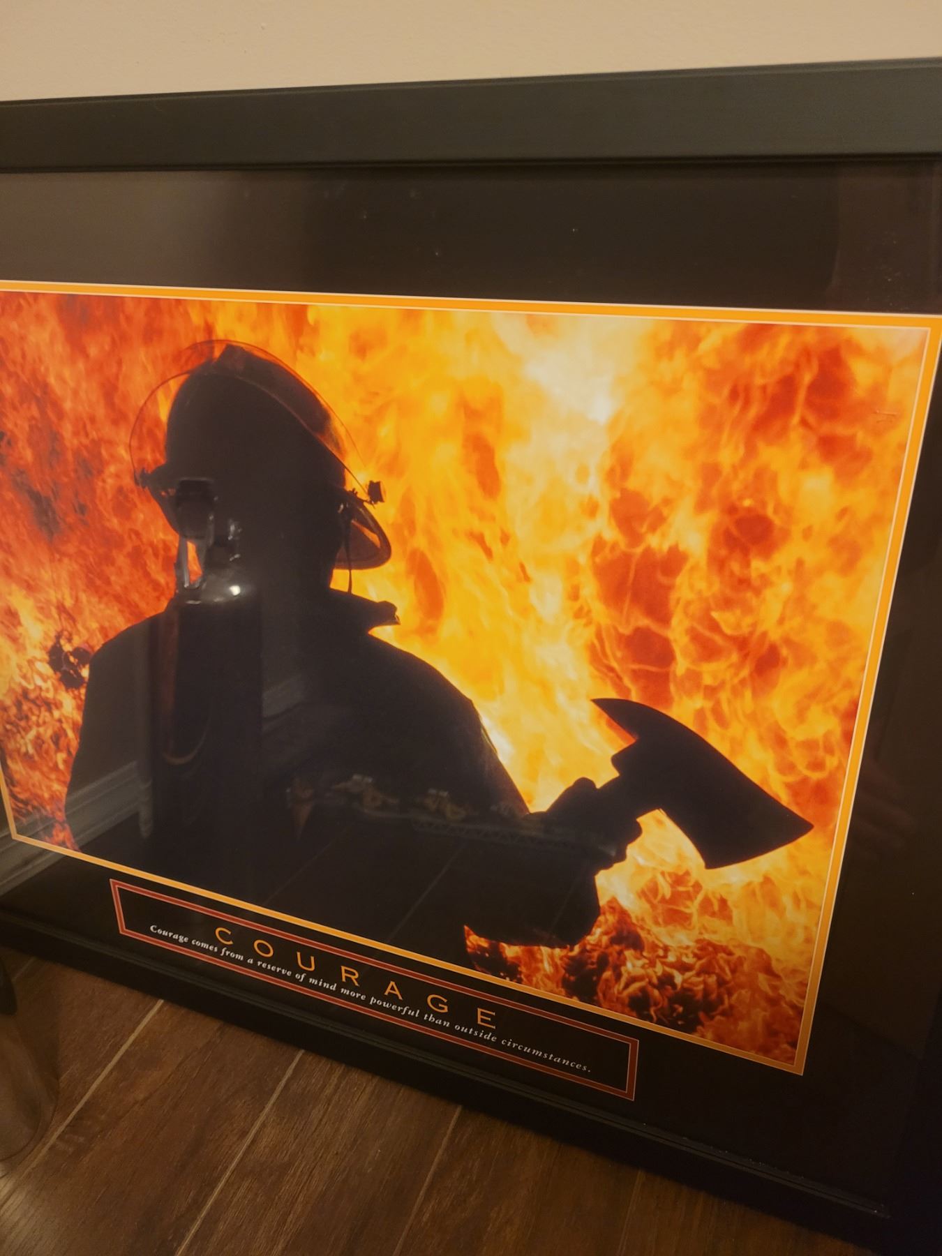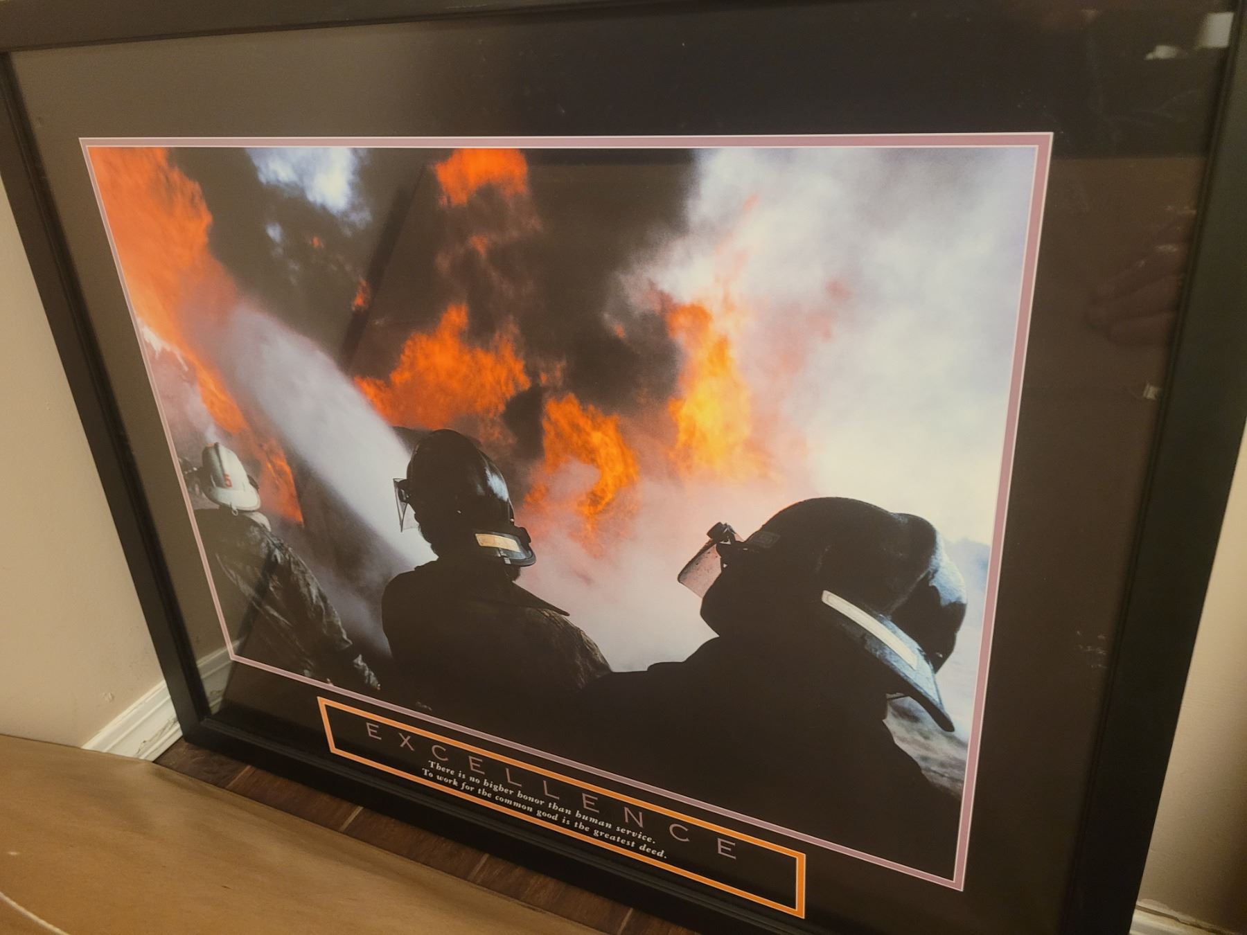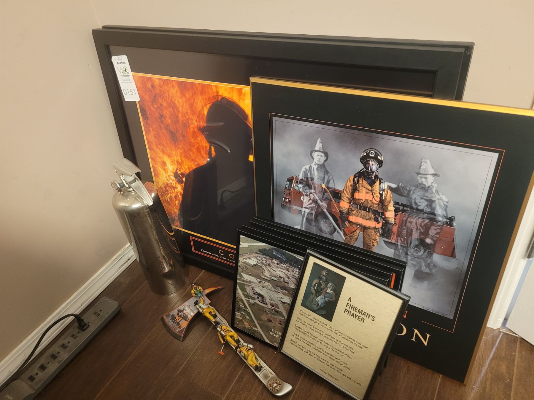 Framed Art, hatchet, fire extinguisher, pick up 9-10