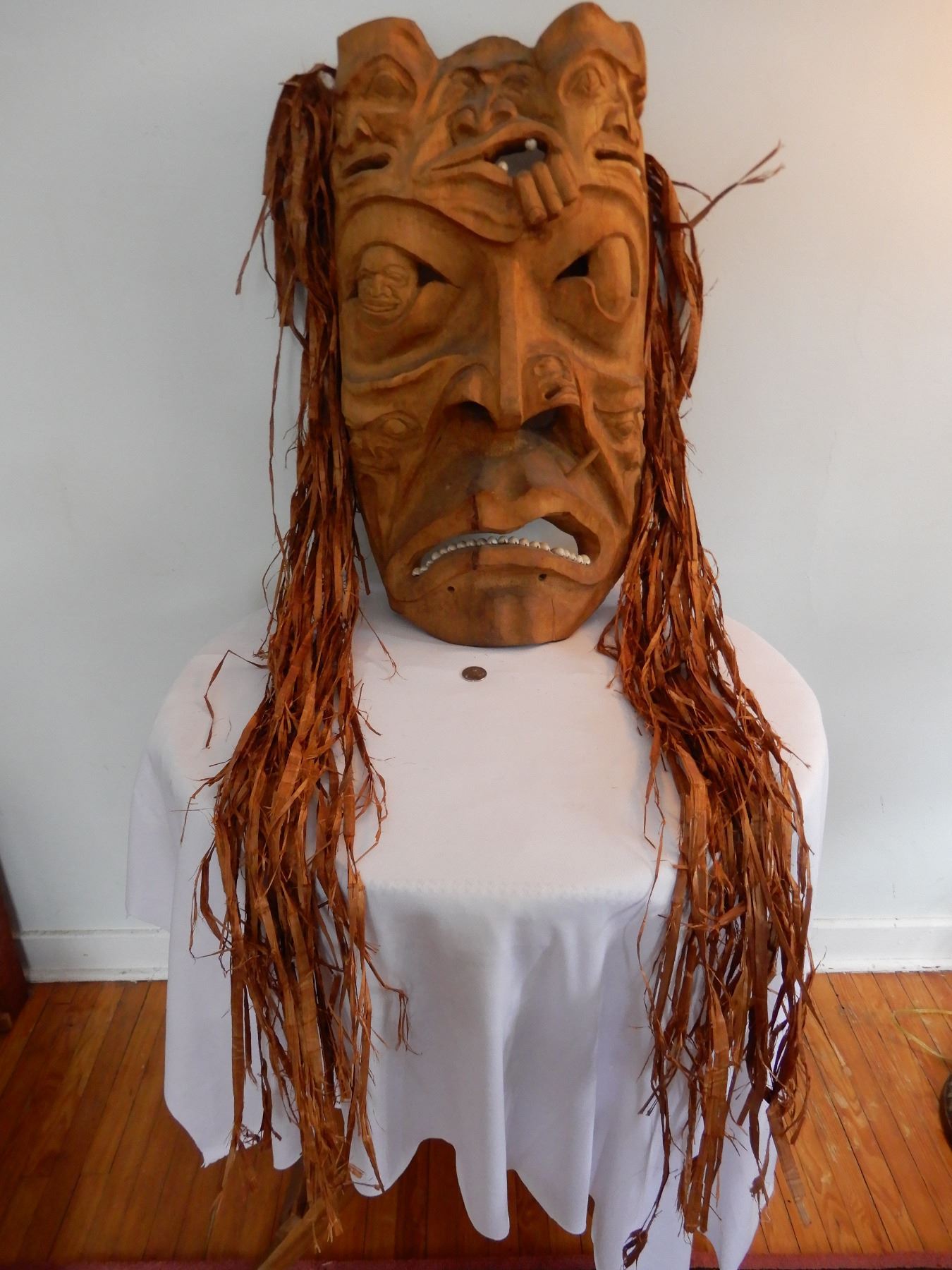 First Nations carved mask w/ cowrie shells & cedar hair - artist unknown THIS LOT IS LOCATED AT 2306 MADISON AVE, BURNABY.