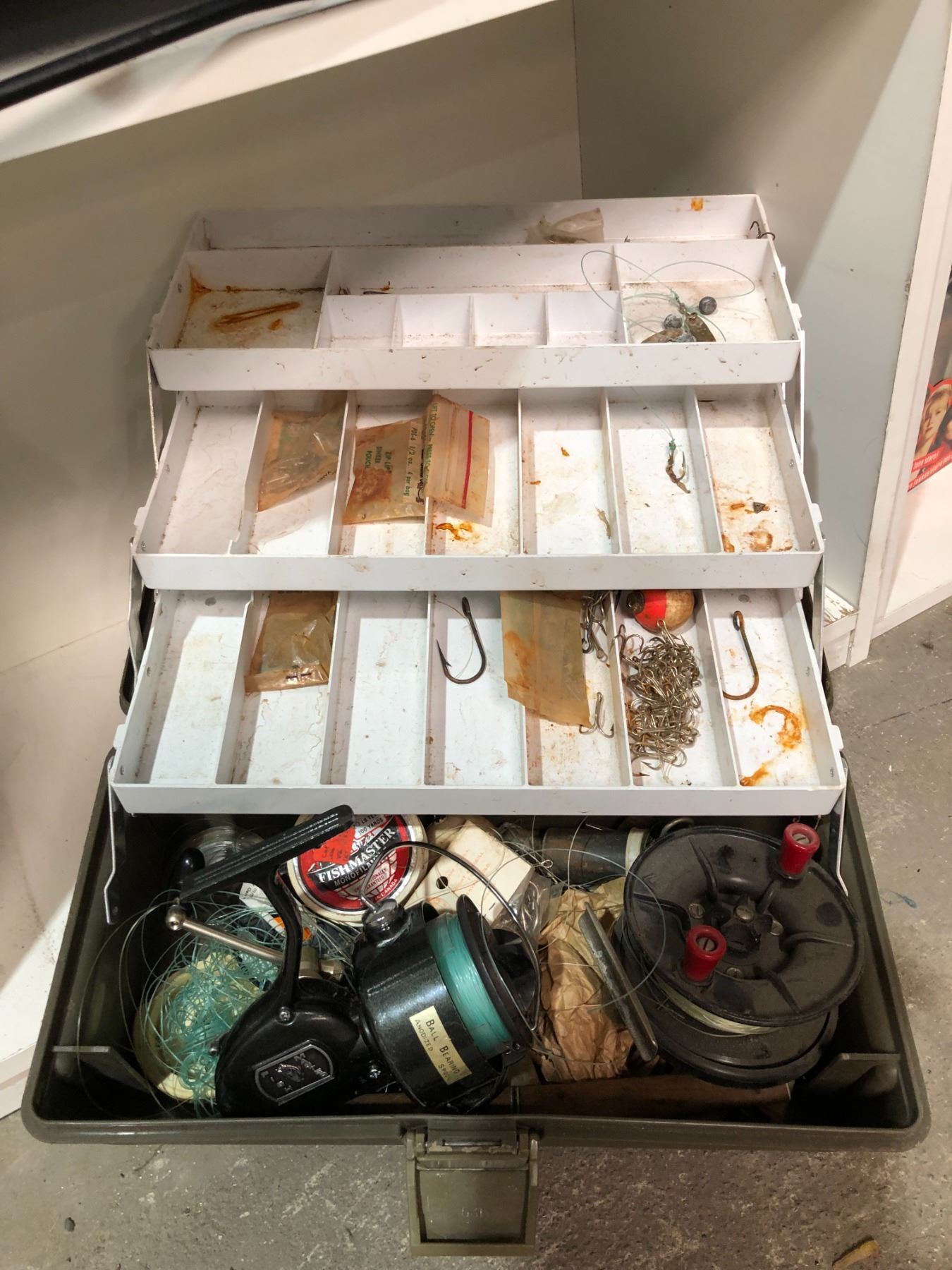 Fishermans tackle box w/contents & 2 fishing reels