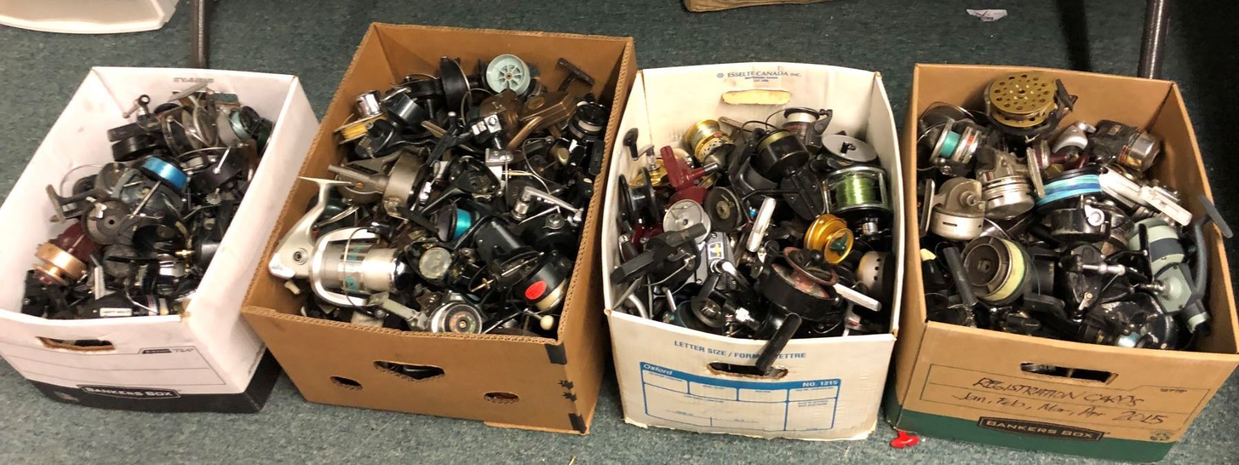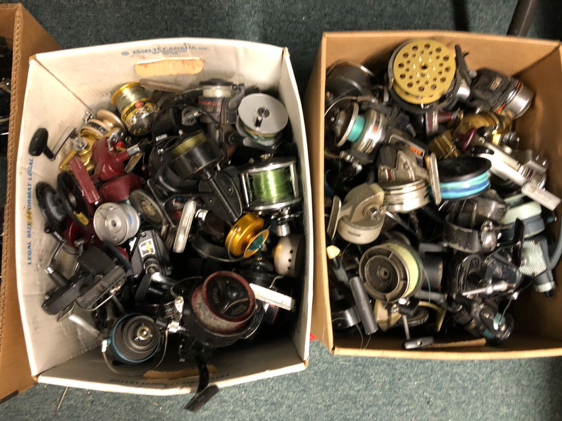 Five boxes full of assorted fishing reels - FOR PARTS OR REPAIR ONLY