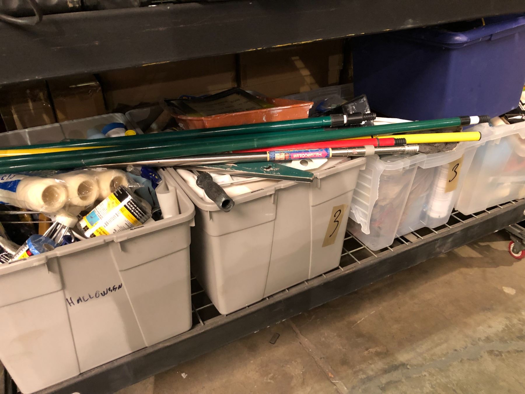 Five plastic storage bins of assorted painters/drywall/stucco - tools/ equipment & supplies