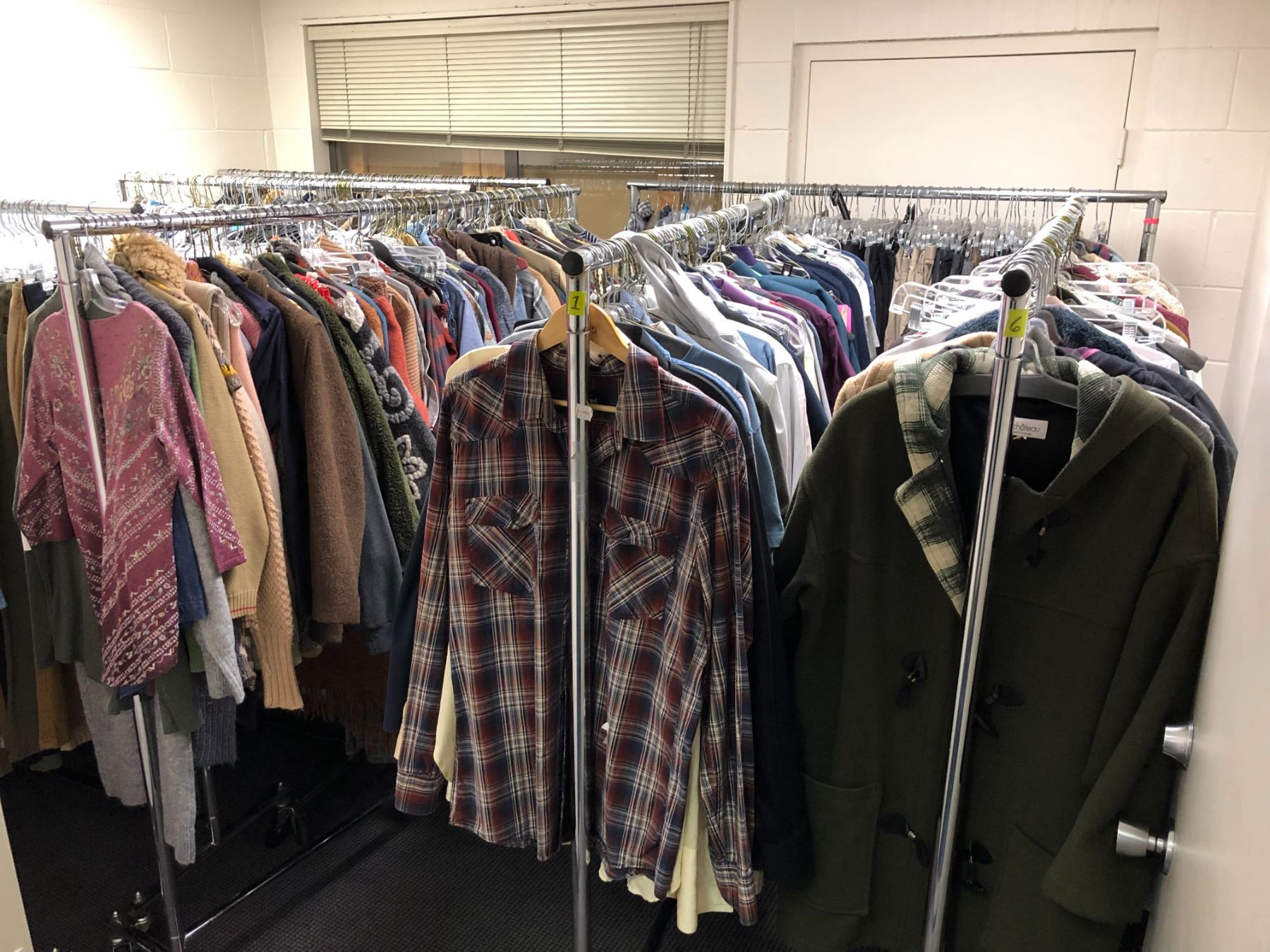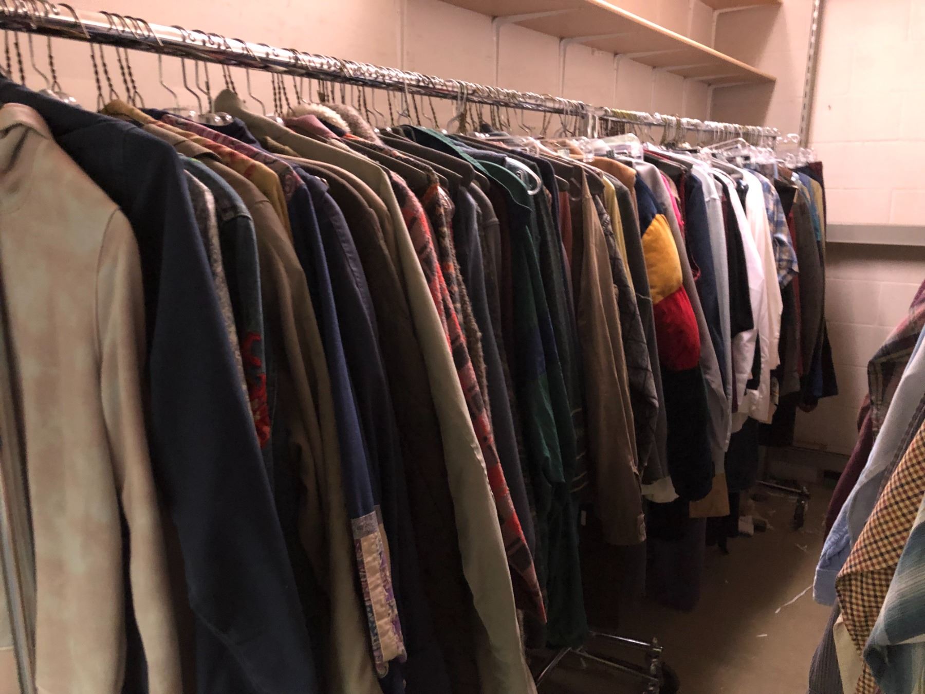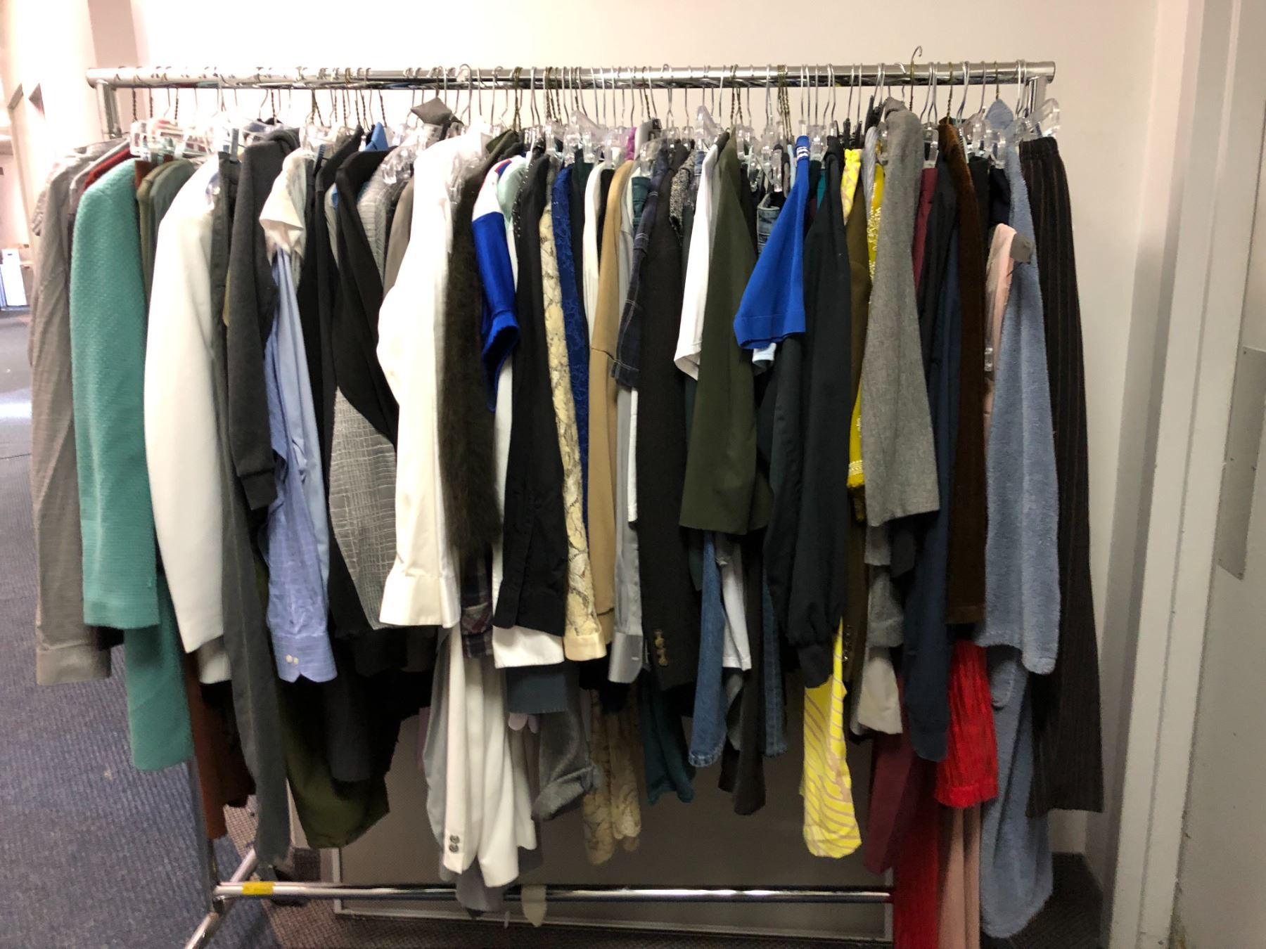 Five racks of assorted men's & ladies clothing - tops/ trousers/ jeans/ jackets - approx. 50 garment