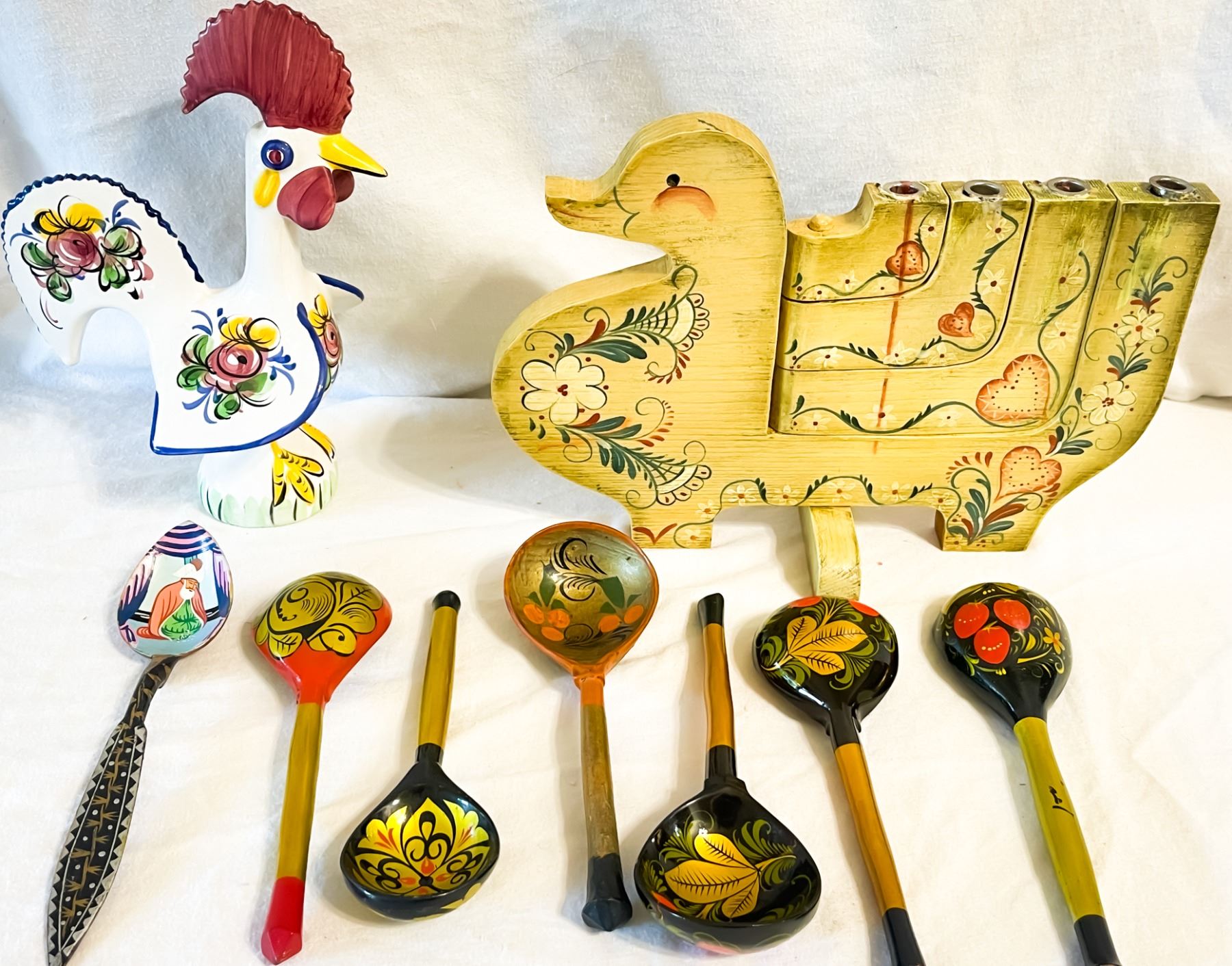 Colorful folk art collection featuring a traditional hand-painted rooster from Portugal, a charming handmade and hand-painted wooden goose candelabra (unsigned), and a set of 8 painted wooden serving spoons in various folk styles.