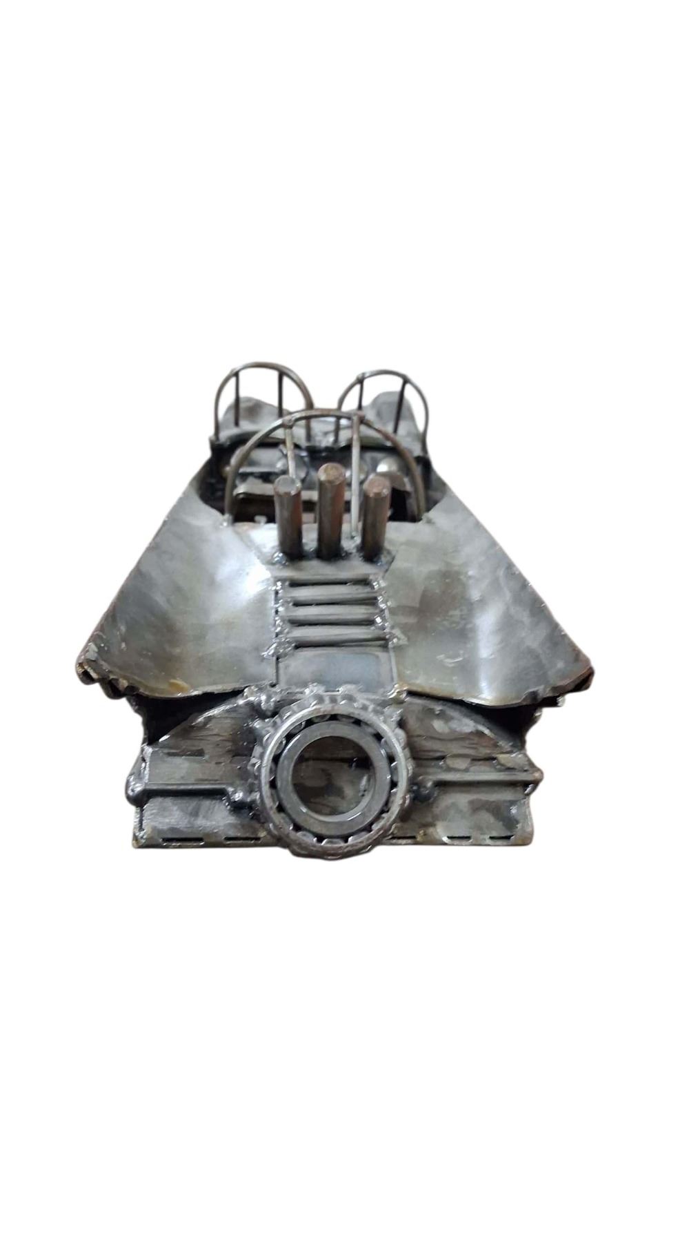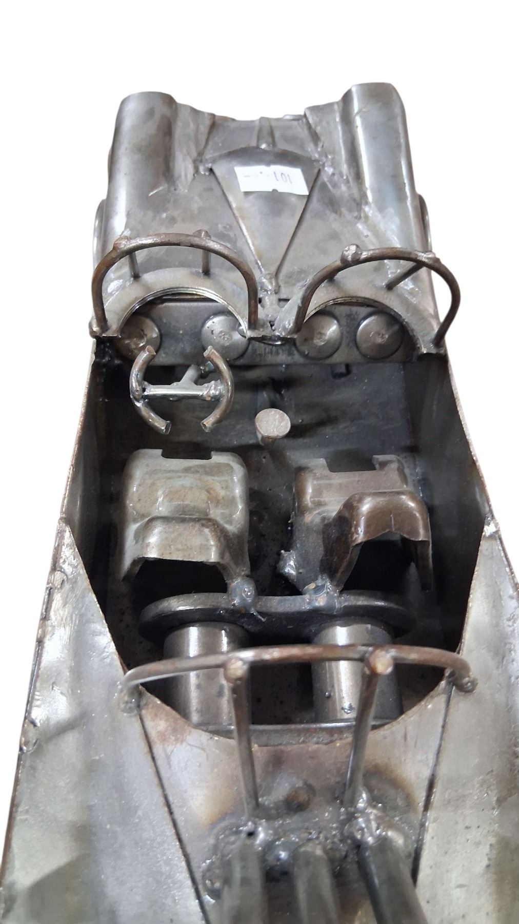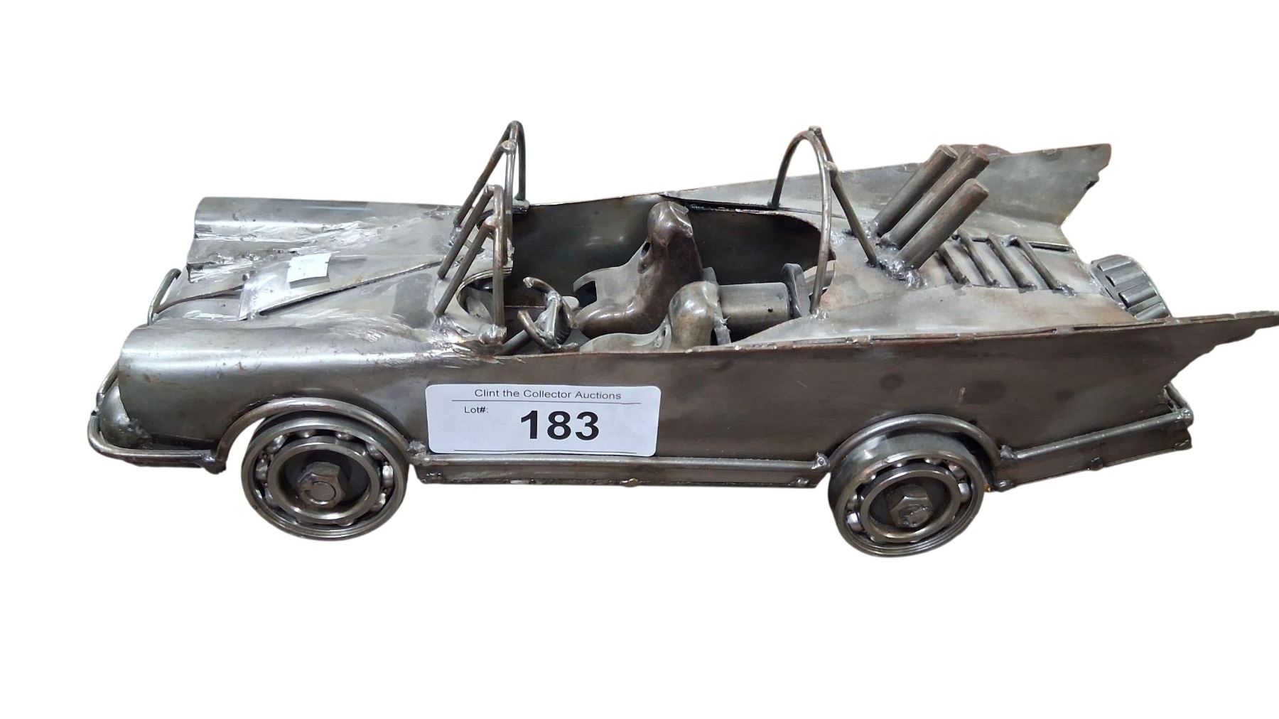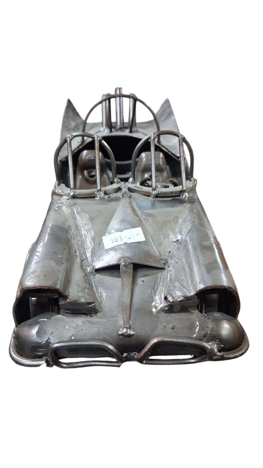 Folk art brutalist hand made metal Batmobile, heavy, 13" long