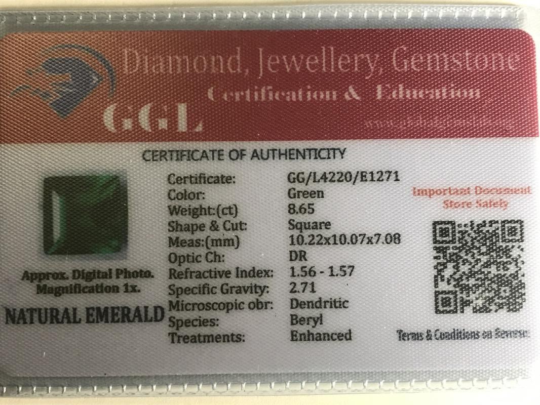 Forest Green Zambian Emerald 8.65 Cts - Certified .....Princess/Square Cut...size 10.22 x 10.07 MM; Treatment - Yes, Enhanced; Origin - Zambia