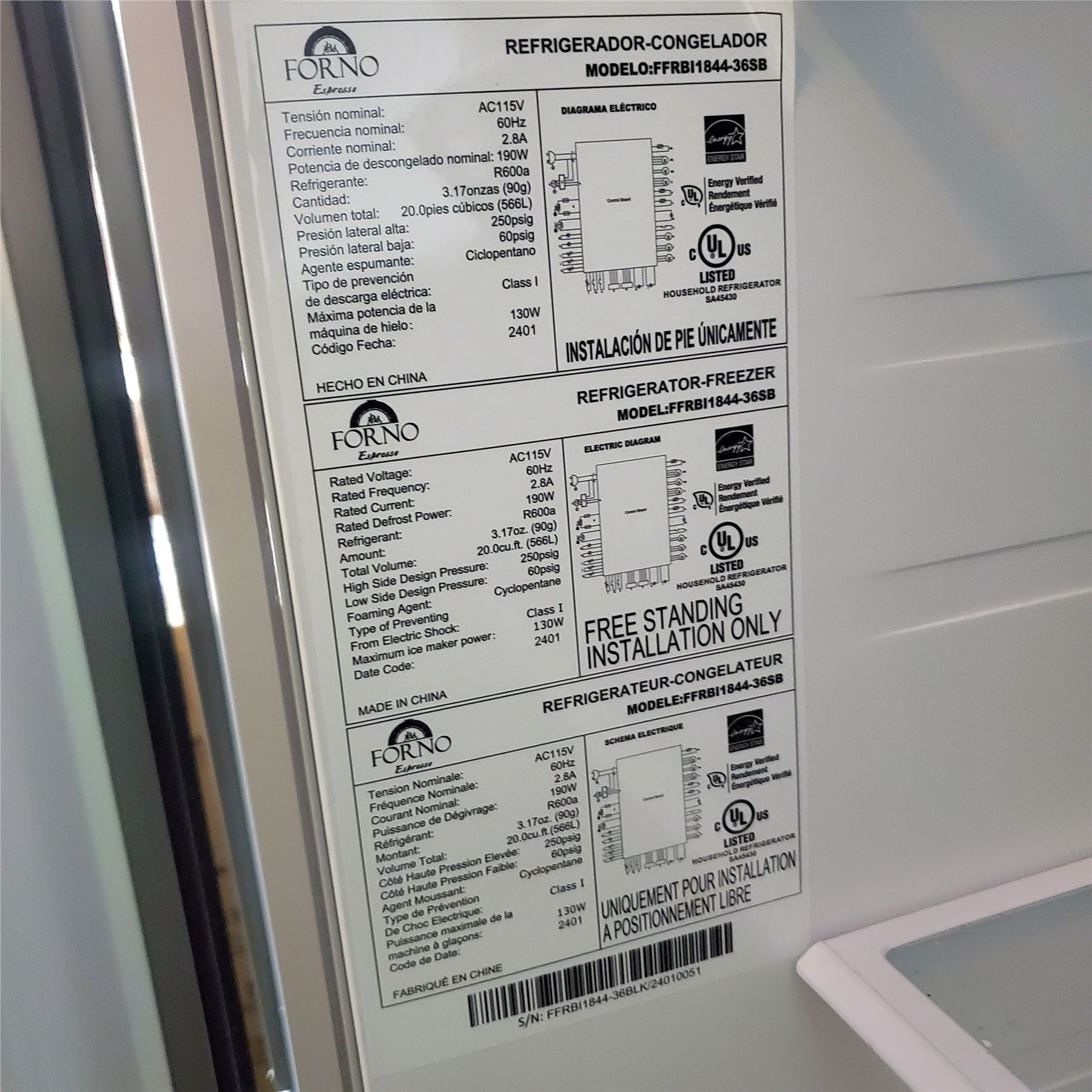 Forno 36" French Door Black Refrigerator w/ Ice Dispenser, Model FFRBI1844-36SB - Retail Value $1,599 (Working Condition - Dents around the Handles, doesn't affect operation)