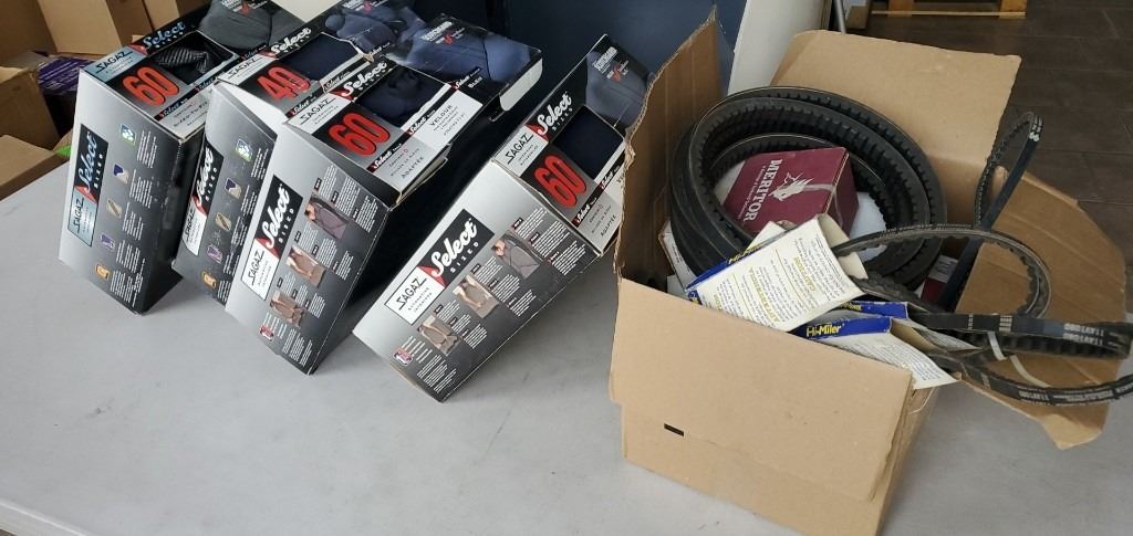 Four new scotchgard seat covers with automotive parts and belts