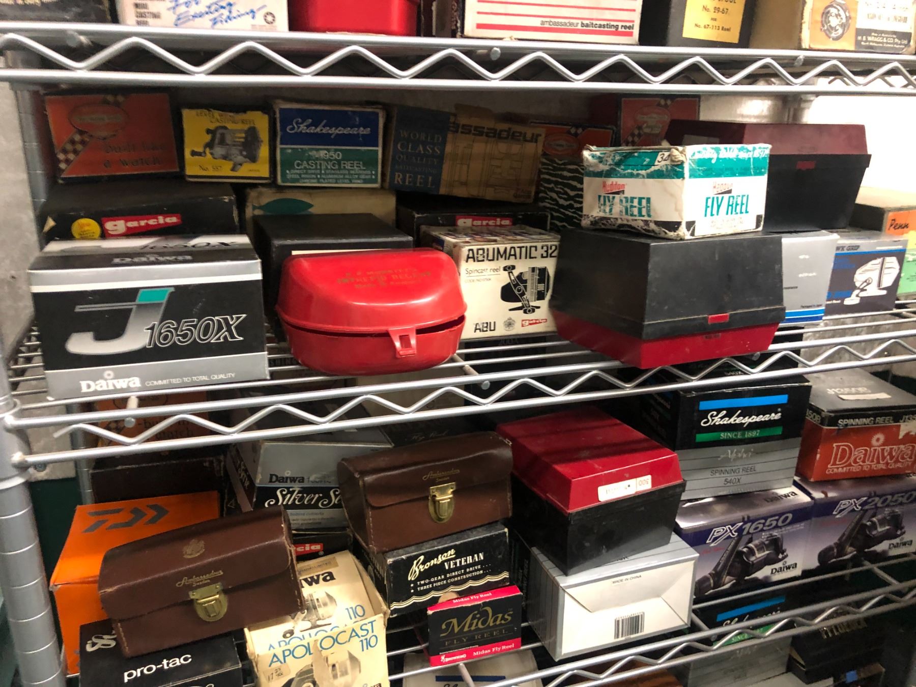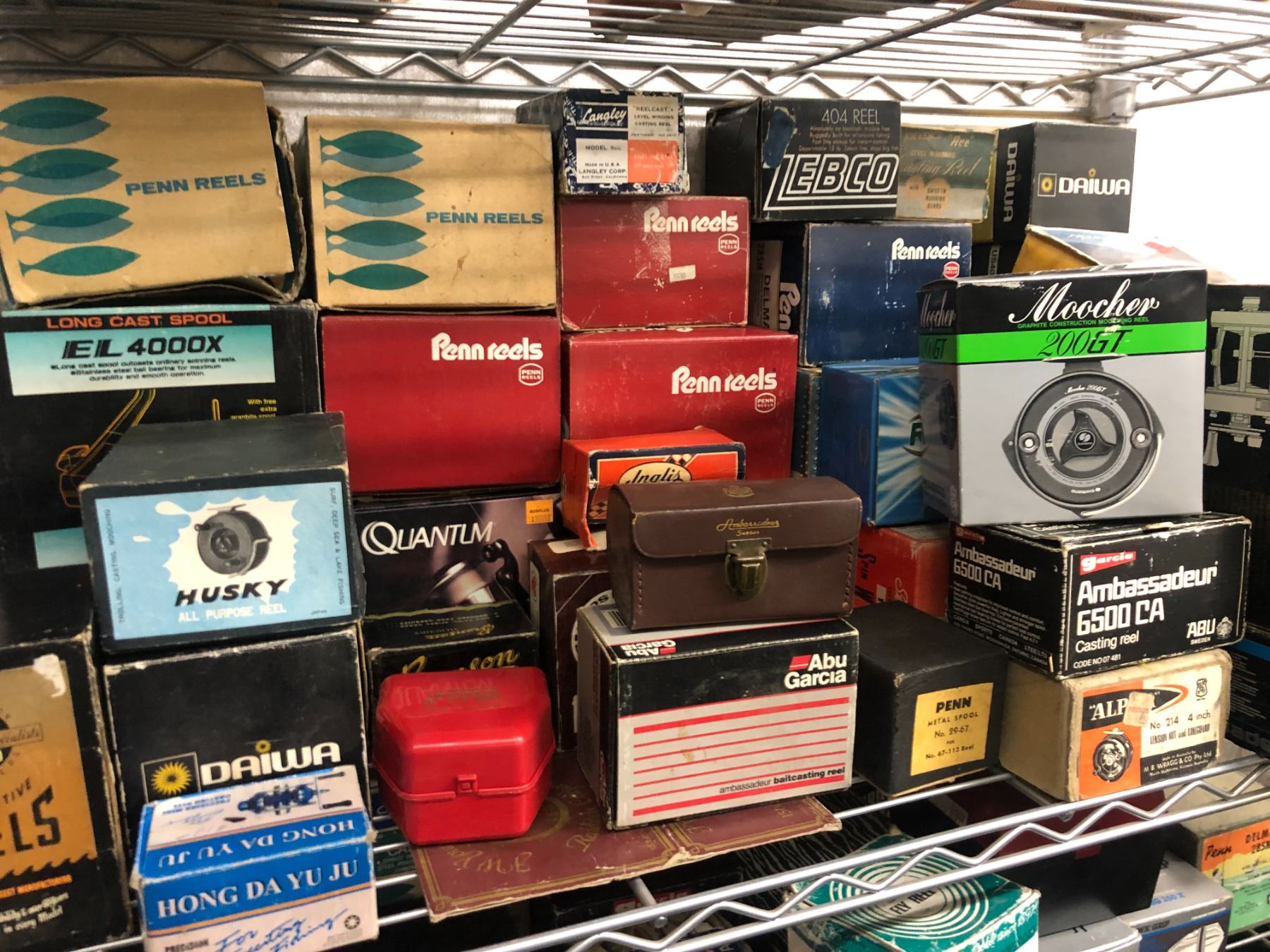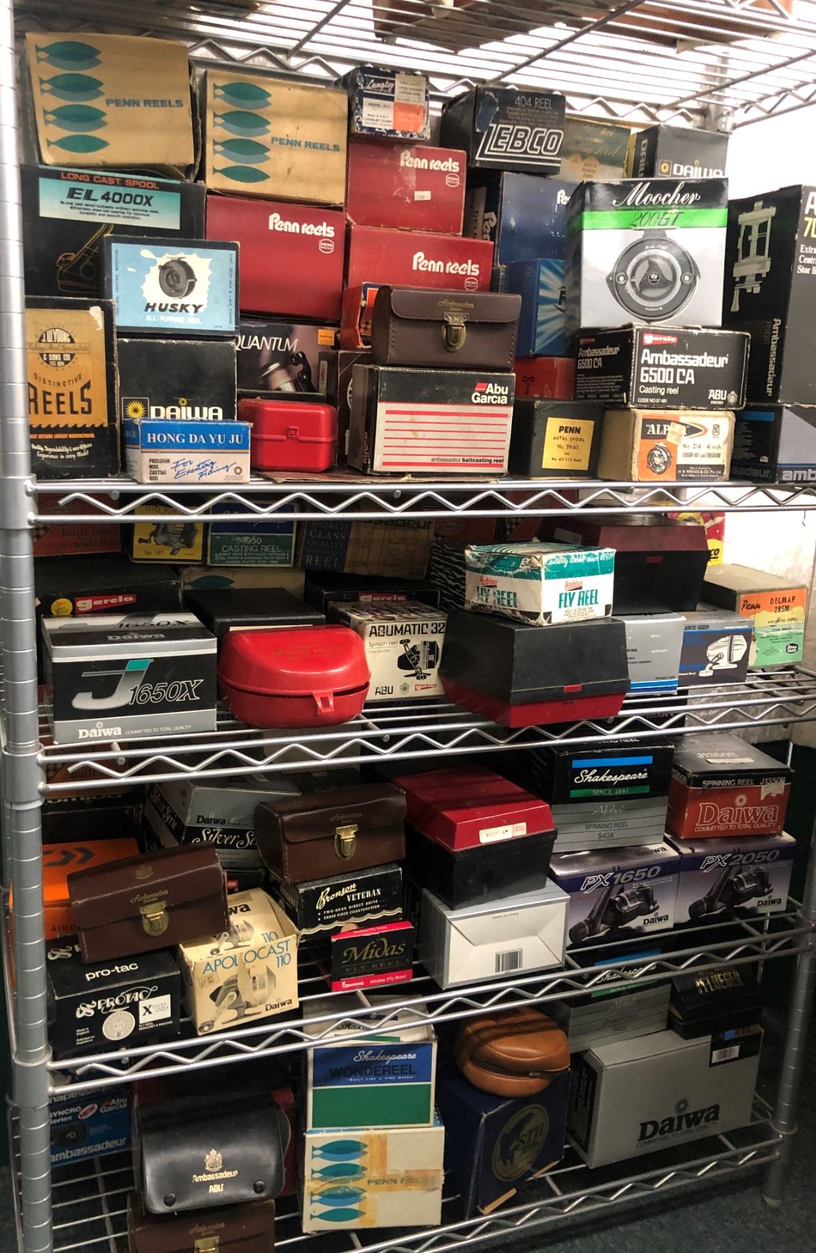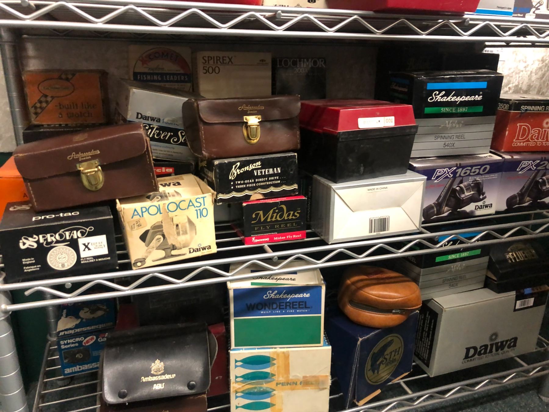 Four shelves of assorted antique/ vintage/ new fishing reel boxes only