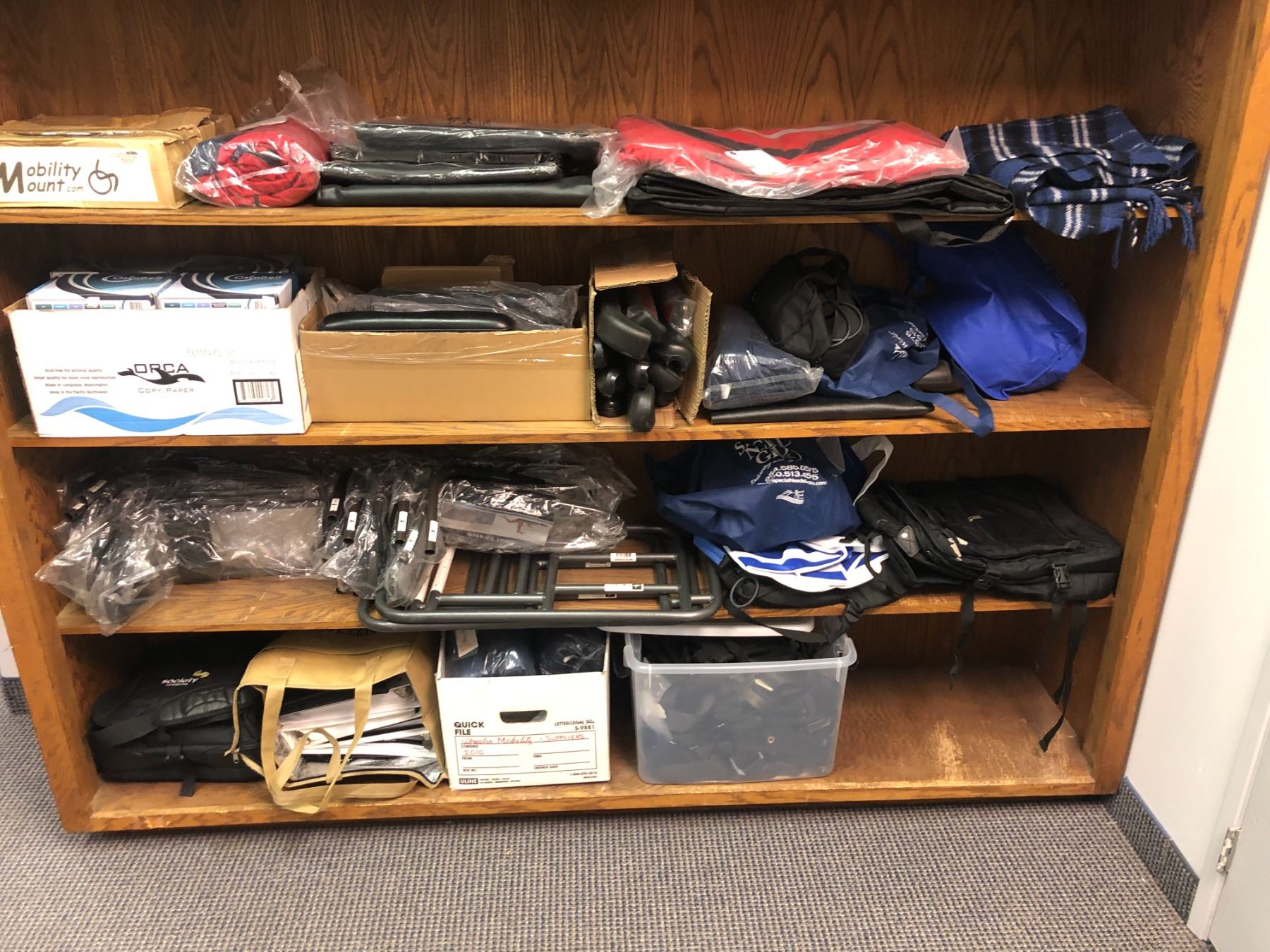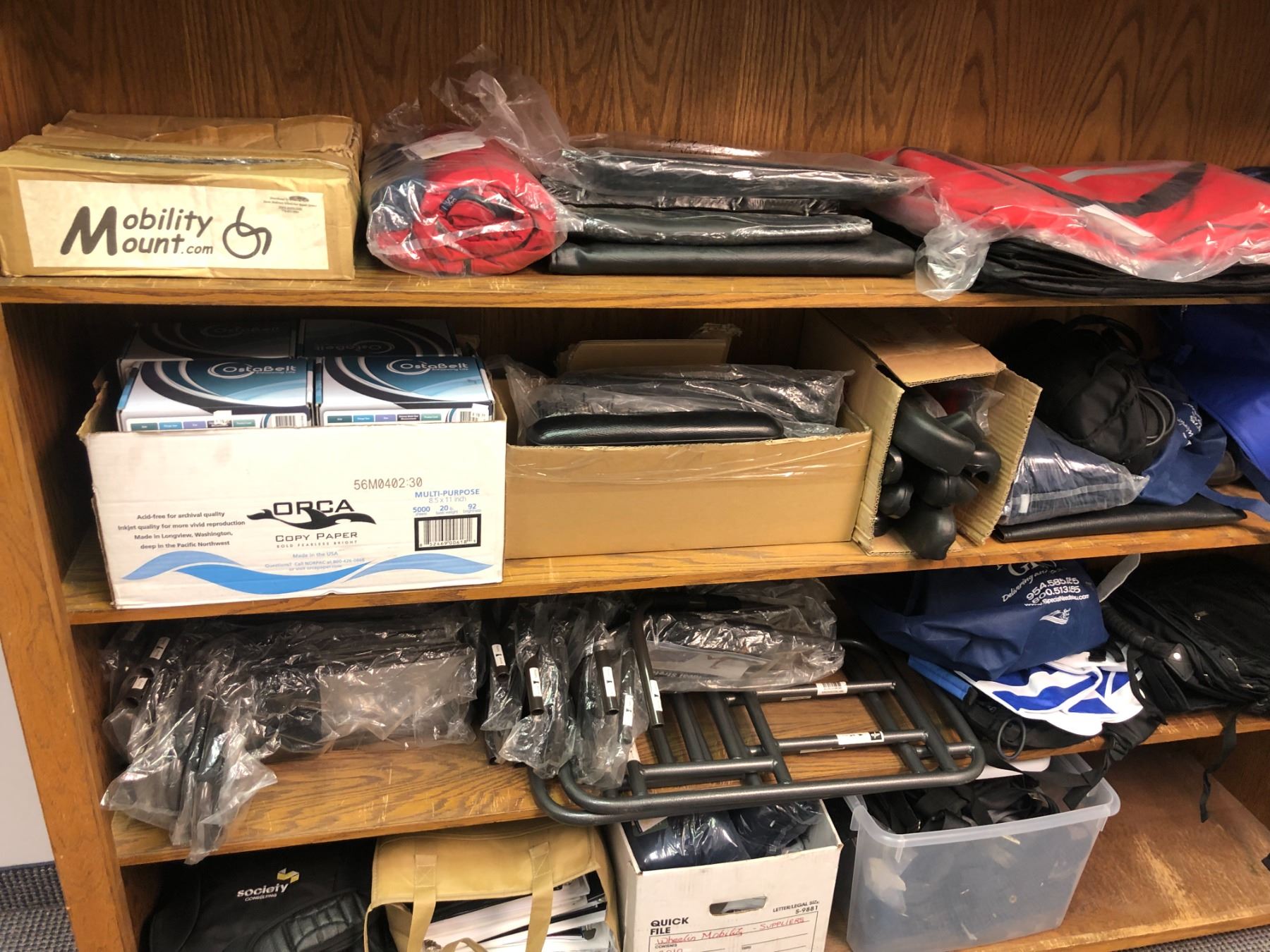 Four shelves of assorted medical assist mobility scooters & wheelchair parts & accessories