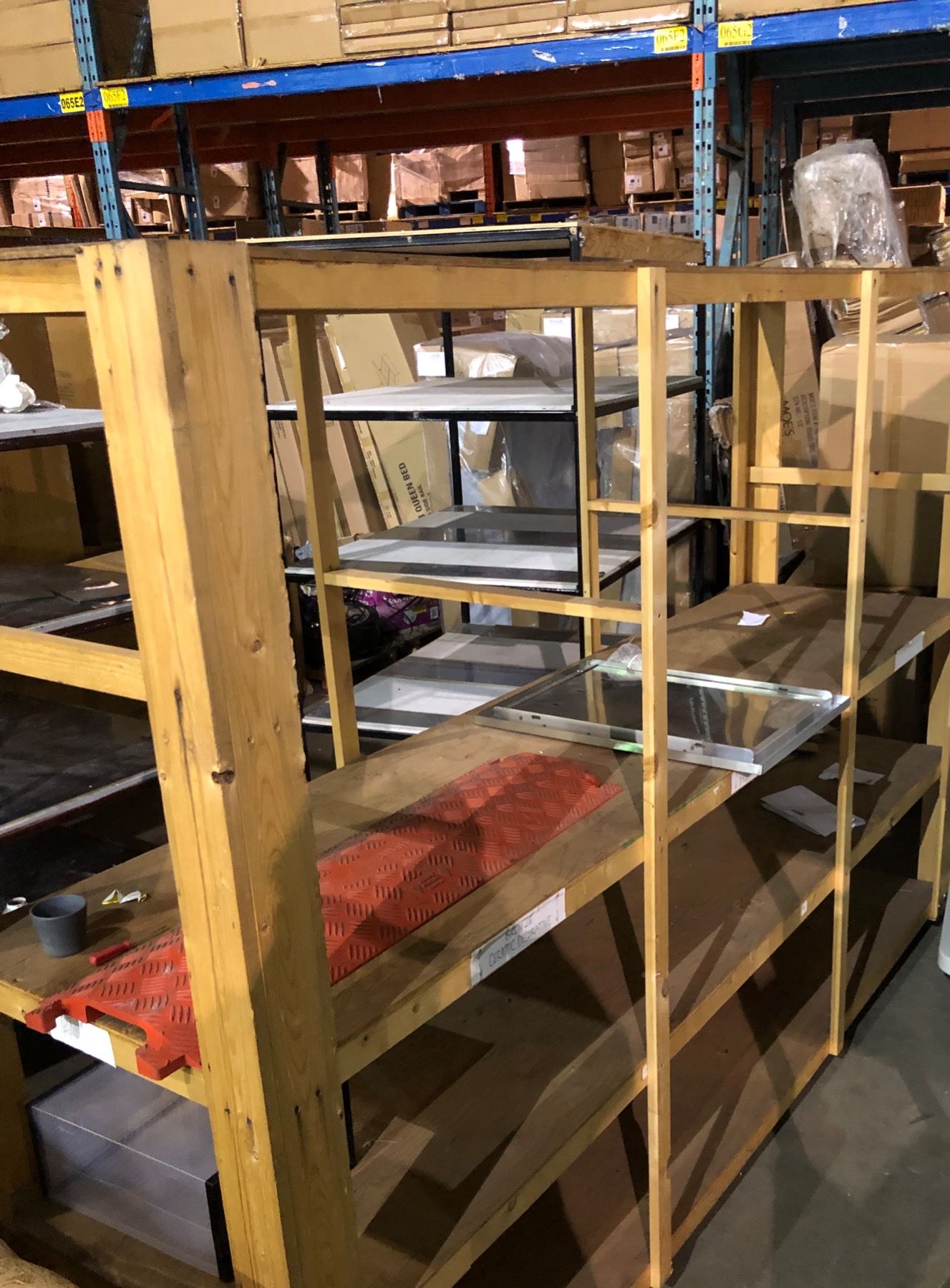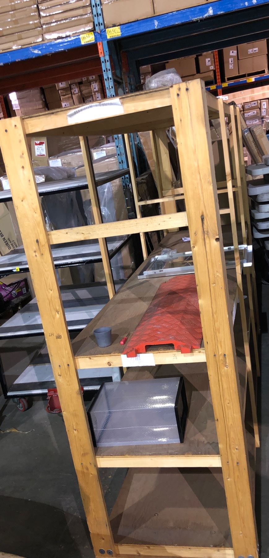 Four tier wooden rolling display shelf (Approximately 8ft Wide x 25 1/2in depth x 69 1/2in high)