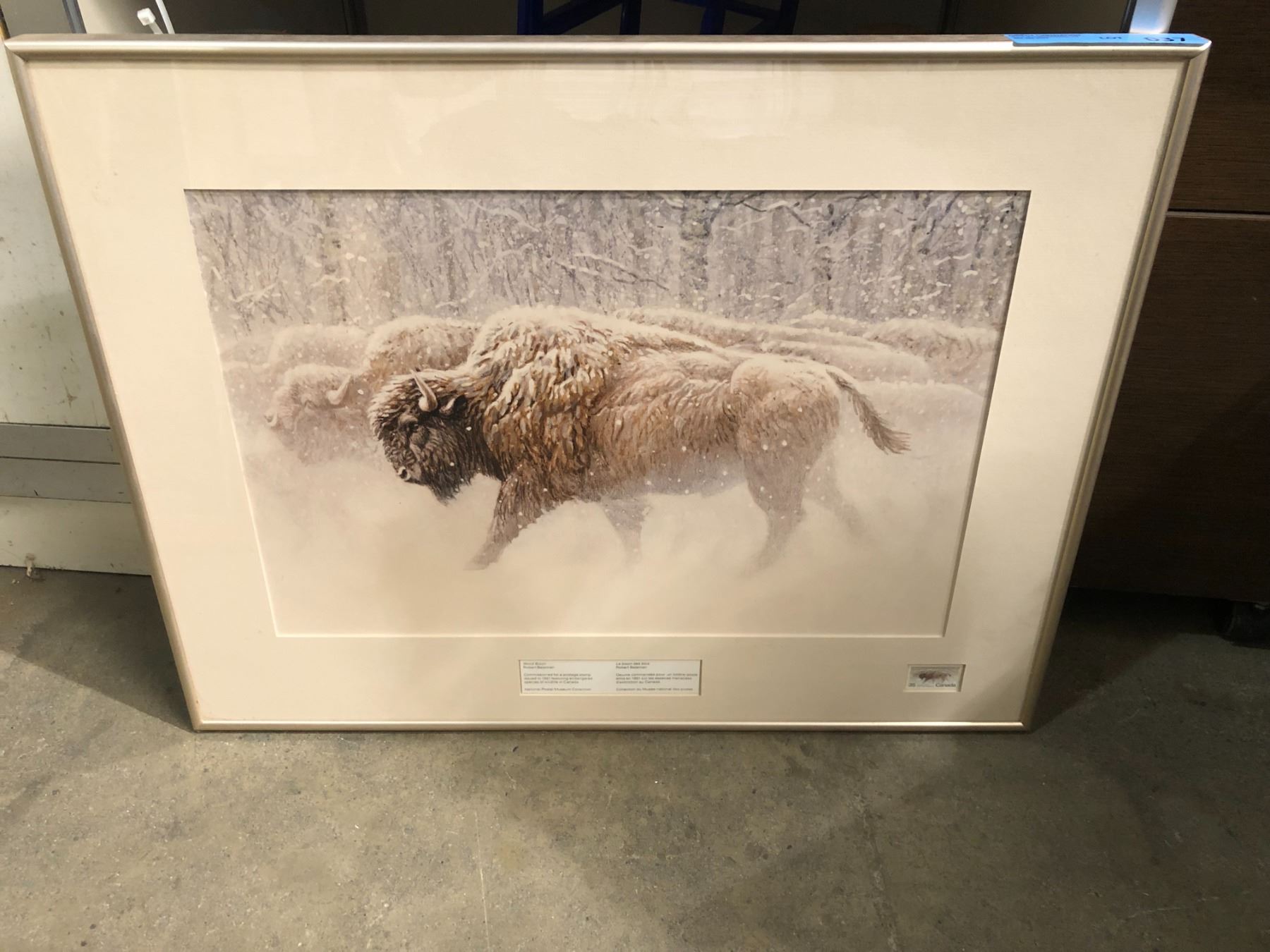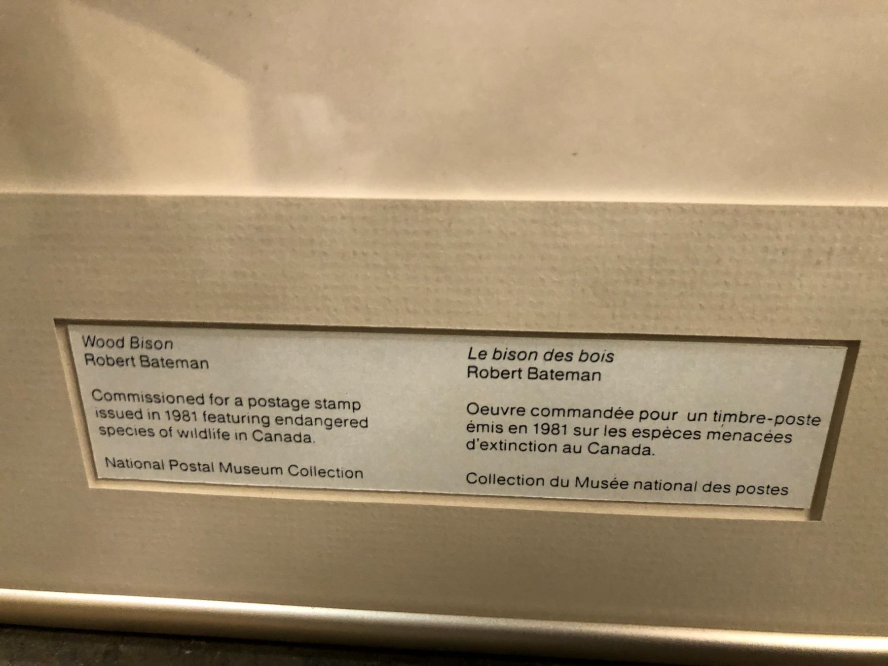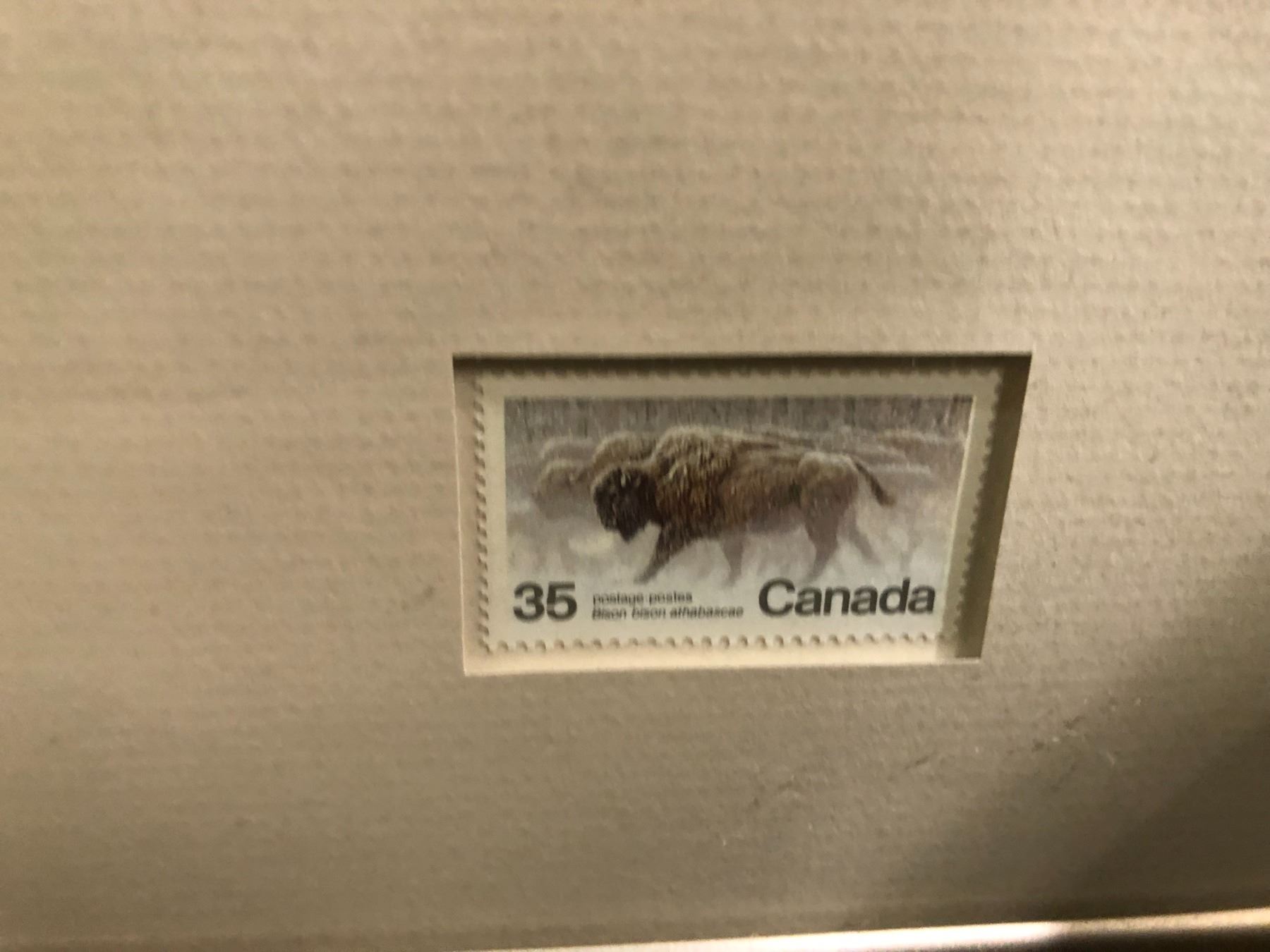 Framed Canada National Coastal museum collection "Wood Bison" by Robert Bateman collectors framed print & Canadian stamp - 25in x 18in