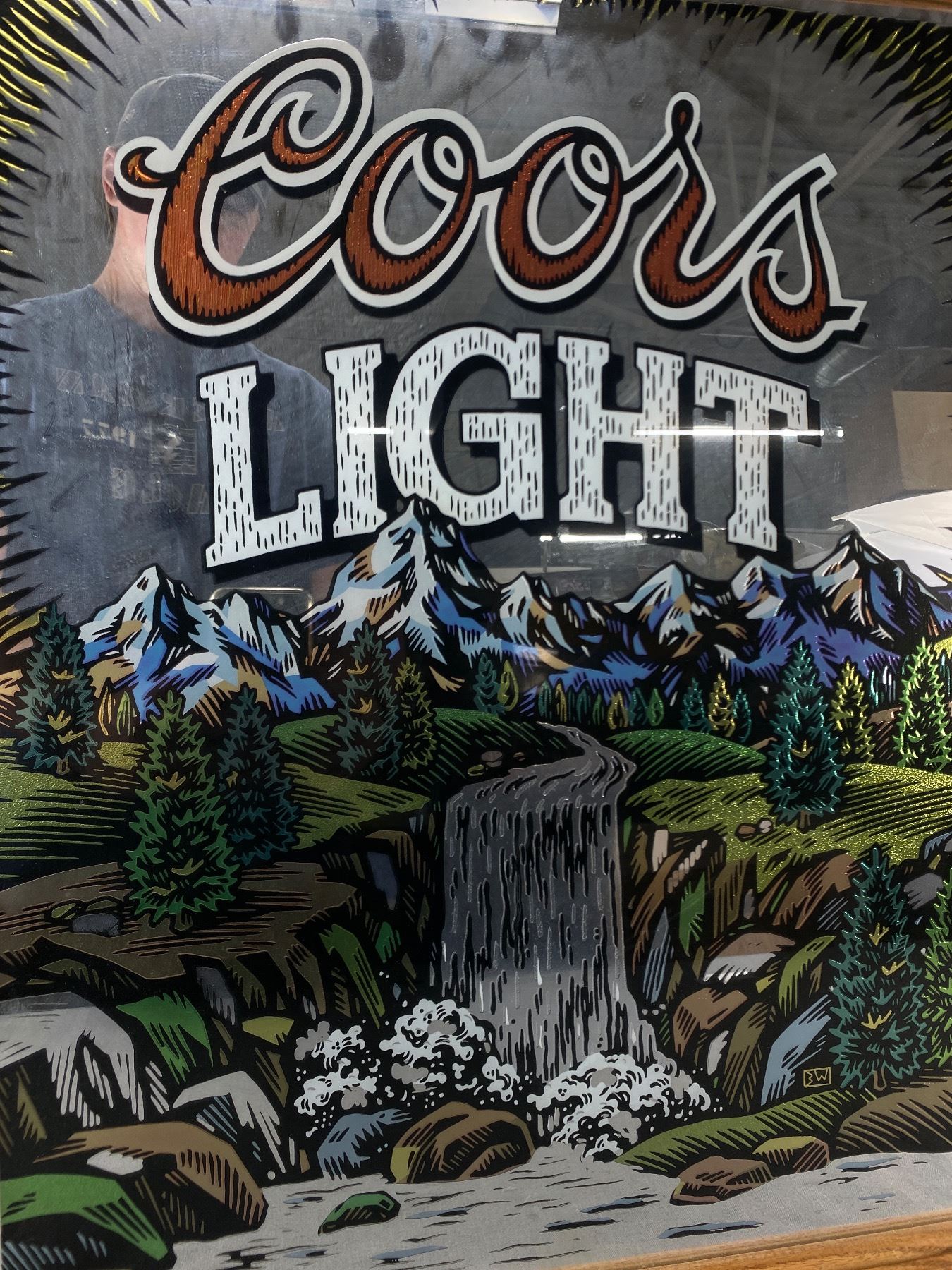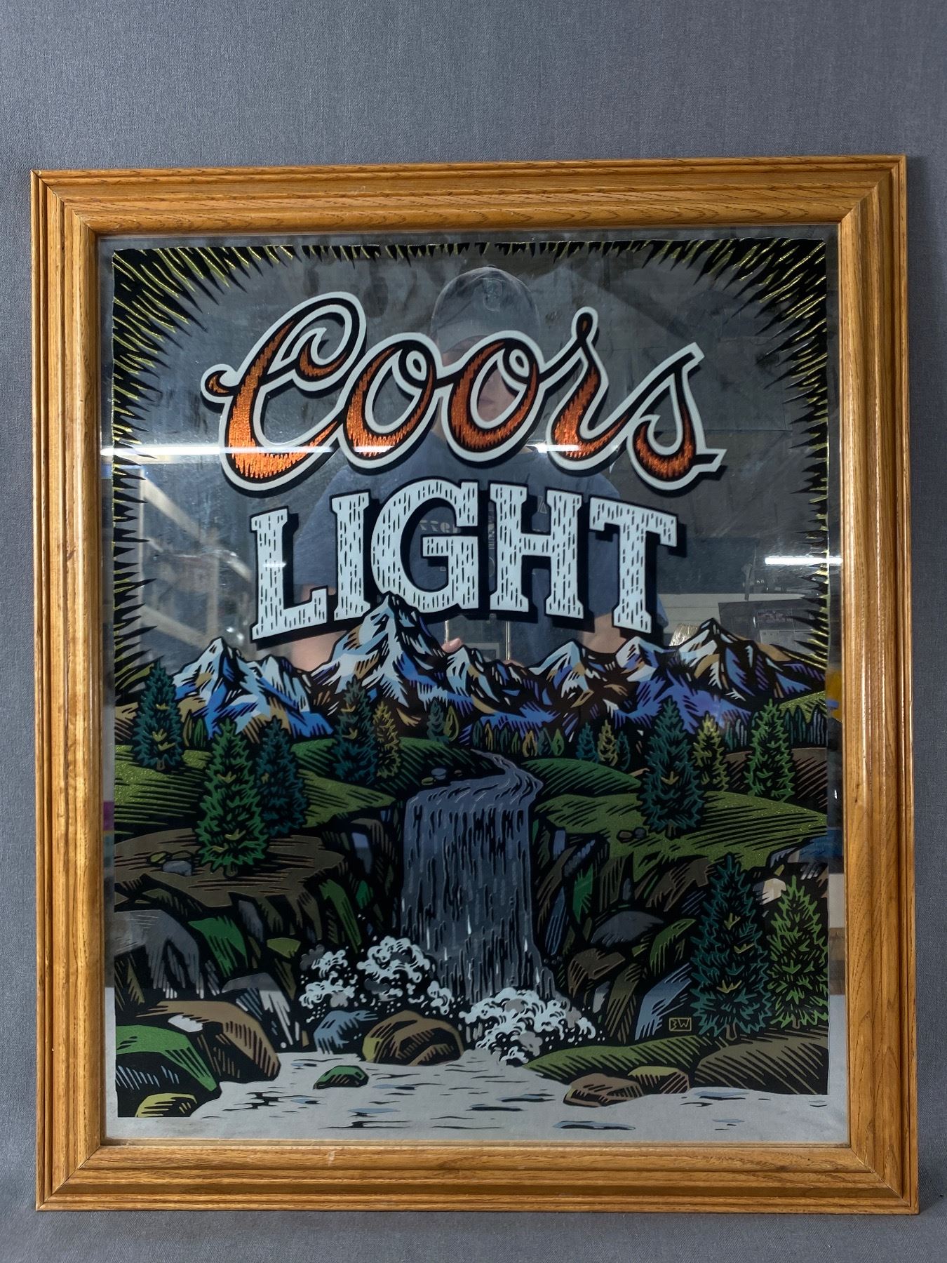 Framed Coors Light Mirrored Advertising Sign. NO SHIPPING. Approx. 21" x 25"
