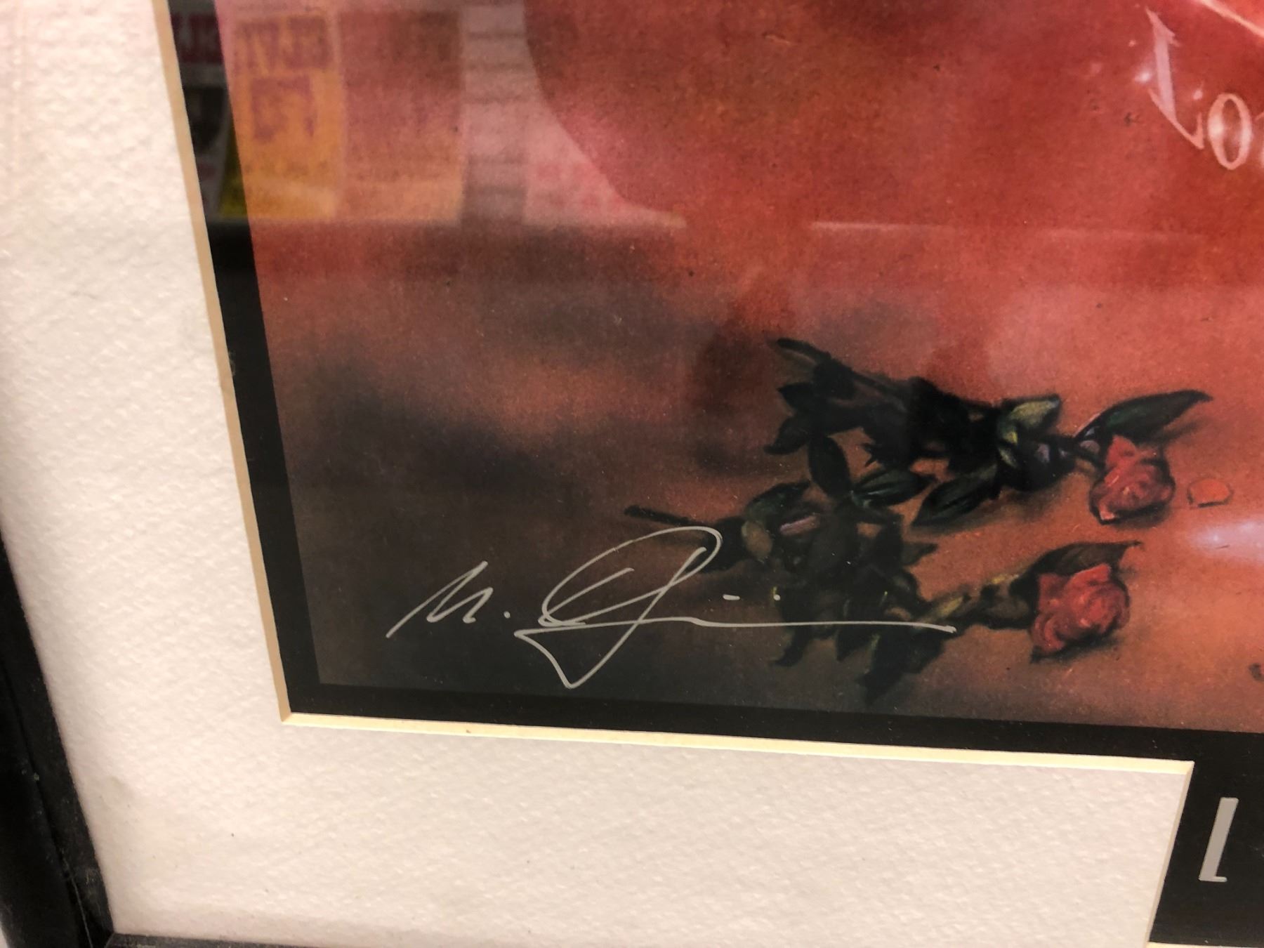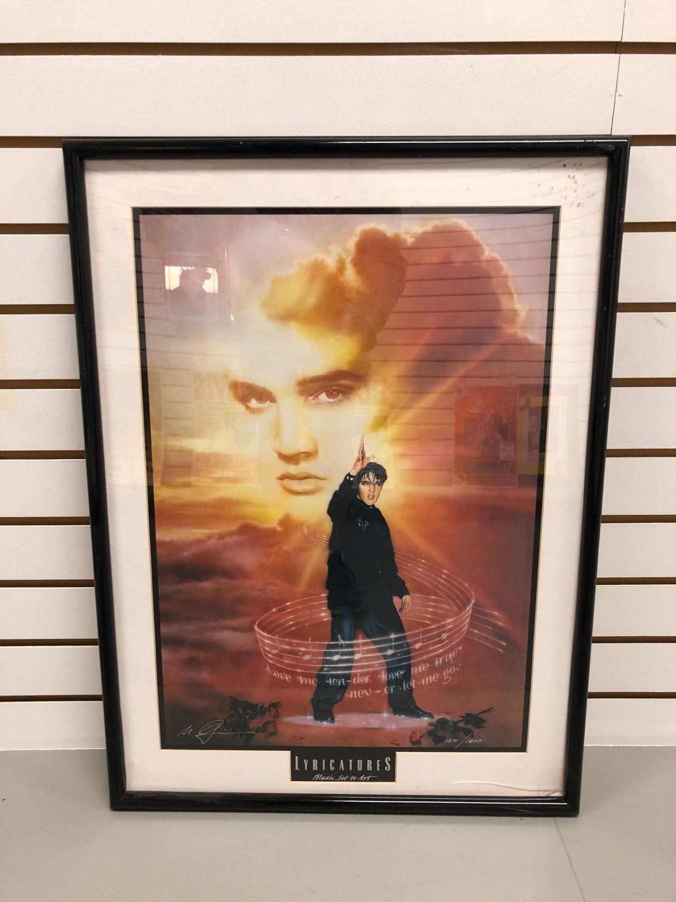 Framed Elvis Presley limited edition print Lyricatures "Music Set to Art" #1271/1977 signed by artist bottom left corner - approx. 27in x 20in (crack in frame & plexiglass)