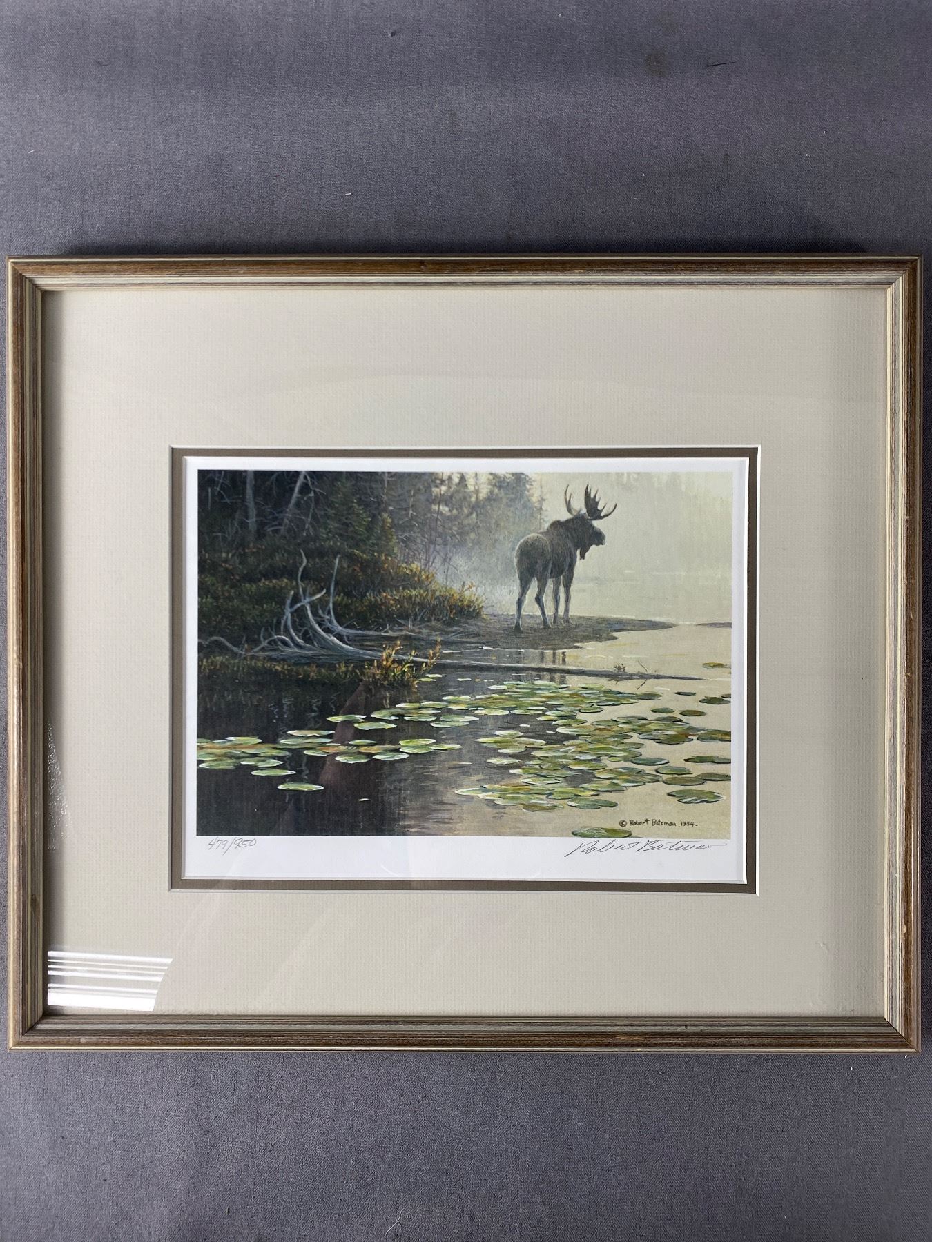 Framed Ltd Ed. 479/950 Robert Bateman "Moose At Water's Edge". Approx. 18" x 16"