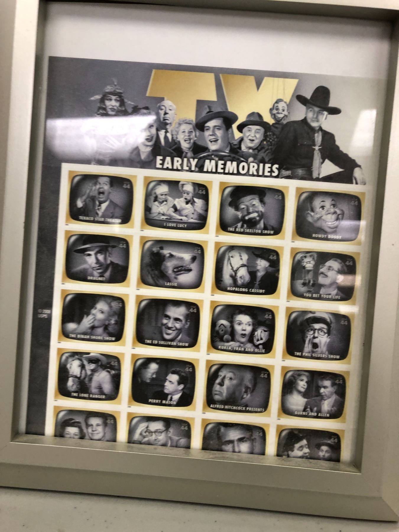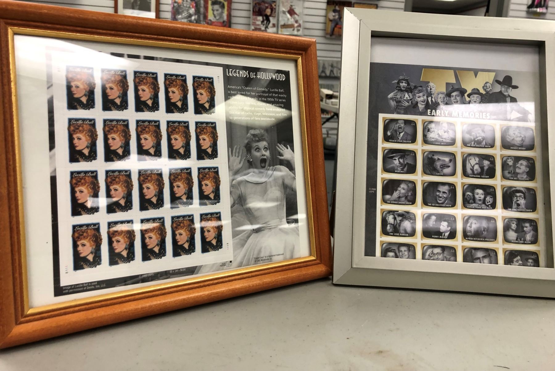 Framed Lucille Ball Legends of Hollywood full sheet of collector's stamps & Early TV Memories framed sheet of collector's stamps